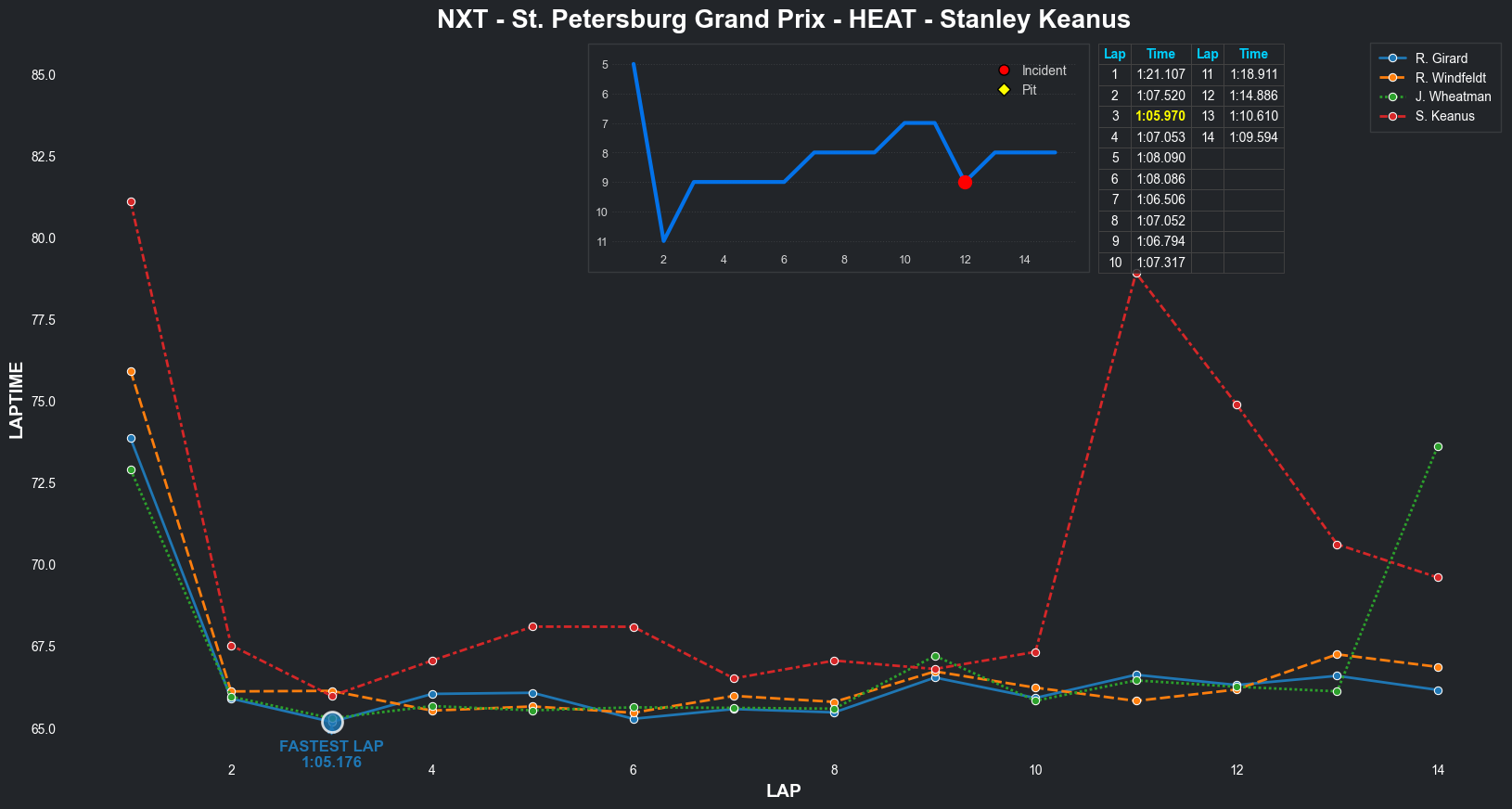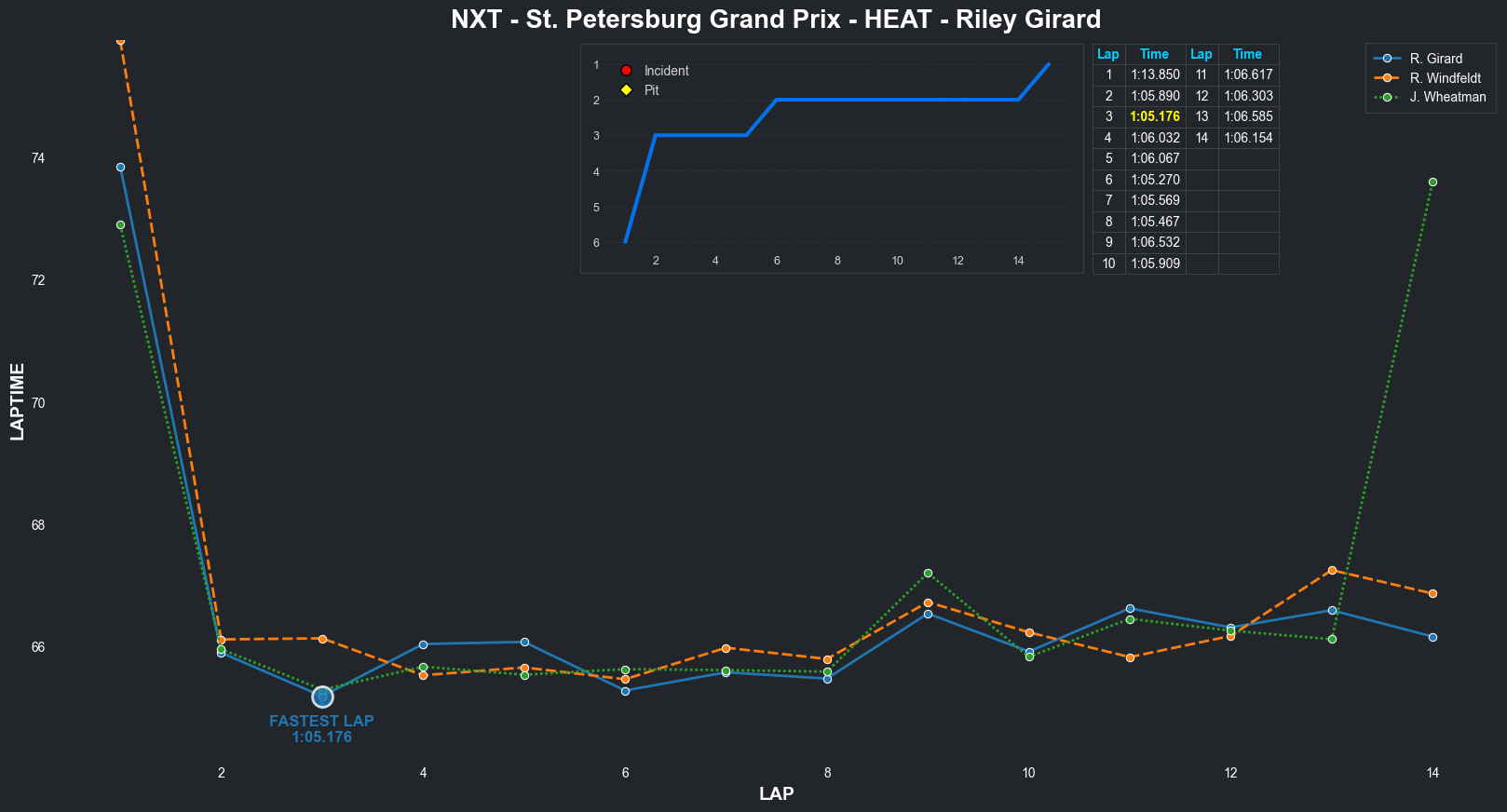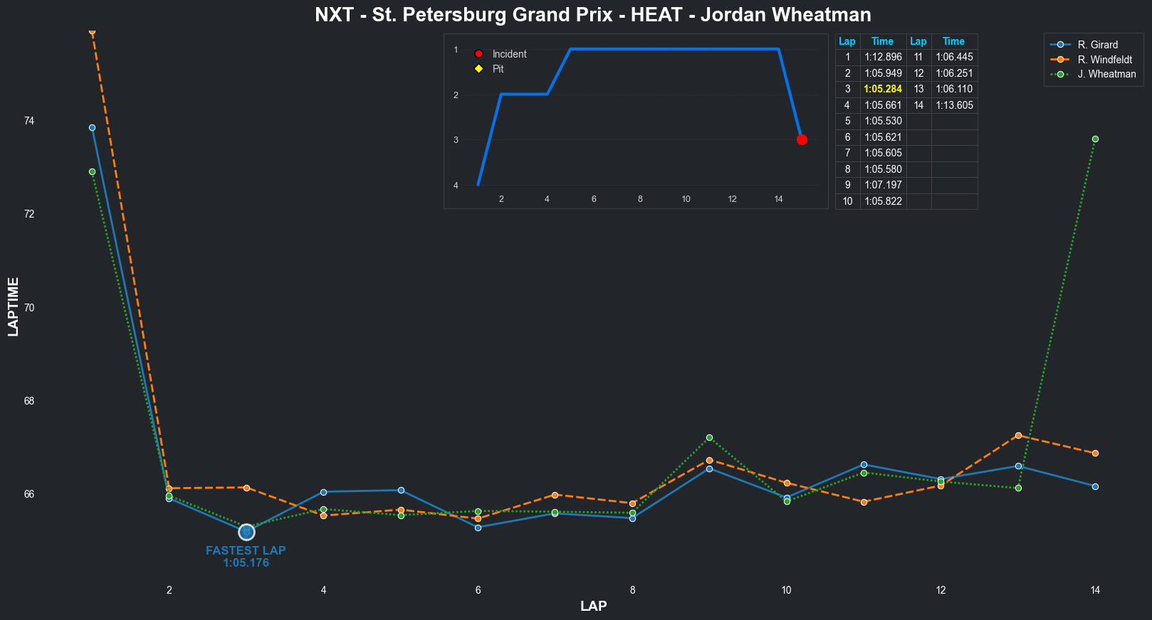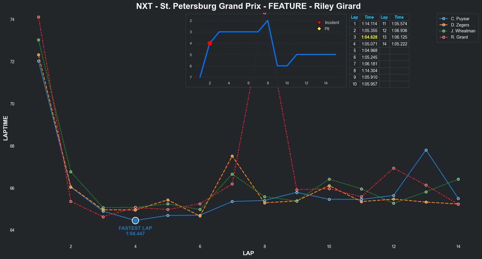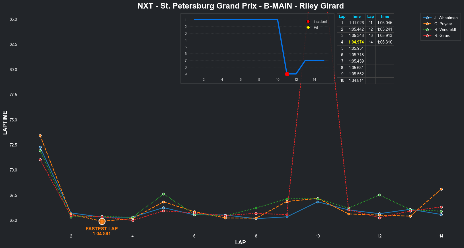 | Riley Girard | 1 | 4 | 1:13.8505 | 1:05.8899 | 1:05.1757 | 1:06.0320 | 1:06.0665 | 1:05.2704 | 1:05.5687 | 1:05.4667 | 1:06.5322 | 1:05.9088 | 1:06.6171 | 1:06.3029 | 1:06.5853 | 1:06.1540 | 0 | 14 |