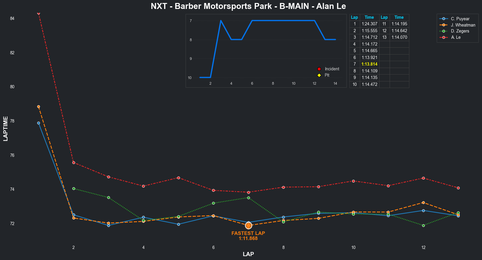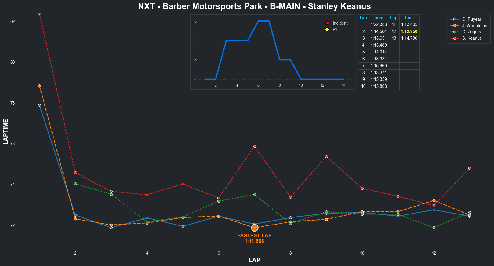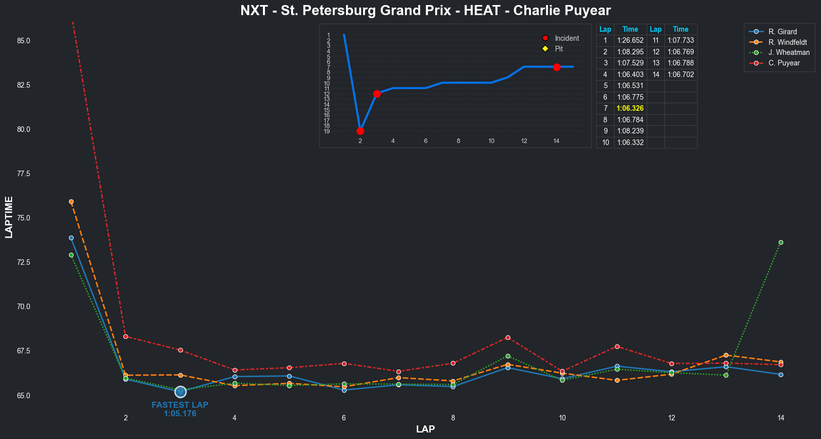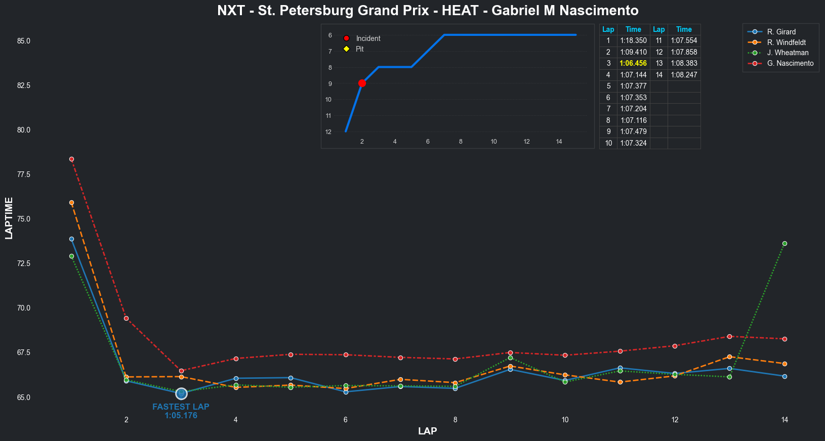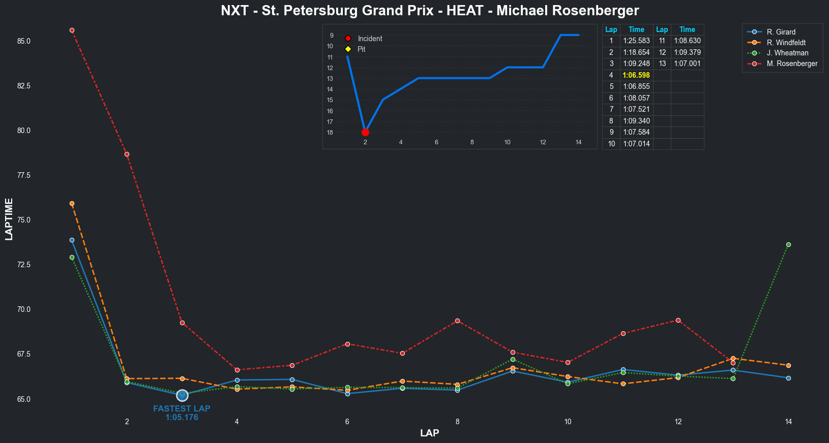 | Riley Girard | 1 | 4 | 1:13.8505 | 1:05.8899 | 1:05.1757 | 1:06.0320 | 1:06.0665 | 1:05.2704 | 1:05.5687 | 1:05.4667 | 1:06.5322 | 1:05.9088 | 1:06.6171 | 1:06.3029 | 1:06.5853 | 1:06.1540 | 0 | 14 |