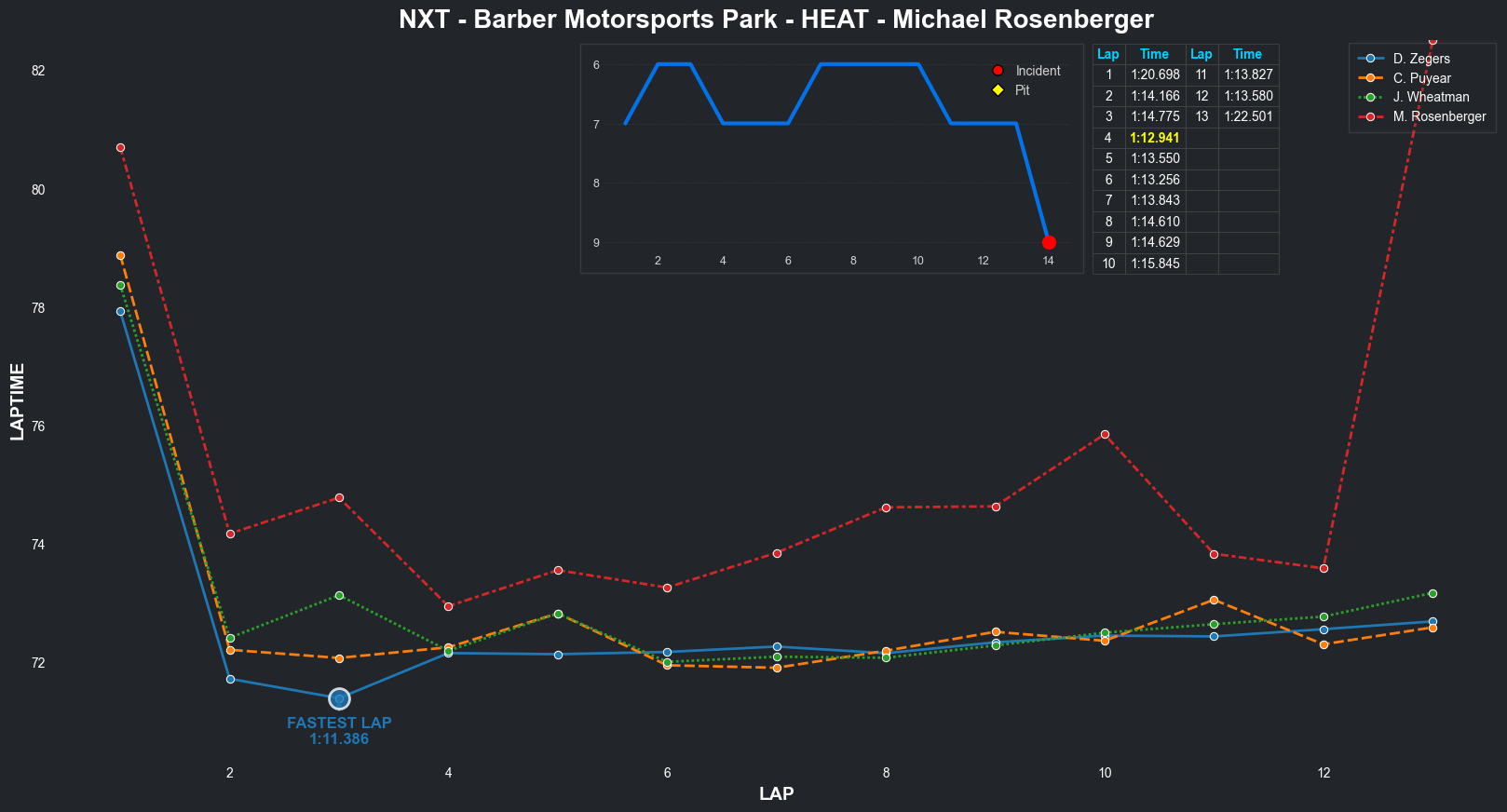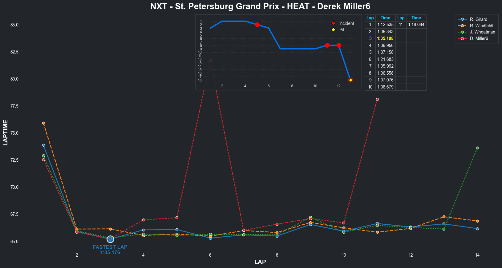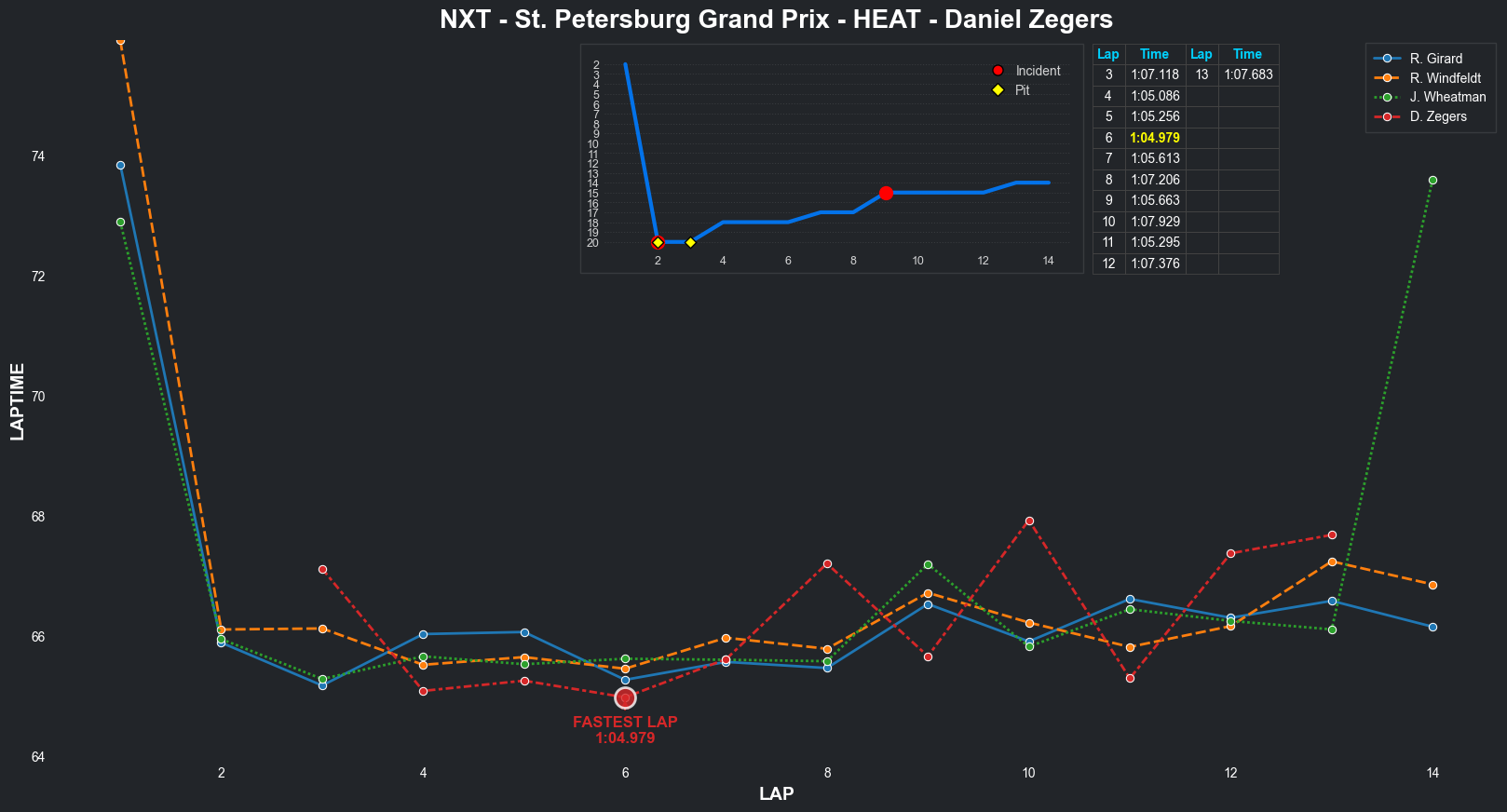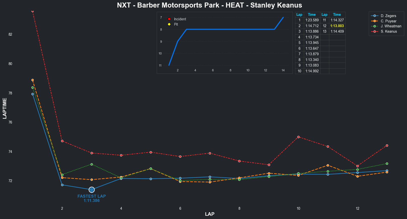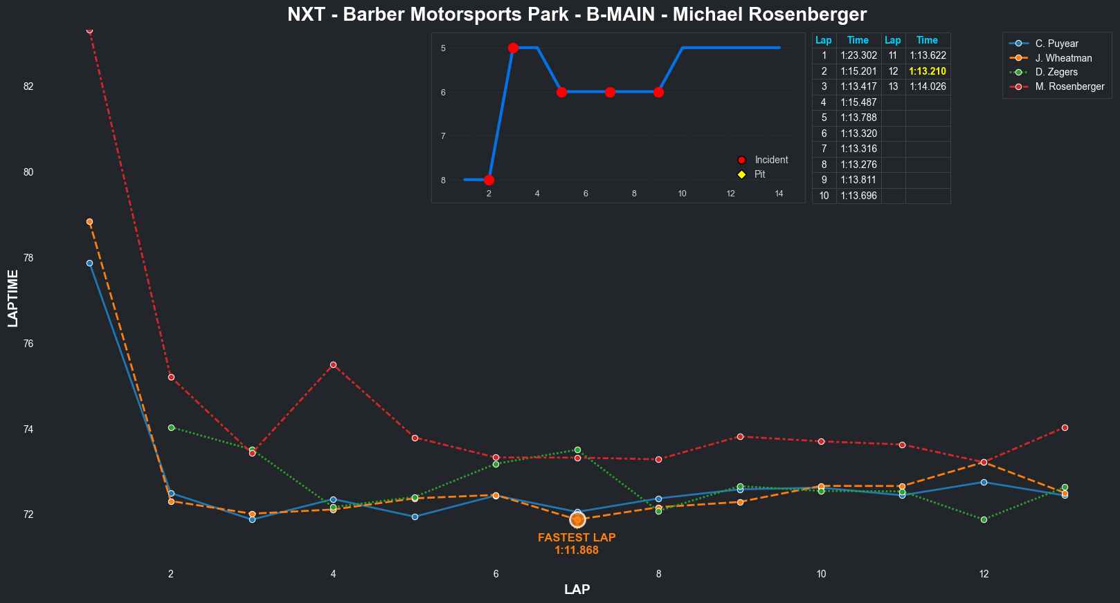 | Riley Girard | 1 | 4 | 1:13.8505 | 1:05.8899 | 1:05.1757 | 1:06.0320 | 1:06.0665 | 1:05.2704 | 1:05.5687 | 1:05.4667 | 1:06.5322 | 1:05.9088 | 1:06.6171 | 1:06.3029 | 1:06.5853 | 1:06.1540 | 0 | 14 |