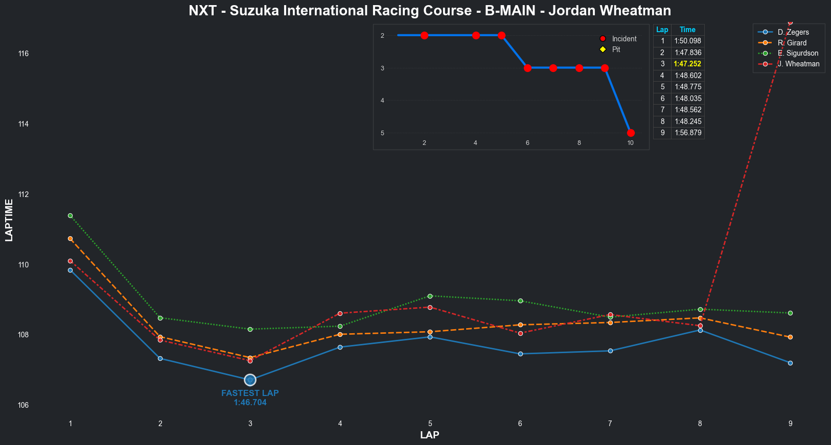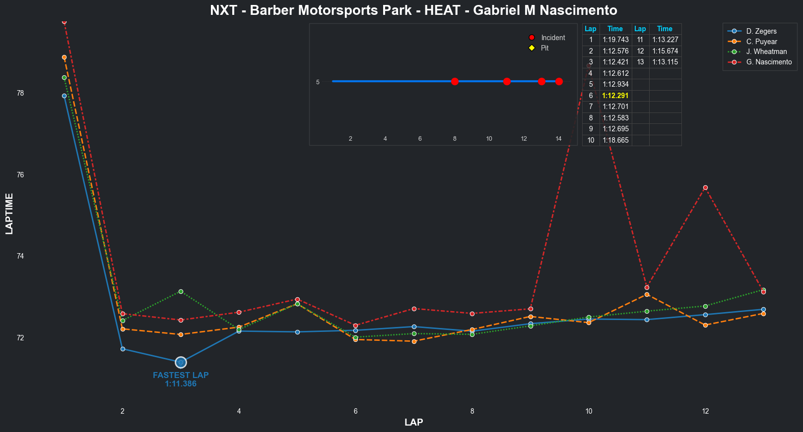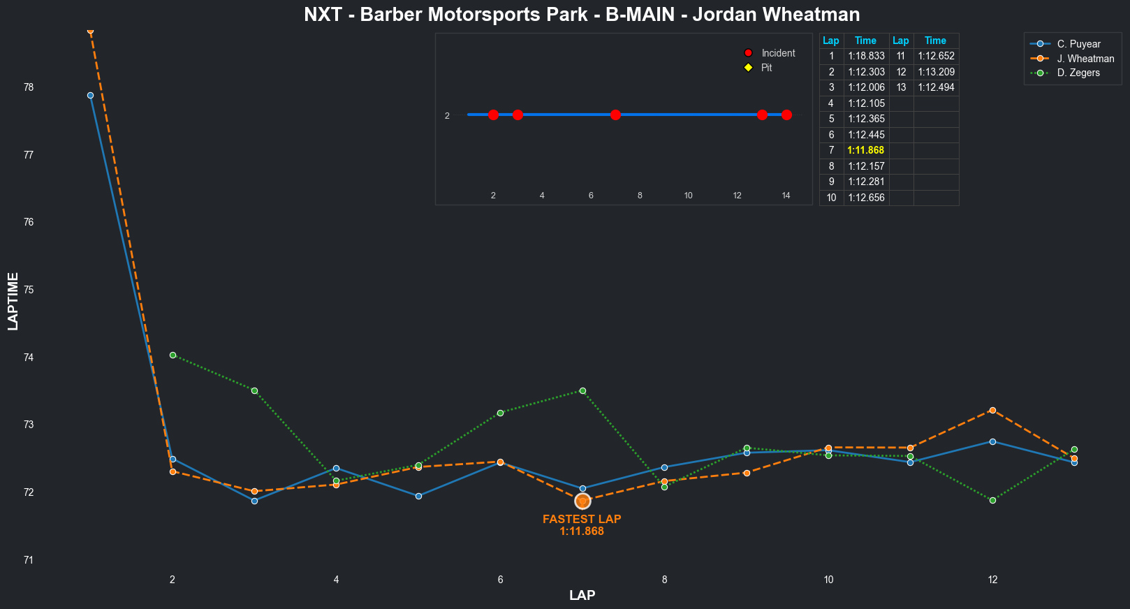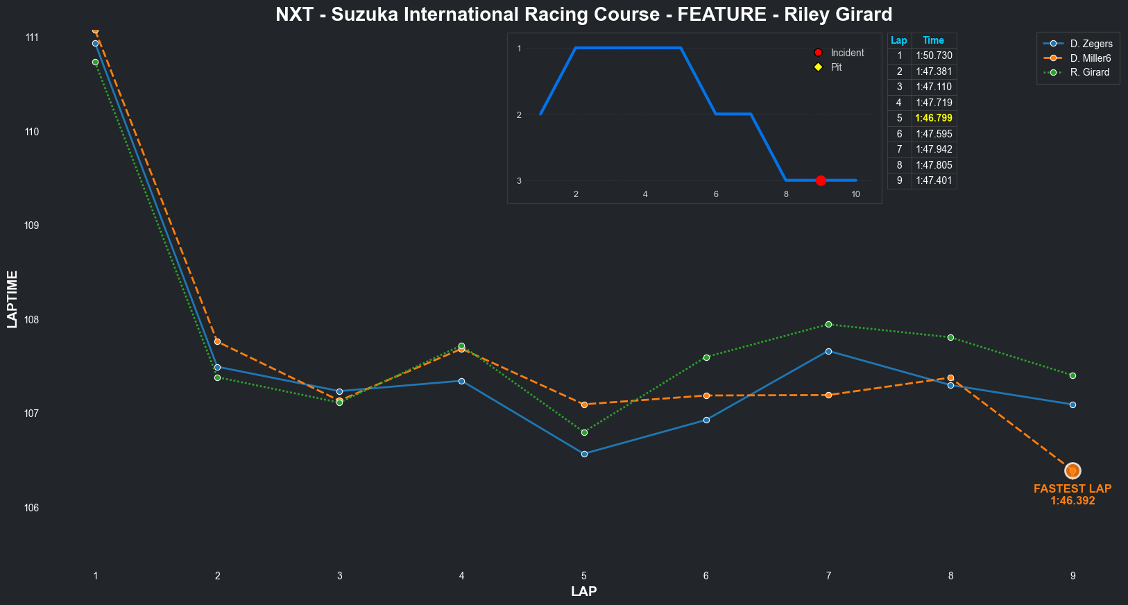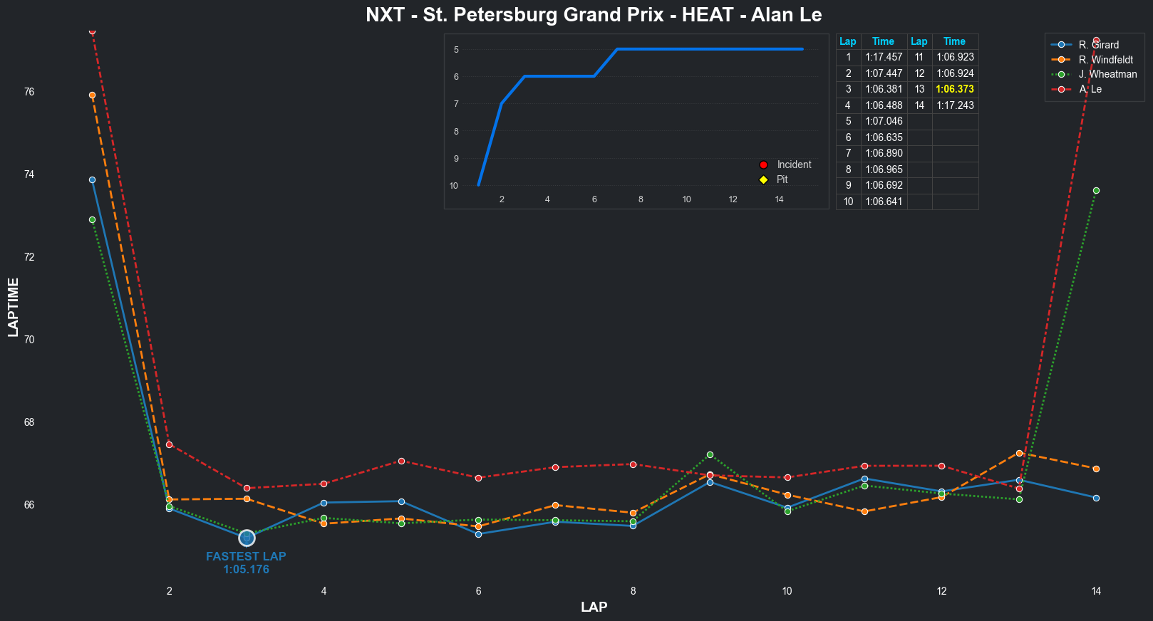 | Riley Girard | 1 | 4 | 1:13.8505 | 1:05.8899 | 1:05.1757 | 1:06.0320 | 1:06.0665 | 1:05.2704 | 1:05.5687 | 1:05.4667 | 1:06.5322 | 1:05.9088 | 1:06.6171 | 1:06.3029 | 1:06.5853 | 1:06.1540 | 0 | 14 |