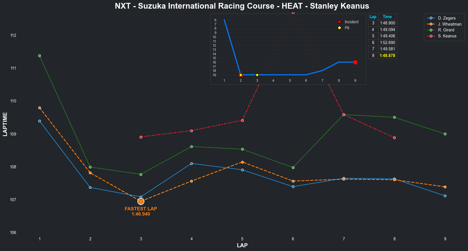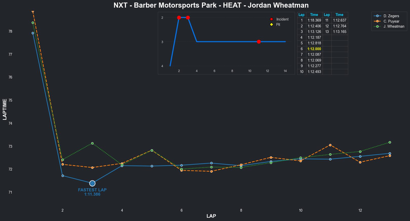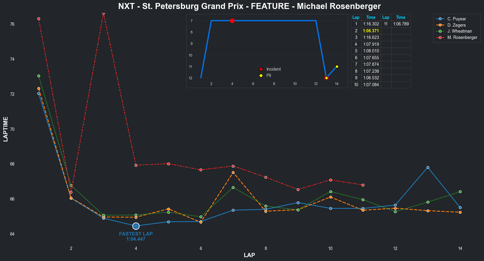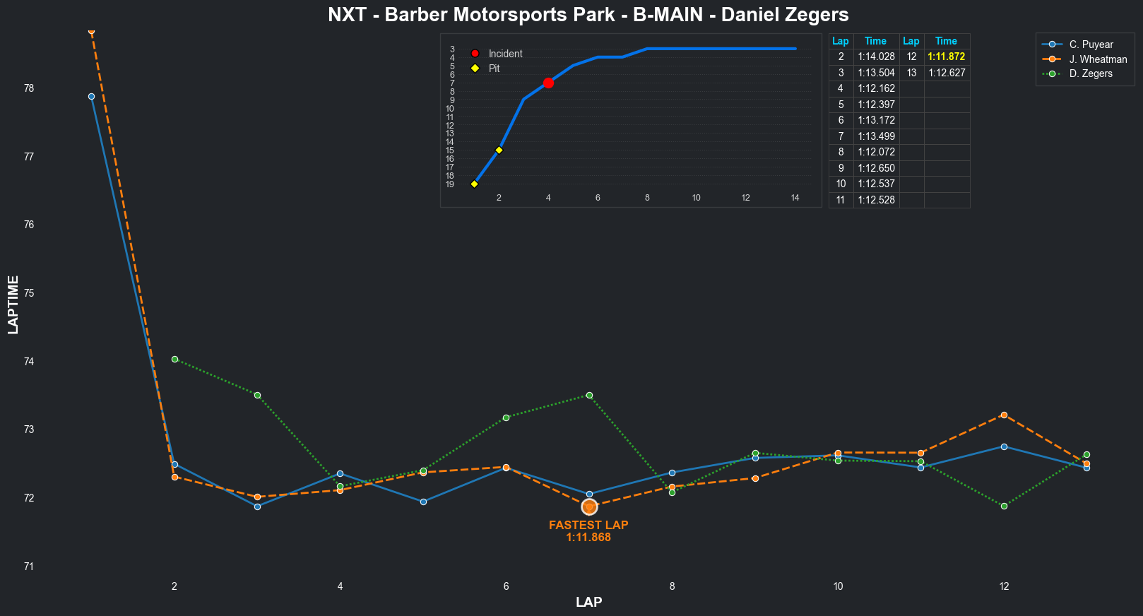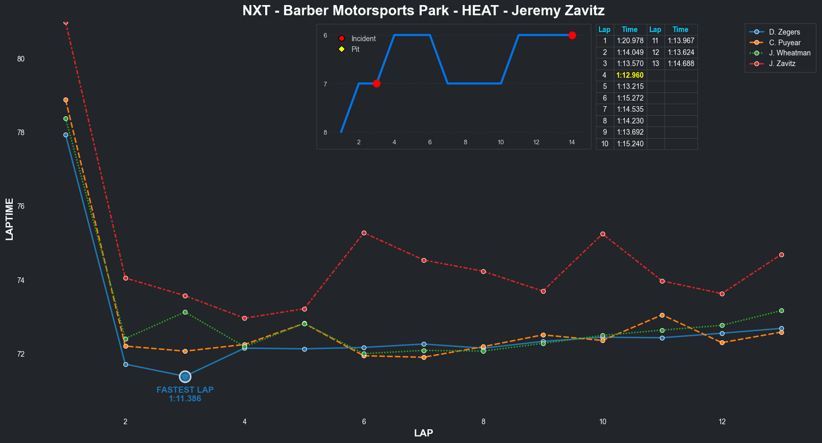 | Riley Girard | 1 | 4 | 1:13.8505 | 1:05.8899 | 1:05.1757 | 1:06.0320 | 1:06.0665 | 1:05.2704 | 1:05.5687 | 1:05.4667 | 1:06.5322 | 1:05.9088 | 1:06.6171 | 1:06.3029 | 1:06.5853 | 1:06.1540 | 0 | 14 |