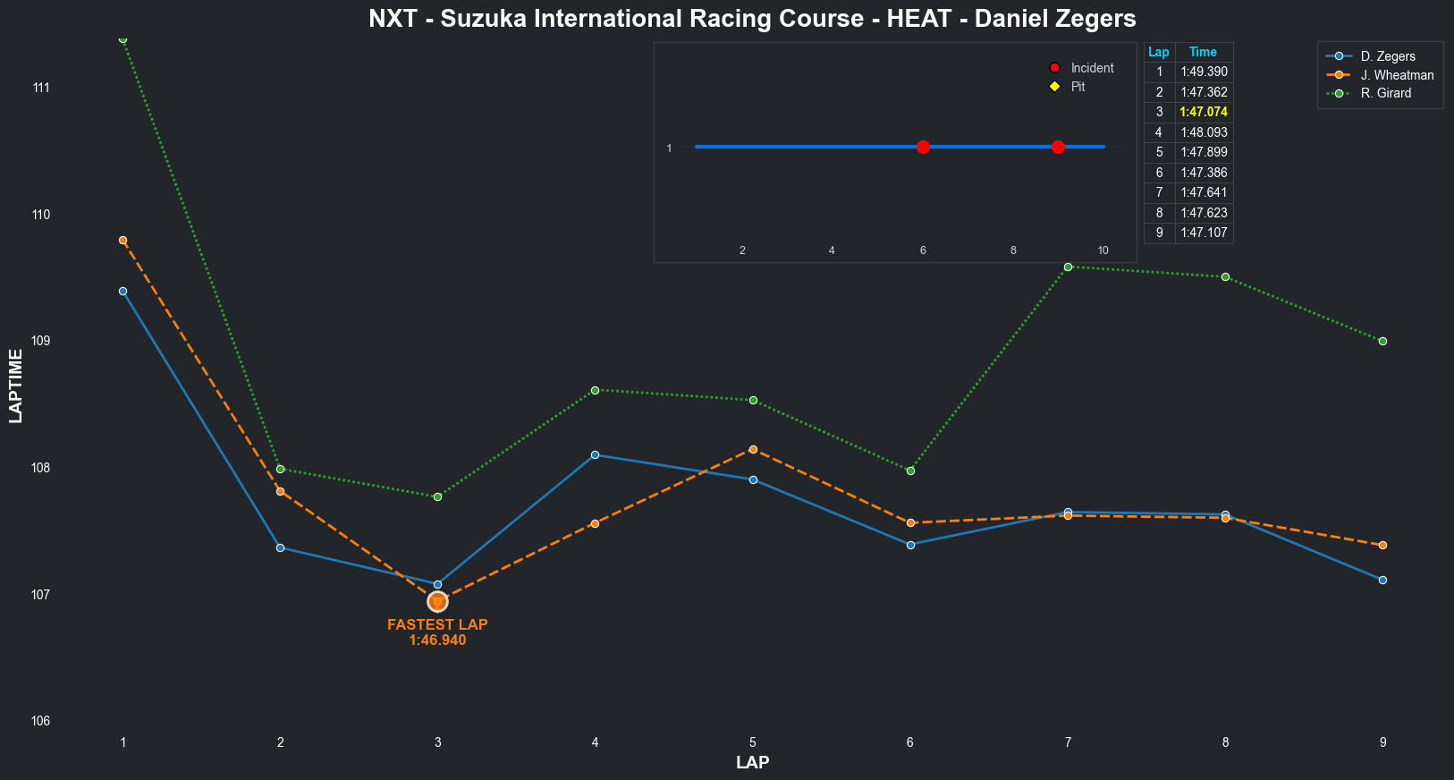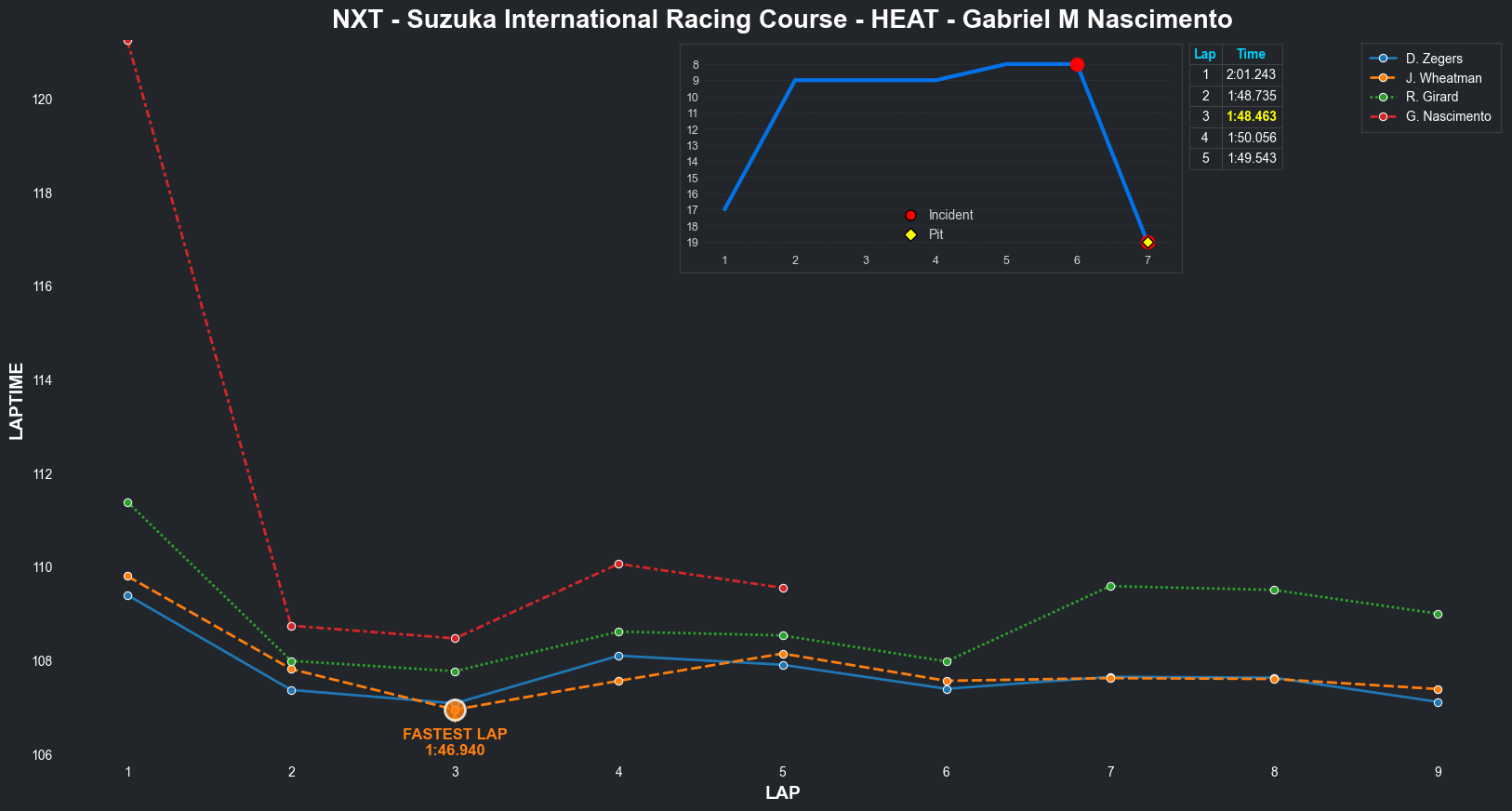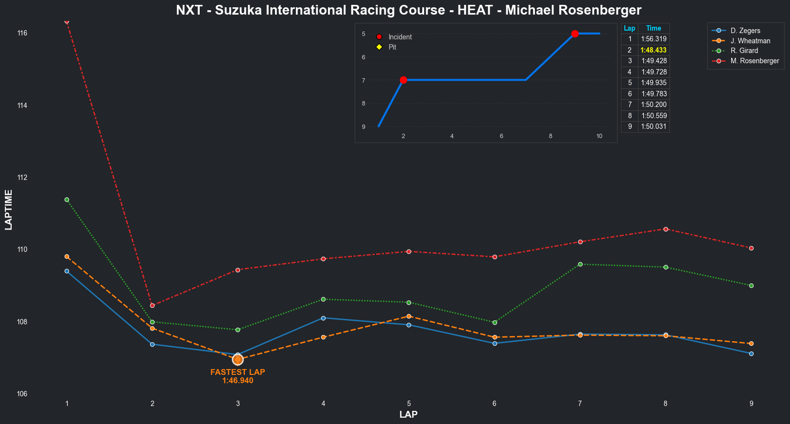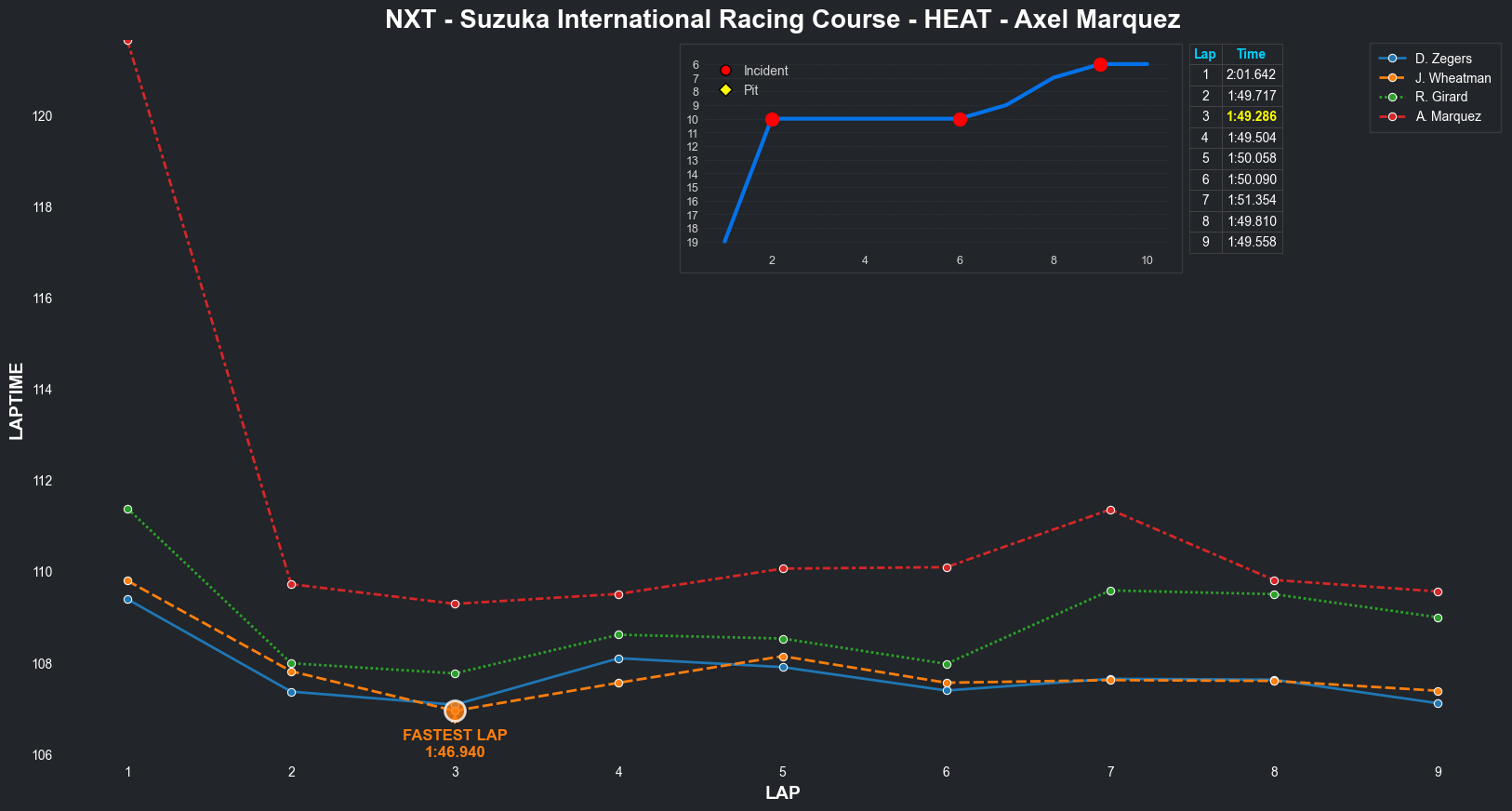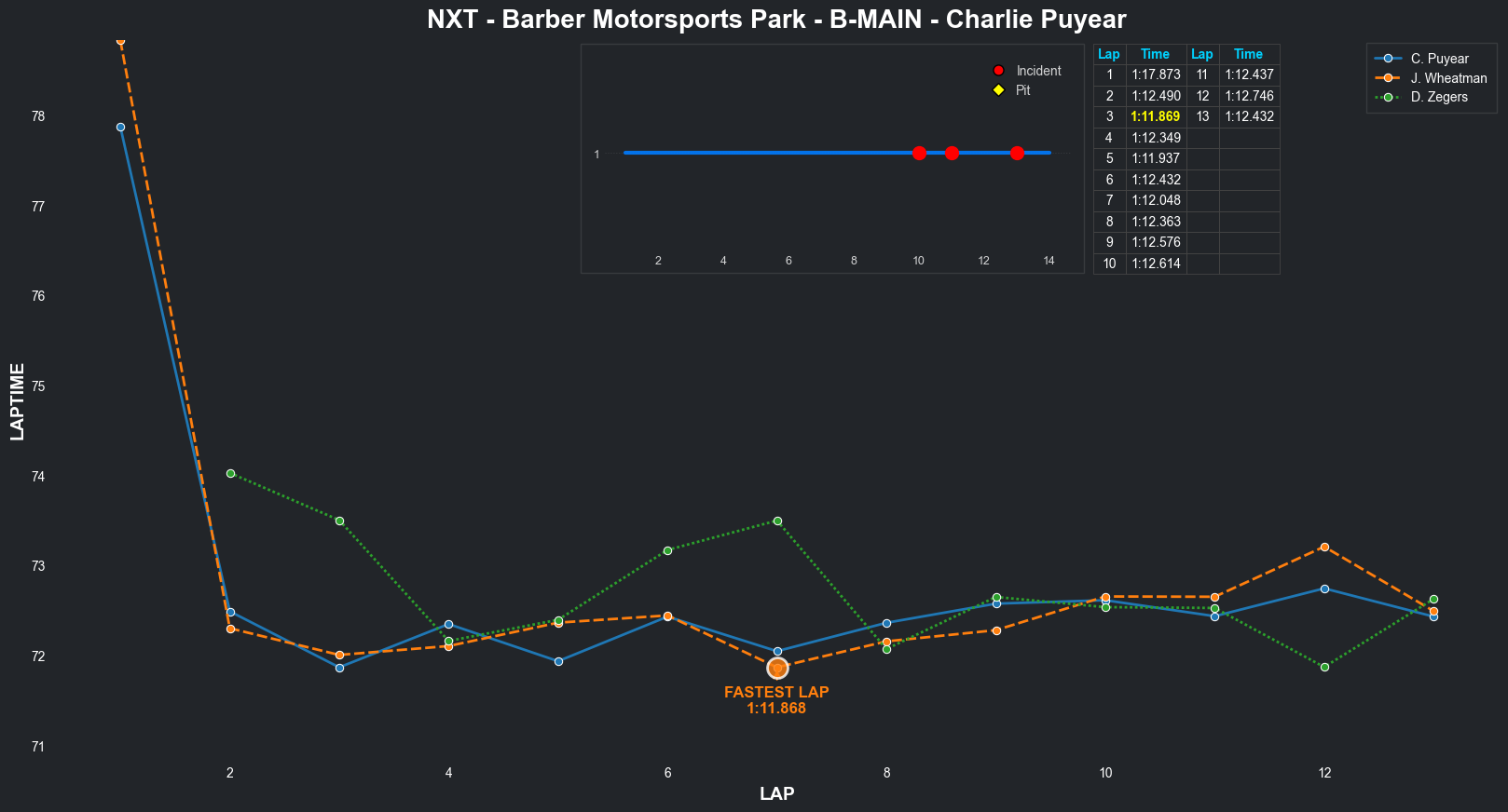 | Riley Girard | 1 | 4 | 1:13.8505 | 1:05.8899 | 1:05.1757 | 1:06.0320 | 1:06.0665 | 1:05.2704 | 1:05.5687 | 1:05.4667 | 1:06.5322 | 1:05.9088 | 1:06.6171 | 1:06.3029 | 1:06.5853 | 1:06.1540 | 0 | 14 |