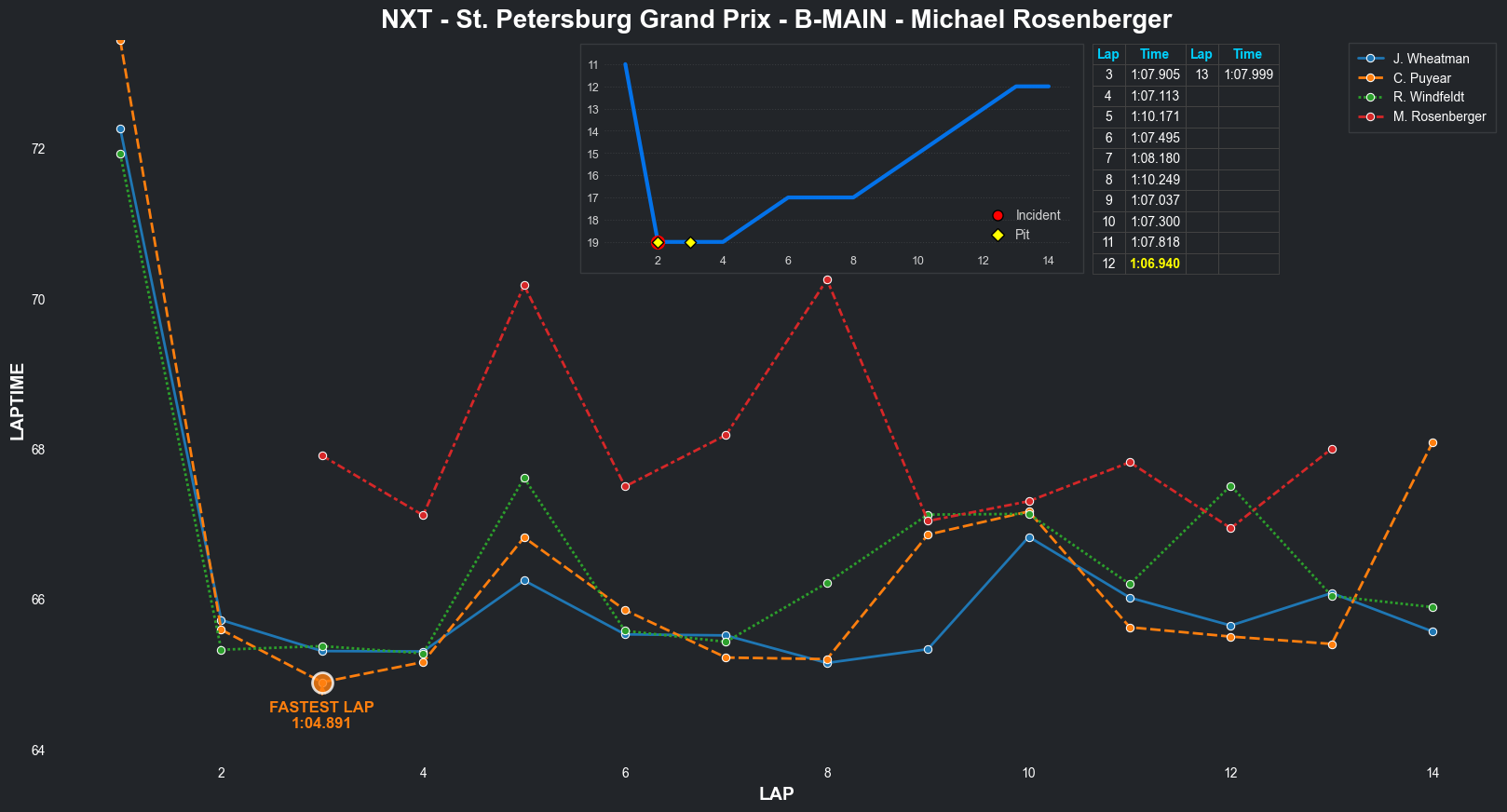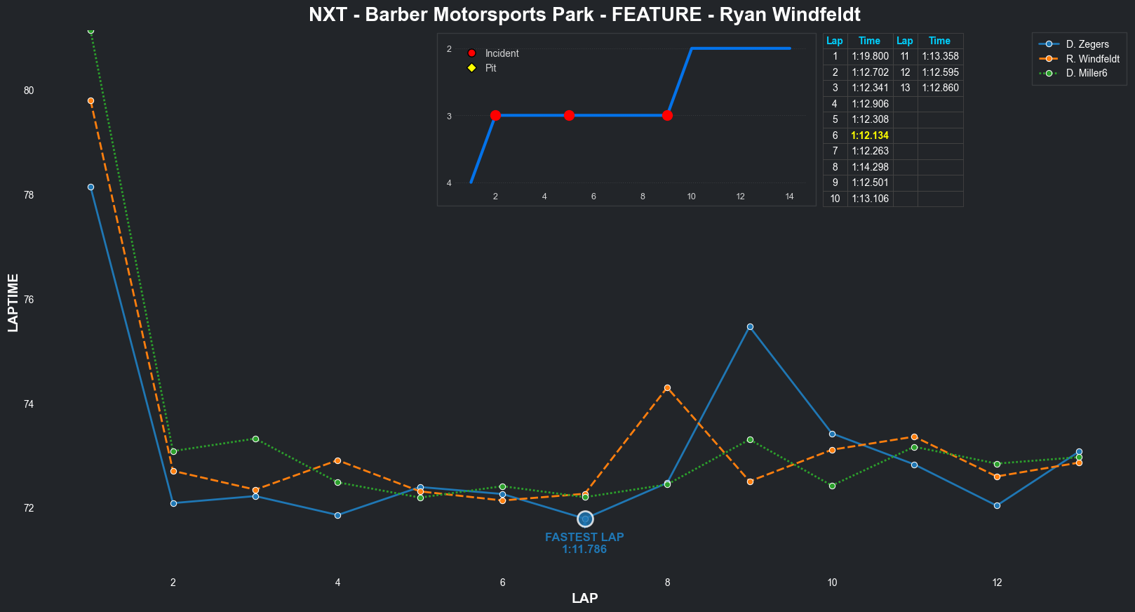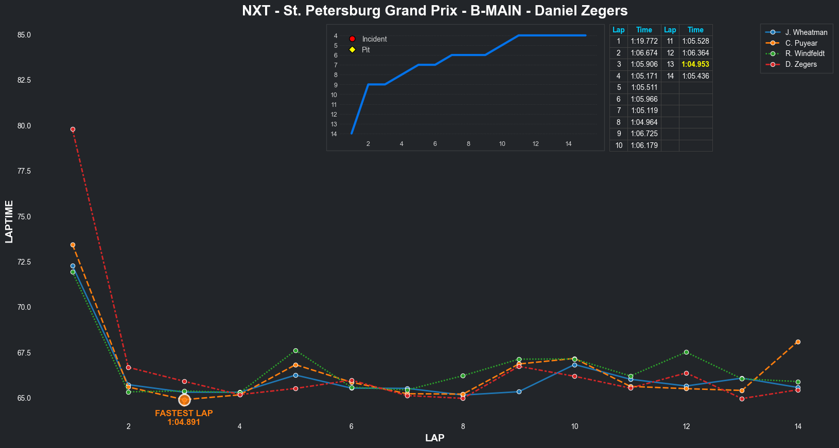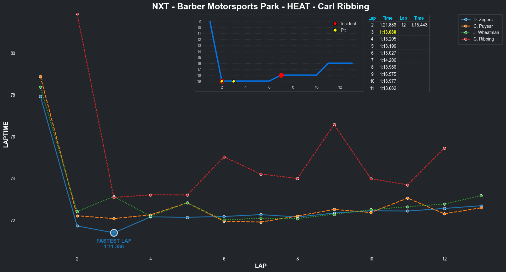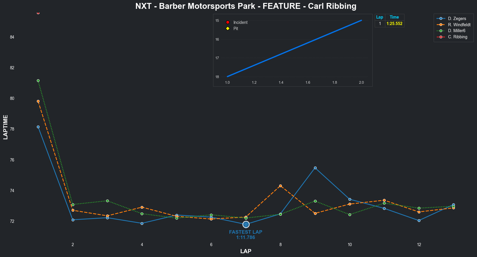 | Ryan Windfeldt | 2 | 7 | 1:15.9180 | 1:06.1079 | 1:06.1250 | 1:05.5204 | 1:05.6485 | 1:05.4550 | 1:05.9713 | 1:05.7870 | 1:06.7194 | 1:06.2238 | 1:05.8178 | 1:06.1650 | 1:07.2425 | 1:06.8586 | 0 | 14 |