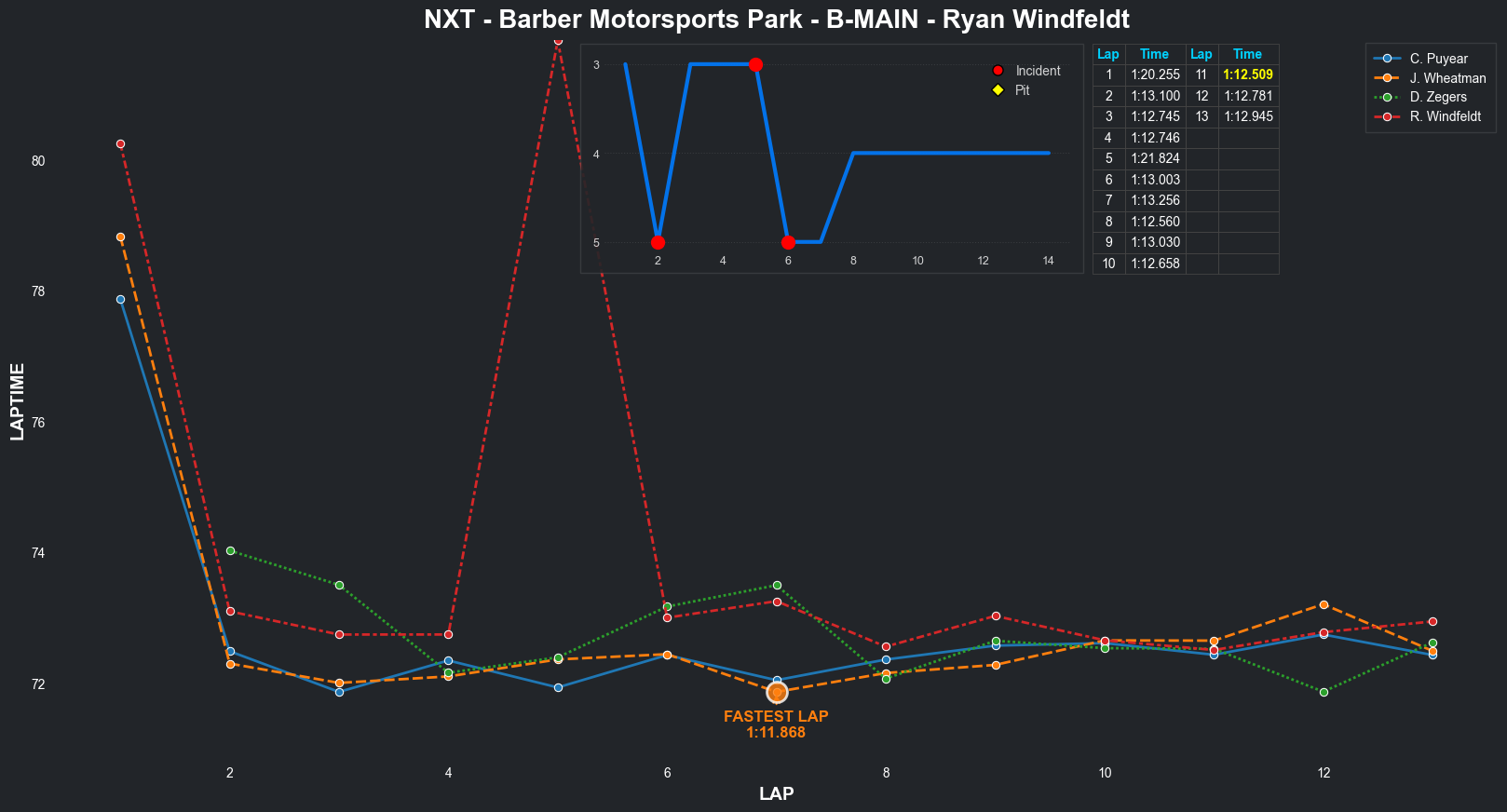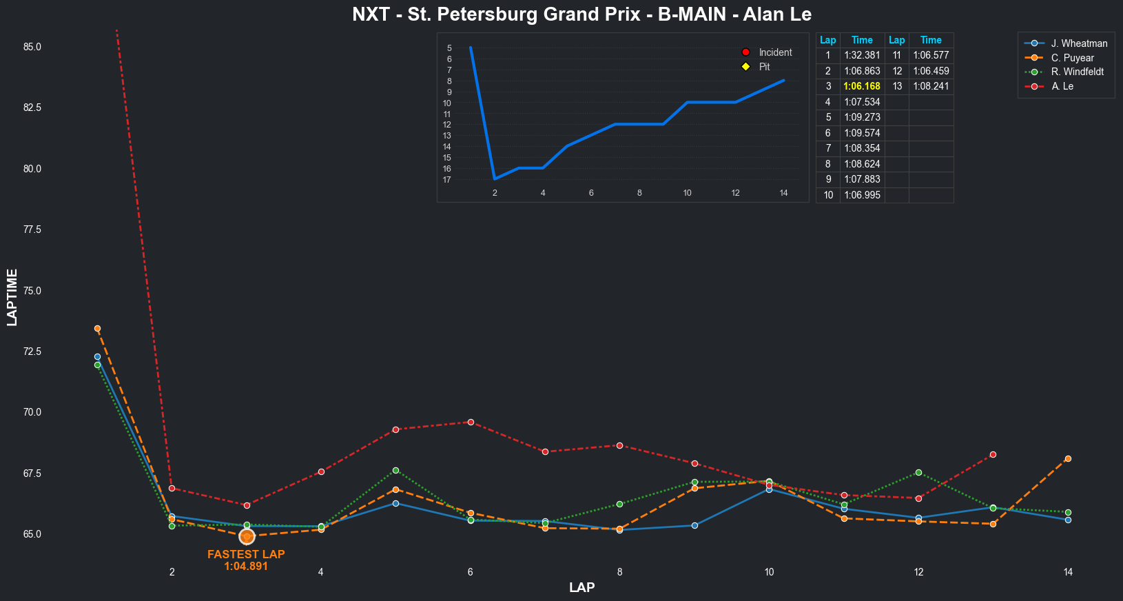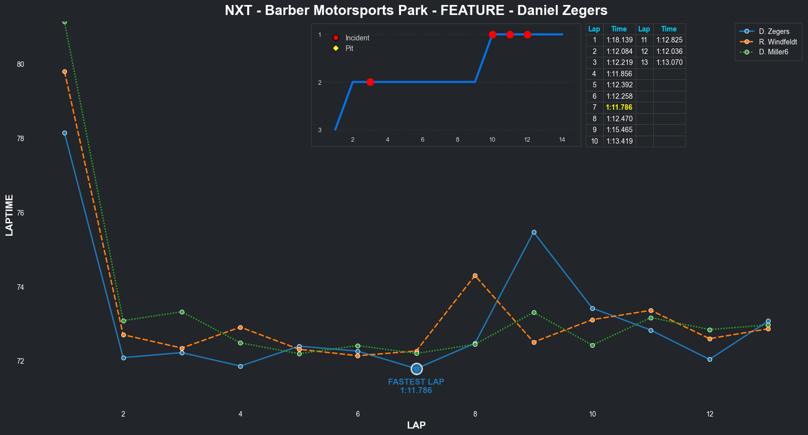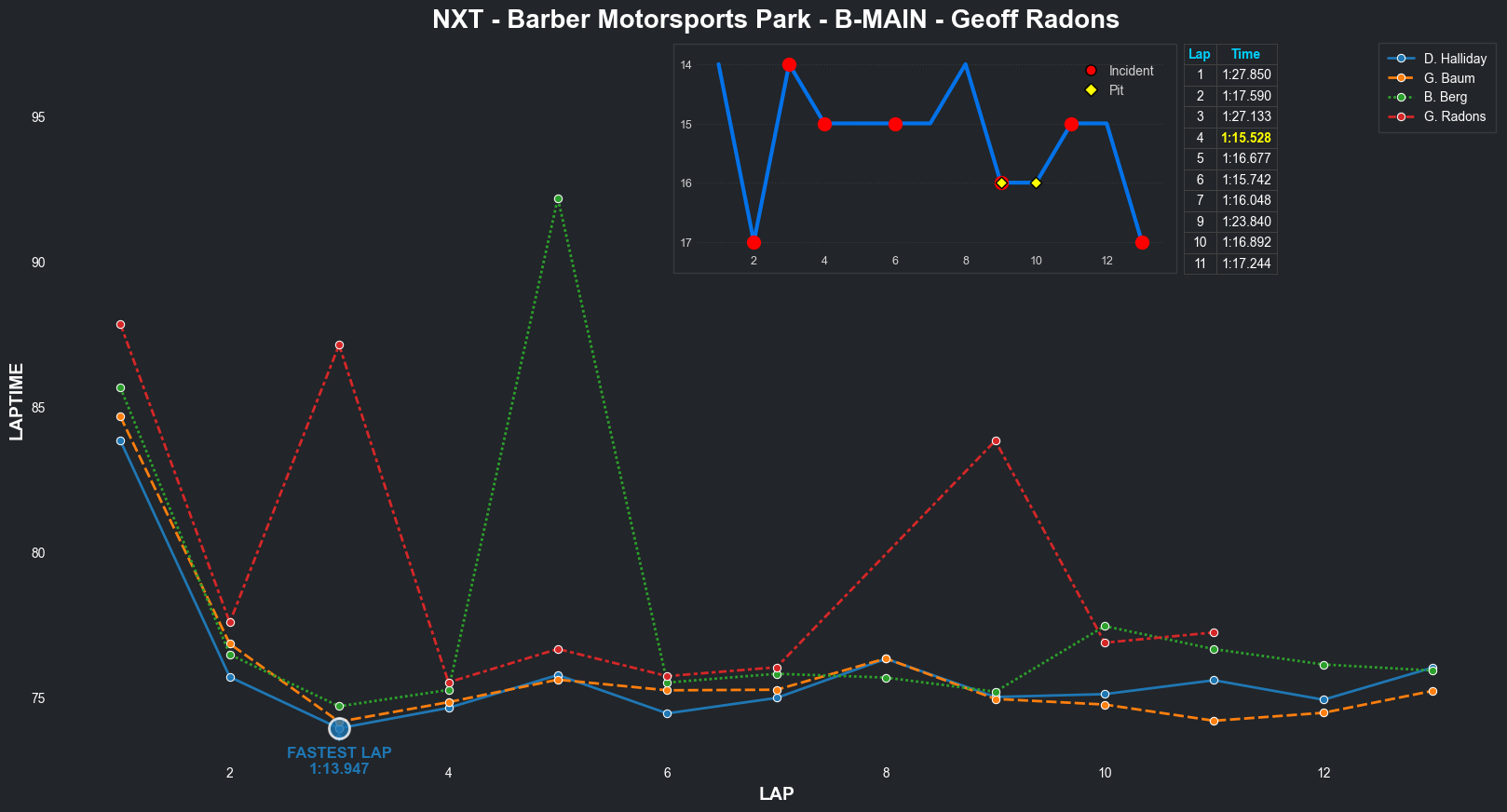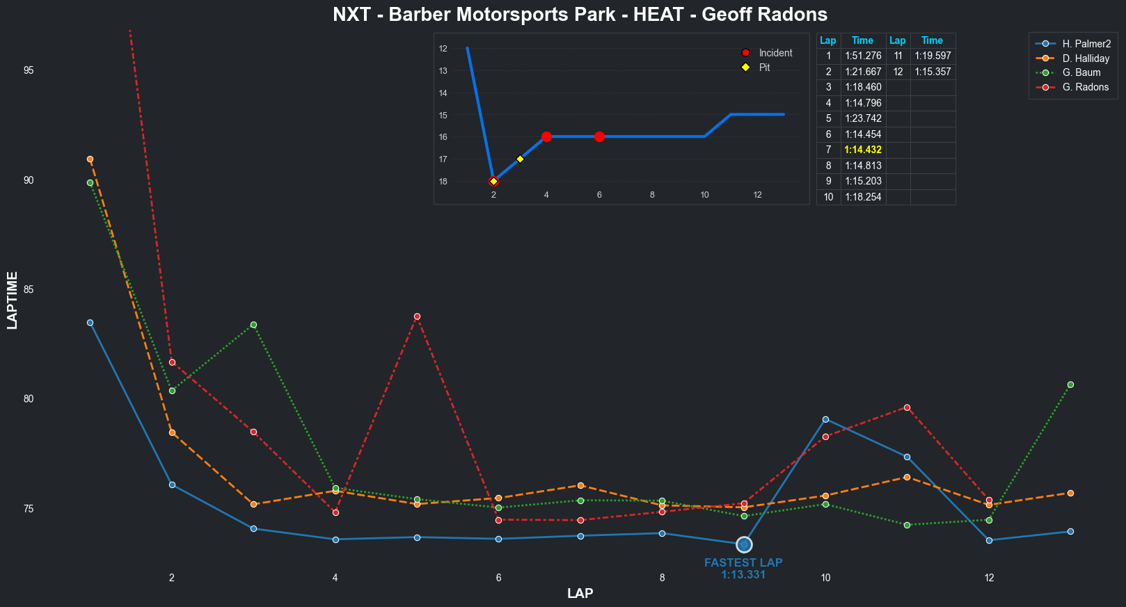 | Ryan Windfeldt | 2 | 7 | 1:15.9180 | 1:06.1079 | 1:06.1250 | 1:05.5204 | 1:05.6485 | 1:05.4550 | 1:05.9713 | 1:05.7870 | 1:06.7194 | 1:06.2238 | 1:05.8178 | 1:06.1650 | 1:07.2425 | 1:06.8586 | 0 | 14 |