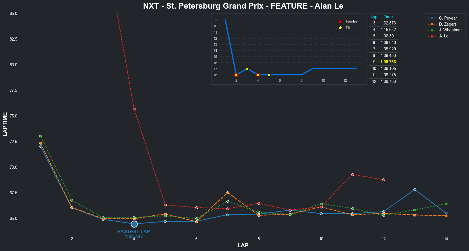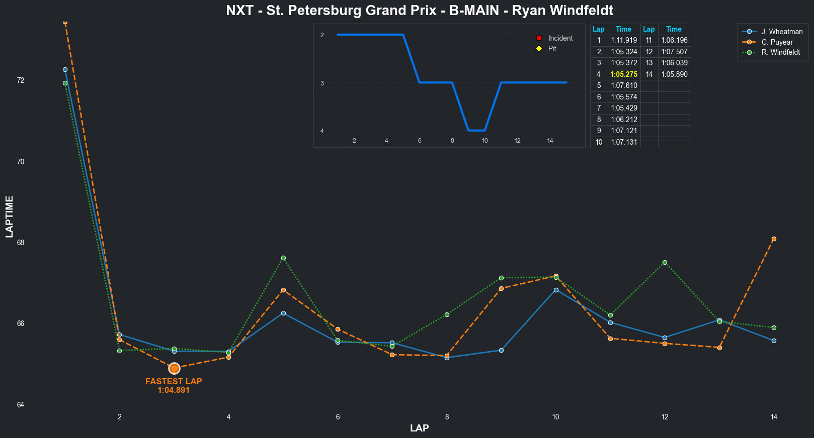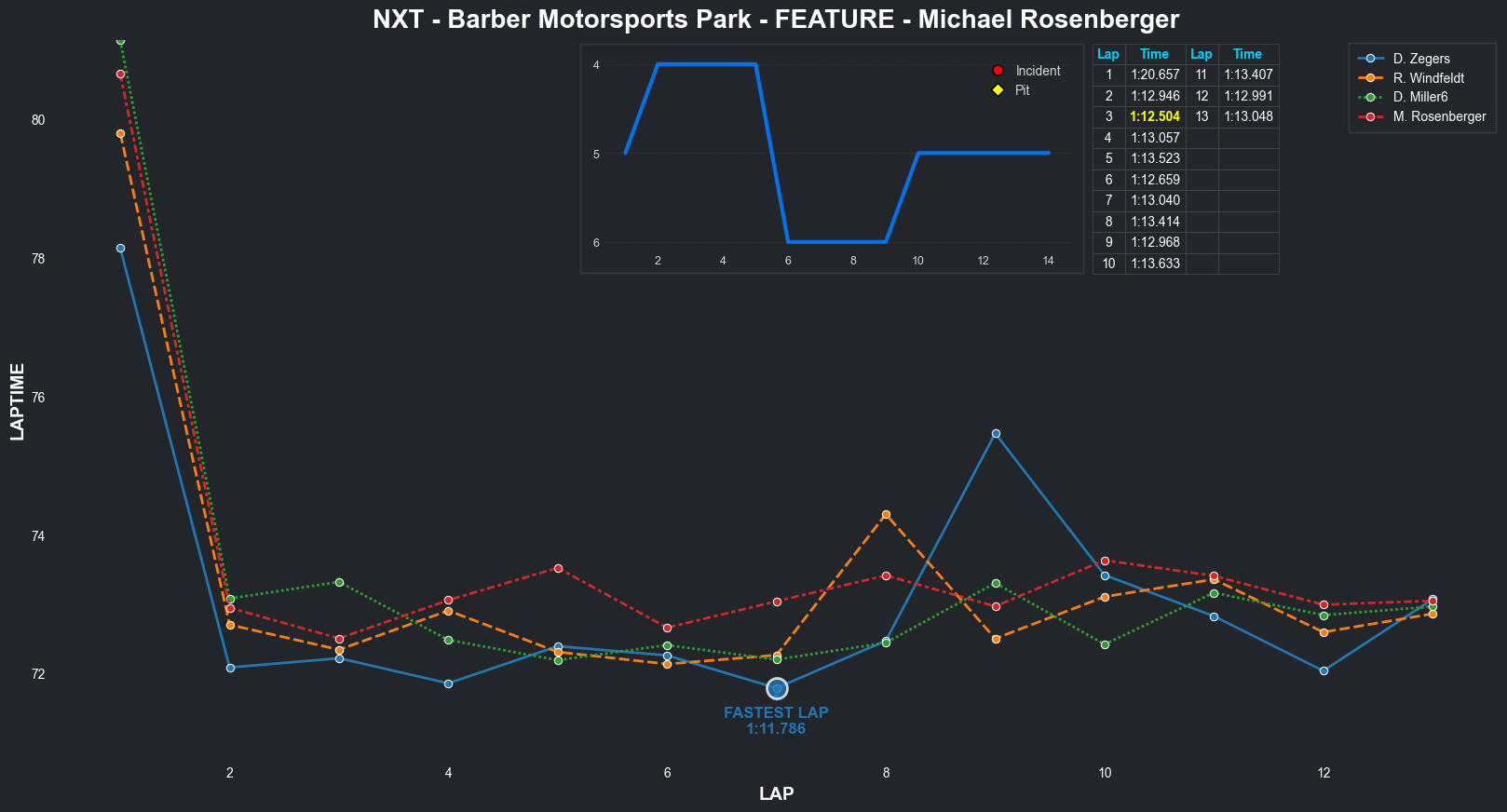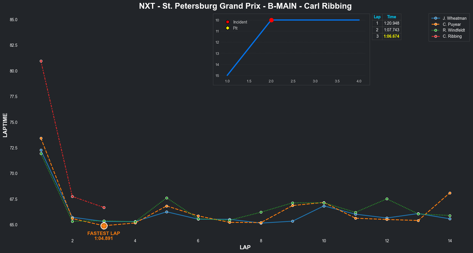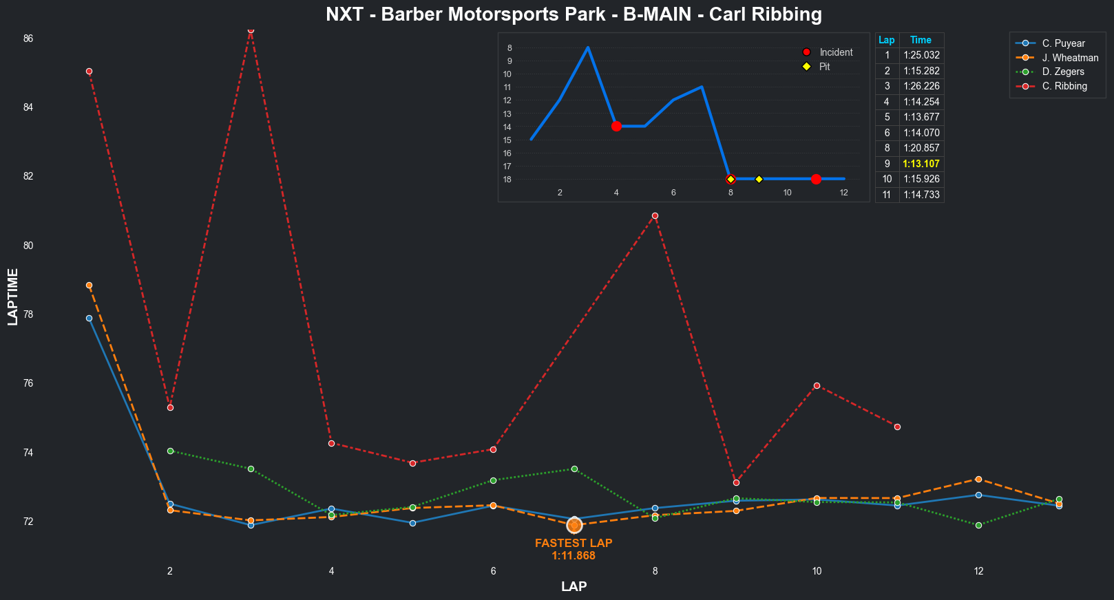 | Ryan Windfeldt | 2 | 7 | 1:15.9180 | 1:06.1079 | 1:06.1250 | 1:05.5204 | 1:05.6485 | 1:05.4550 | 1:05.9713 | 1:05.7870 | 1:06.7194 | 1:06.2238 | 1:05.8178 | 1:06.1650 | 1:07.2425 | 1:06.8586 | 0 | 14 |