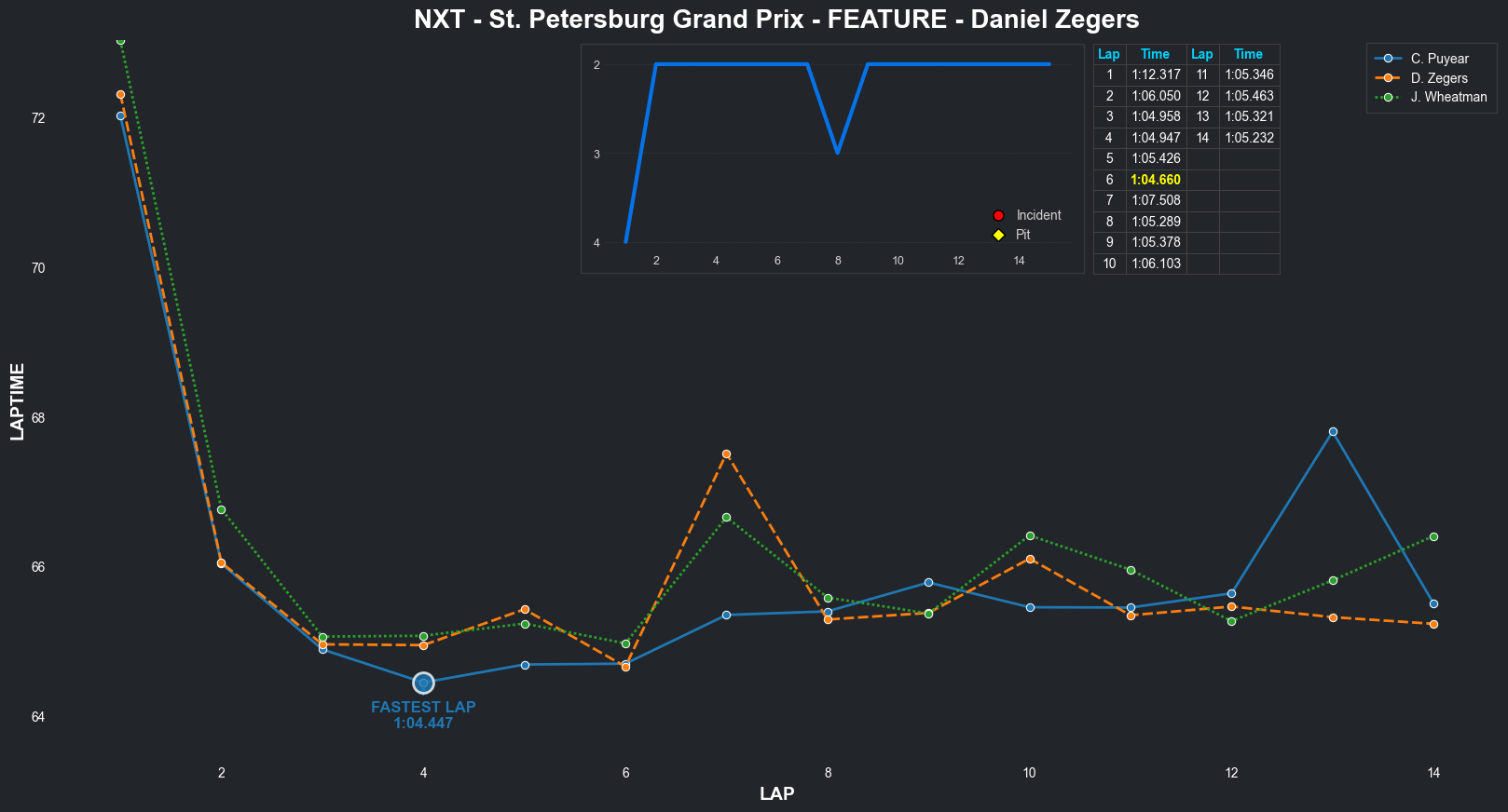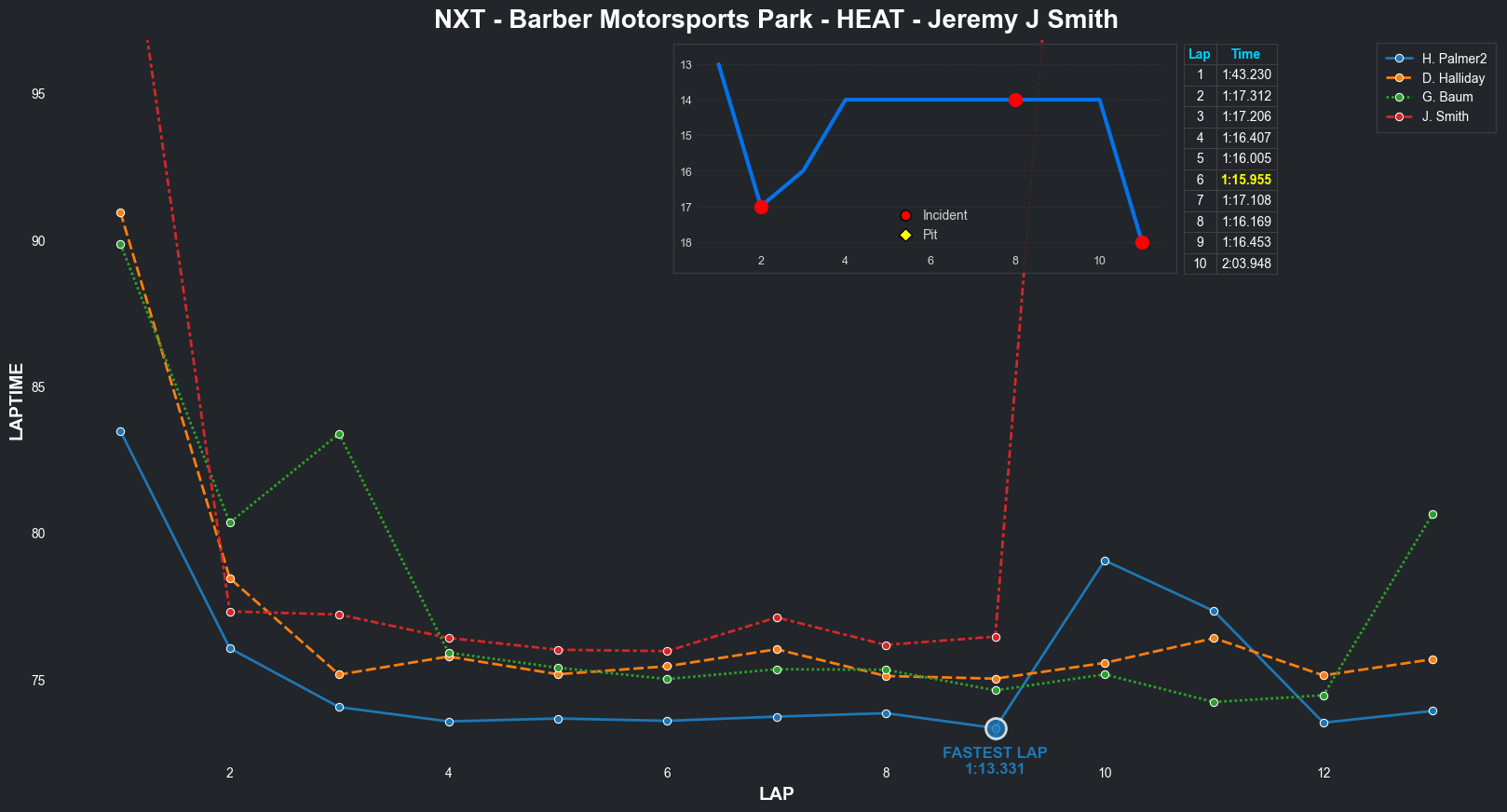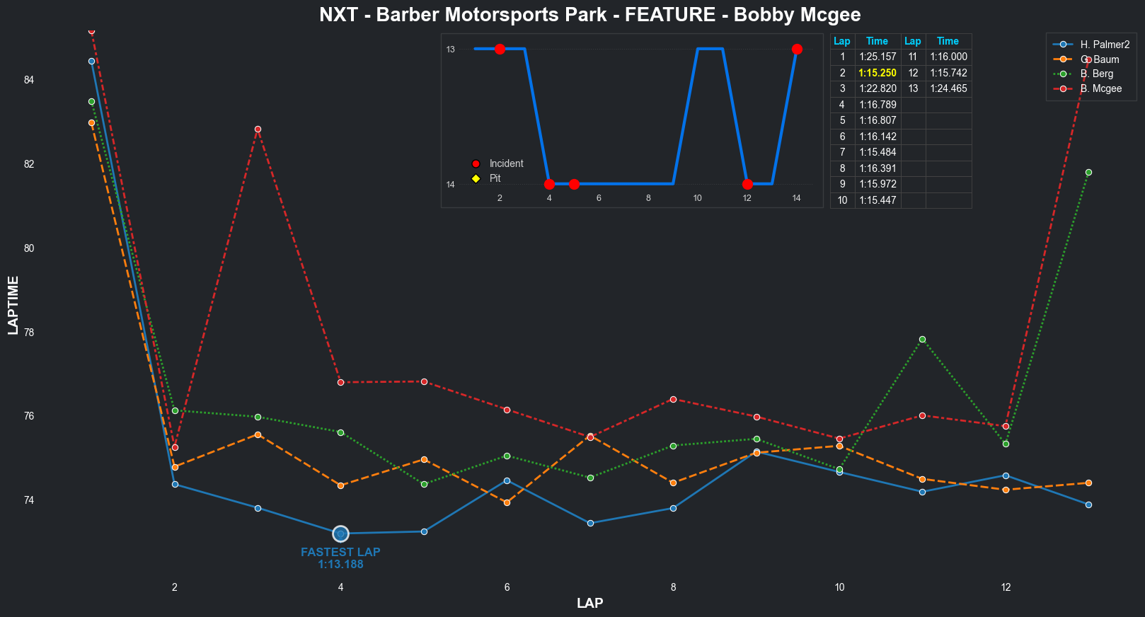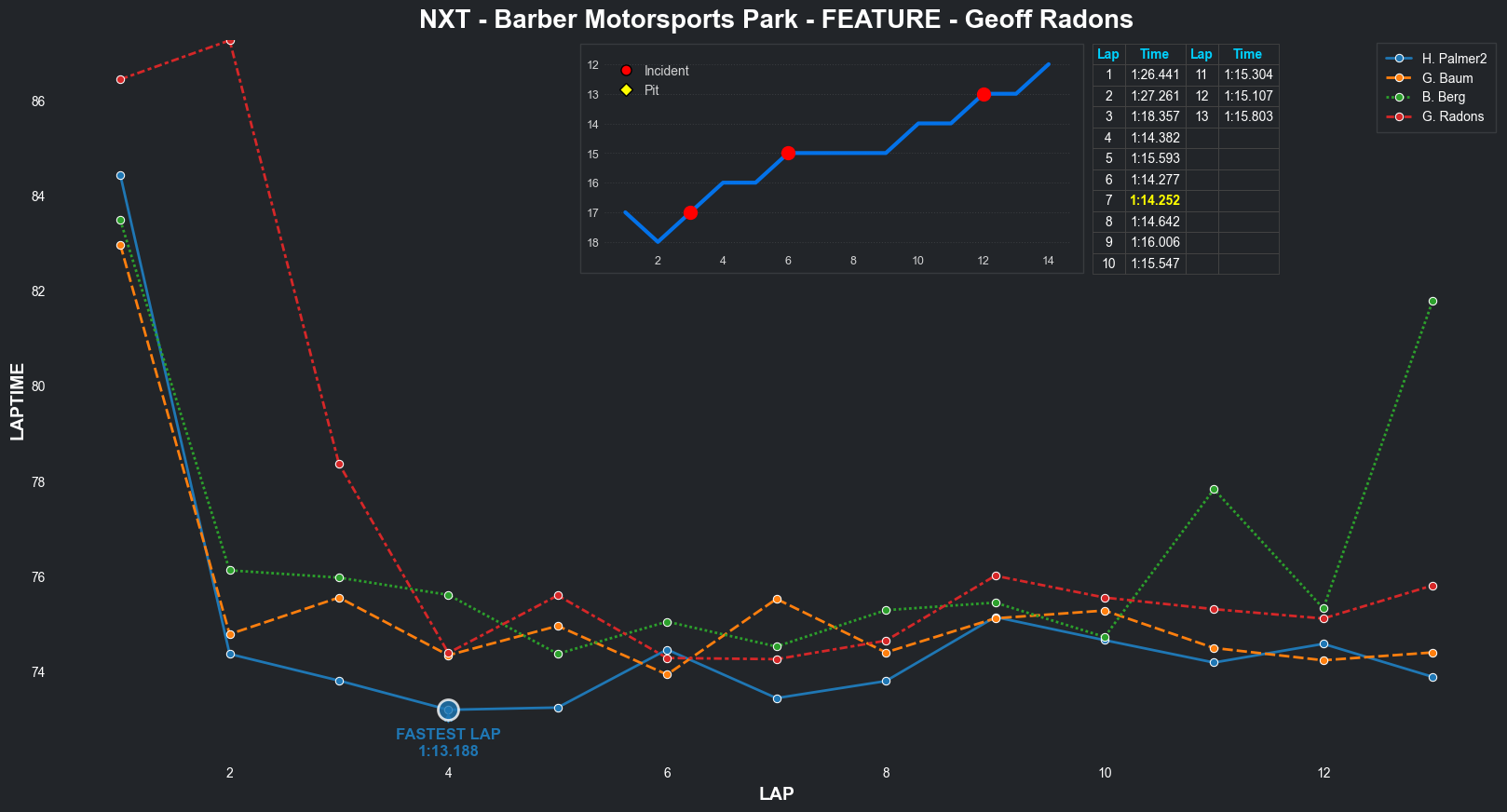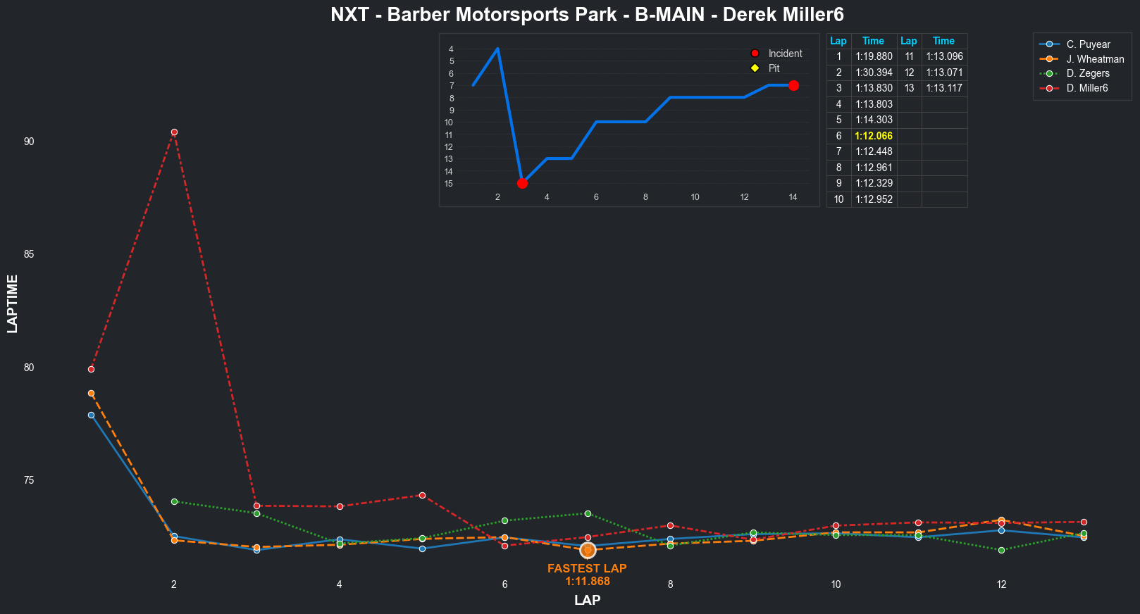 | Ryan Windfeldt | 2 | 7 | 1:15.9180 | 1:06.1079 | 1:06.1250 | 1:05.5204 | 1:05.6485 | 1:05.4550 | 1:05.9713 | 1:05.7870 | 1:06.7194 | 1:06.2238 | 1:05.8178 | 1:06.1650 | 1:07.2425 | 1:06.8586 | 0 | 14 |