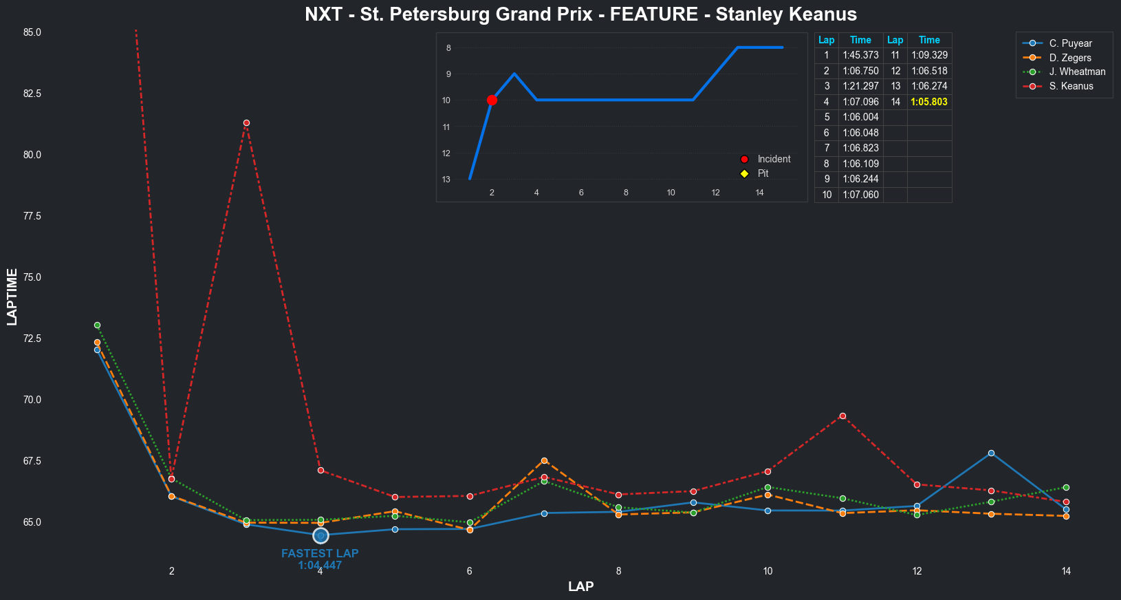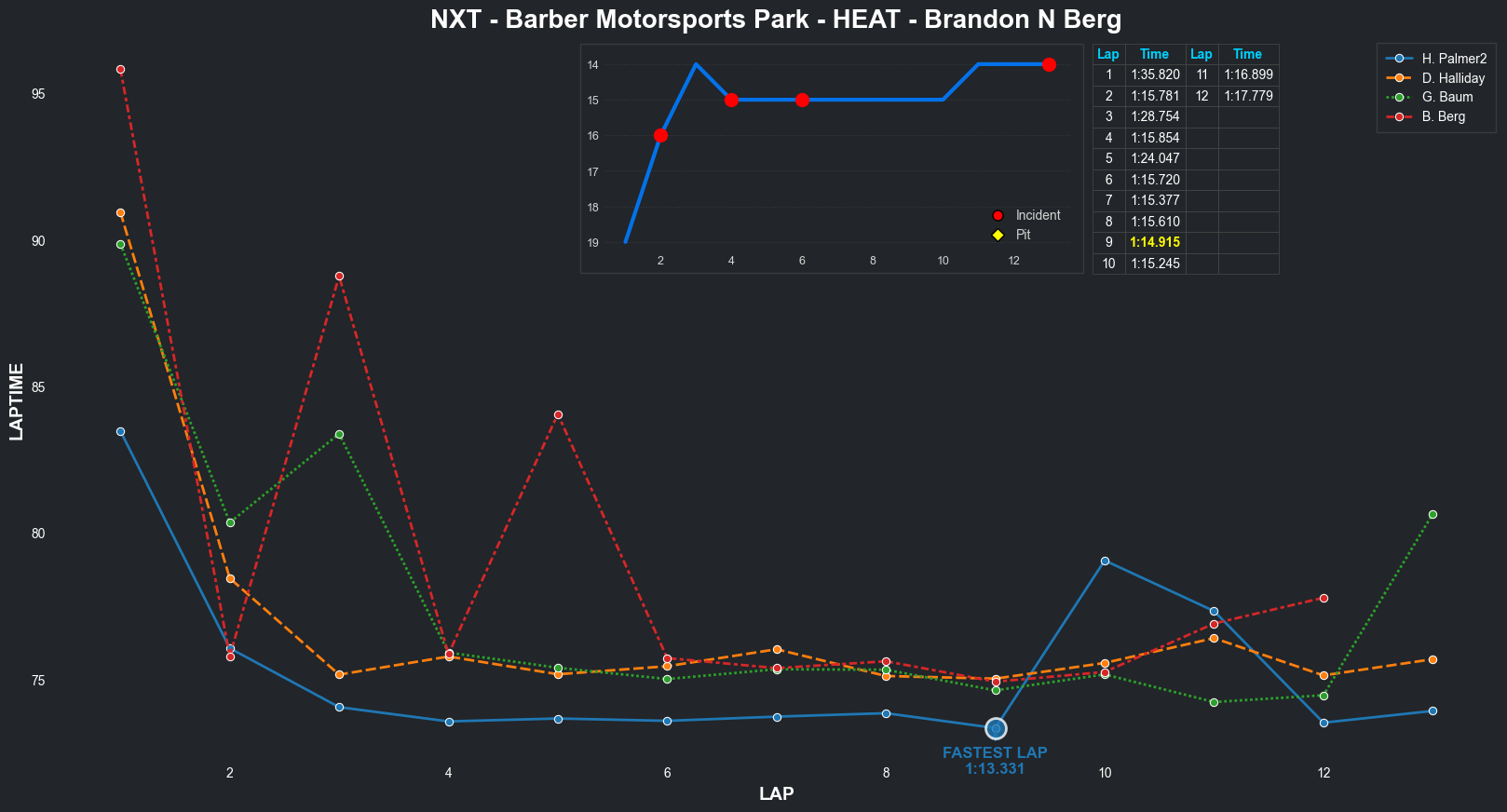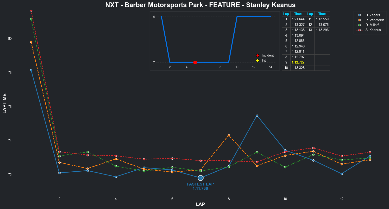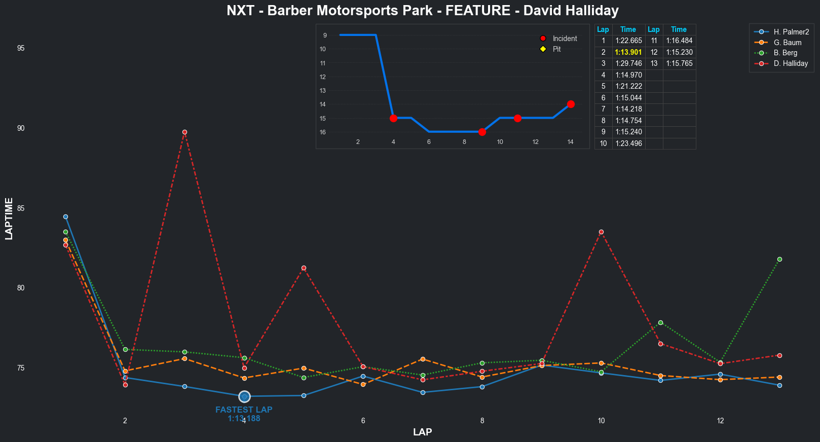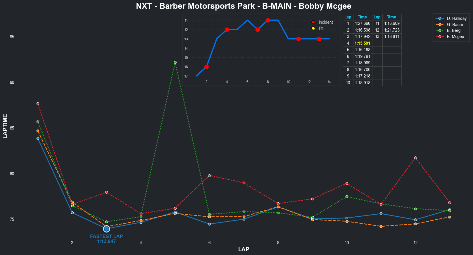 | Ryan Windfeldt | 2 | 7 | 1:15.9180 | 1:06.1079 | 1:06.1250 | 1:05.5204 | 1:05.6485 | 1:05.4550 | 1:05.9713 | 1:05.7870 | 1:06.7194 | 1:06.2238 | 1:05.8178 | 1:06.1650 | 1:07.2425 | 1:06.8586 | 0 | 14 |