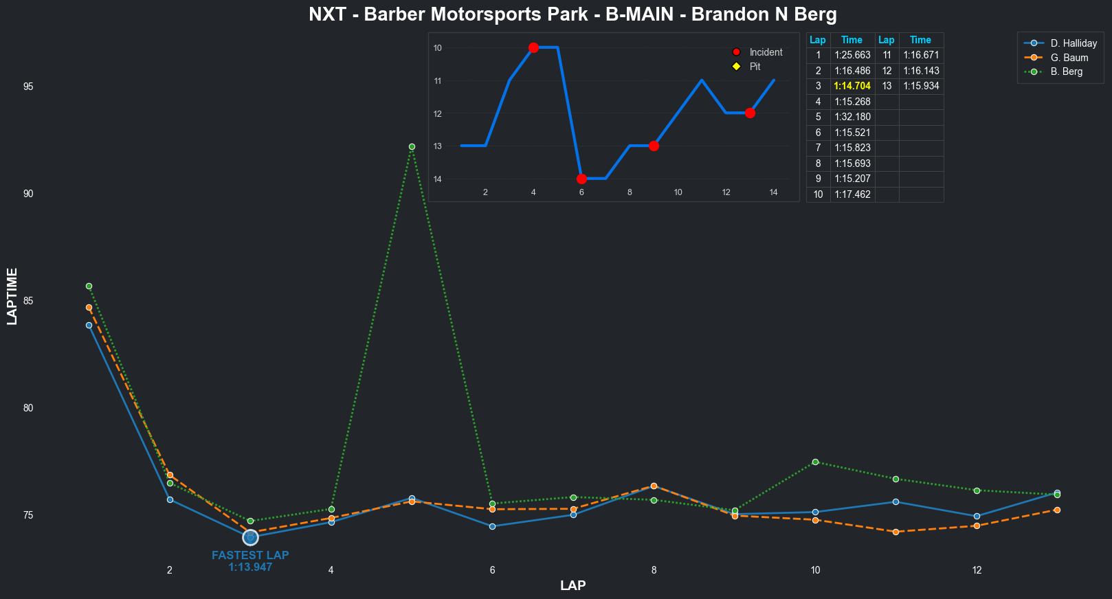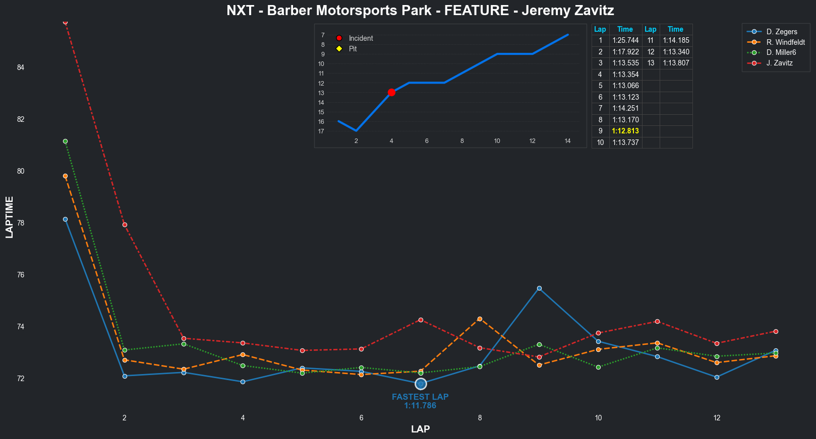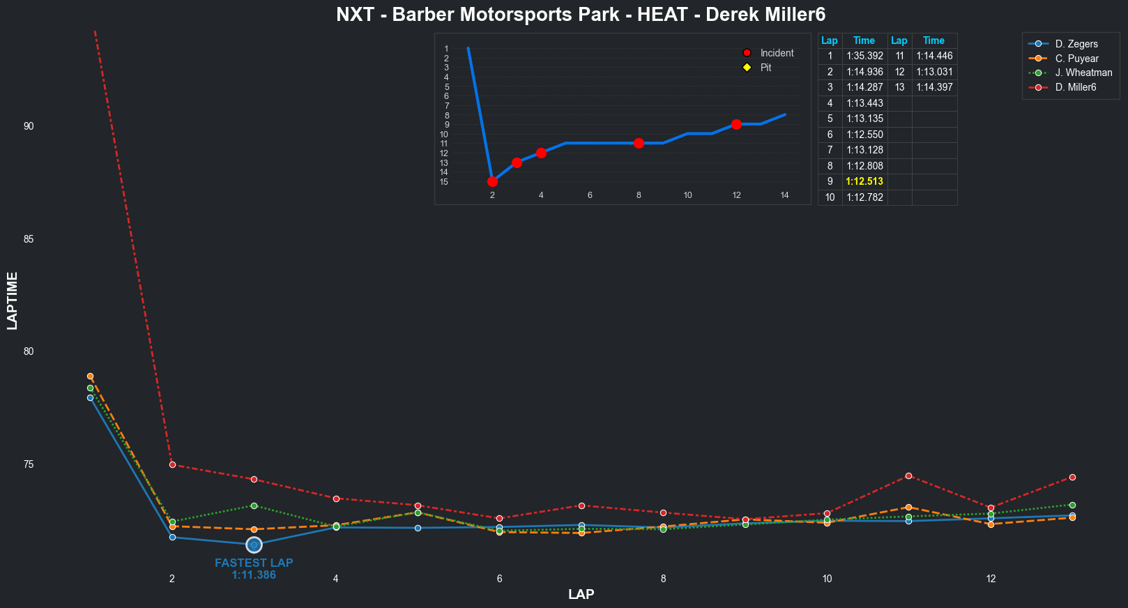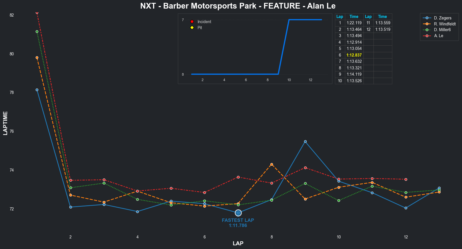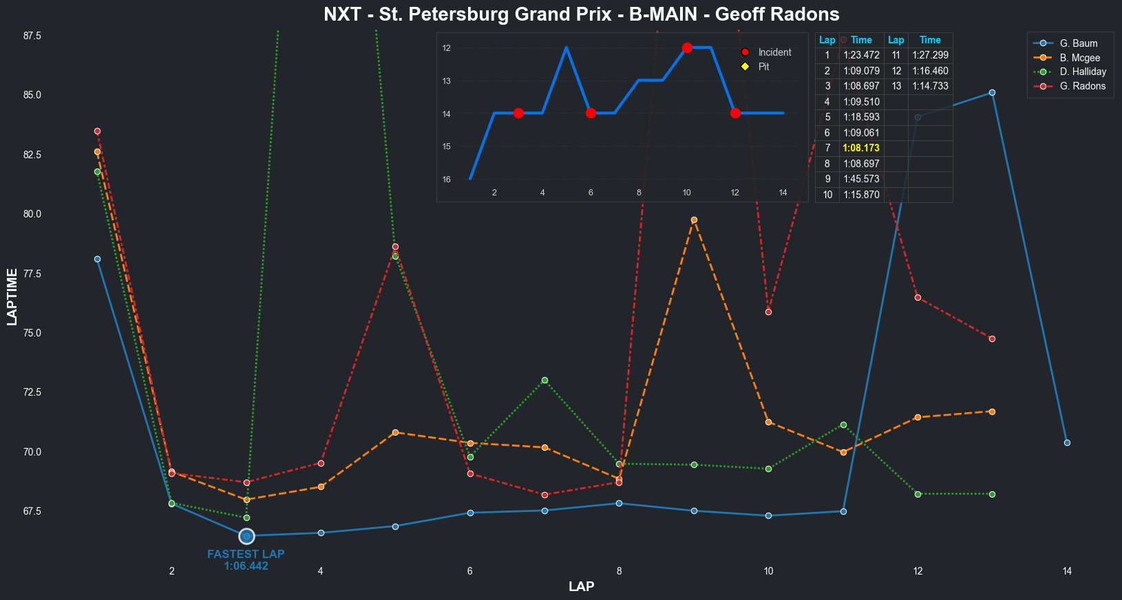 | Ryan Windfeldt | 2 | 7 | 1:15.9180 | 1:06.1079 | 1:06.1250 | 1:05.5204 | 1:05.6485 | 1:05.4550 | 1:05.9713 | 1:05.7870 | 1:06.7194 | 1:06.2238 | 1:05.8178 | 1:06.1650 | 1:07.2425 | 1:06.8586 | 0 | 14 |