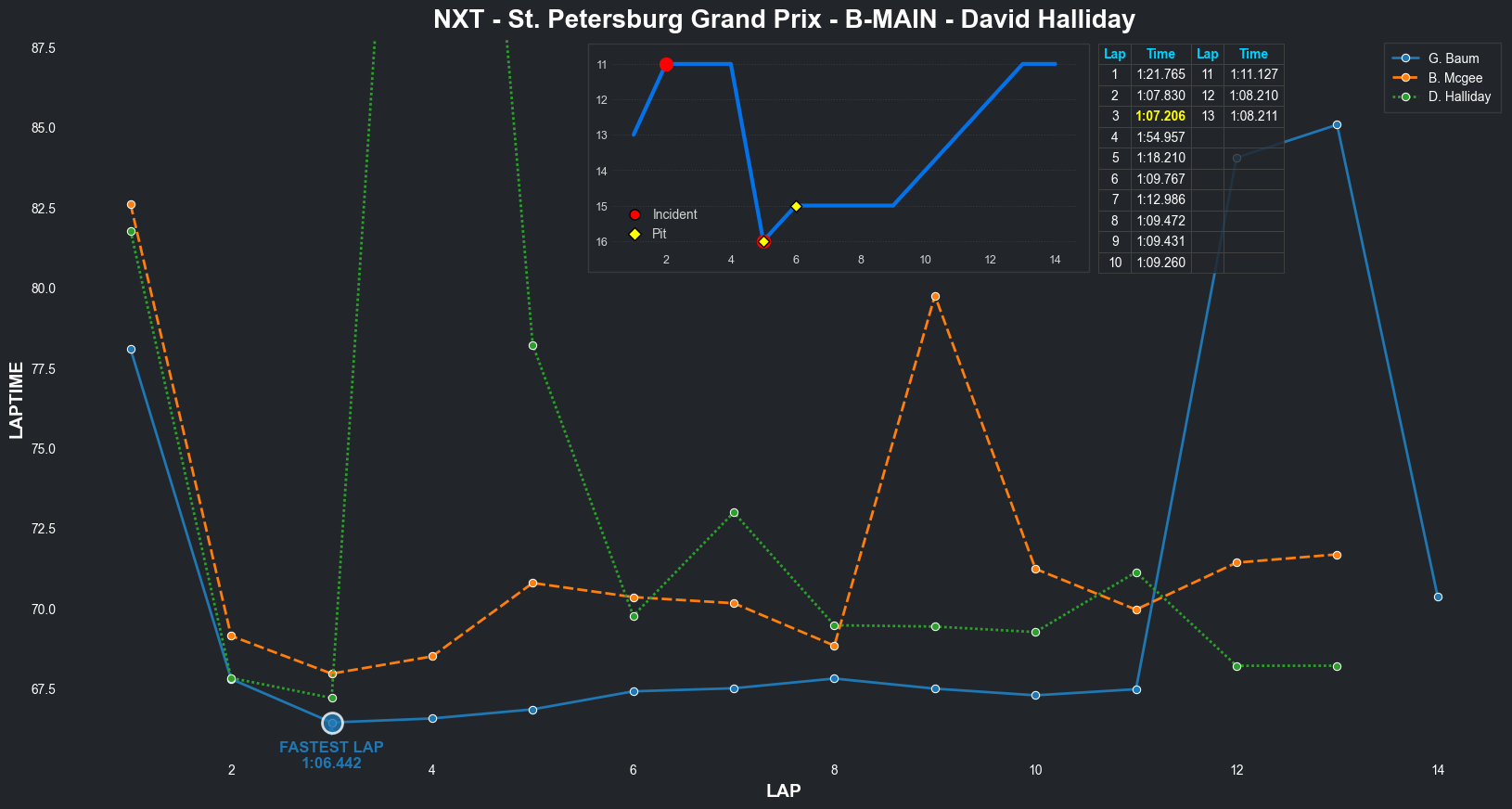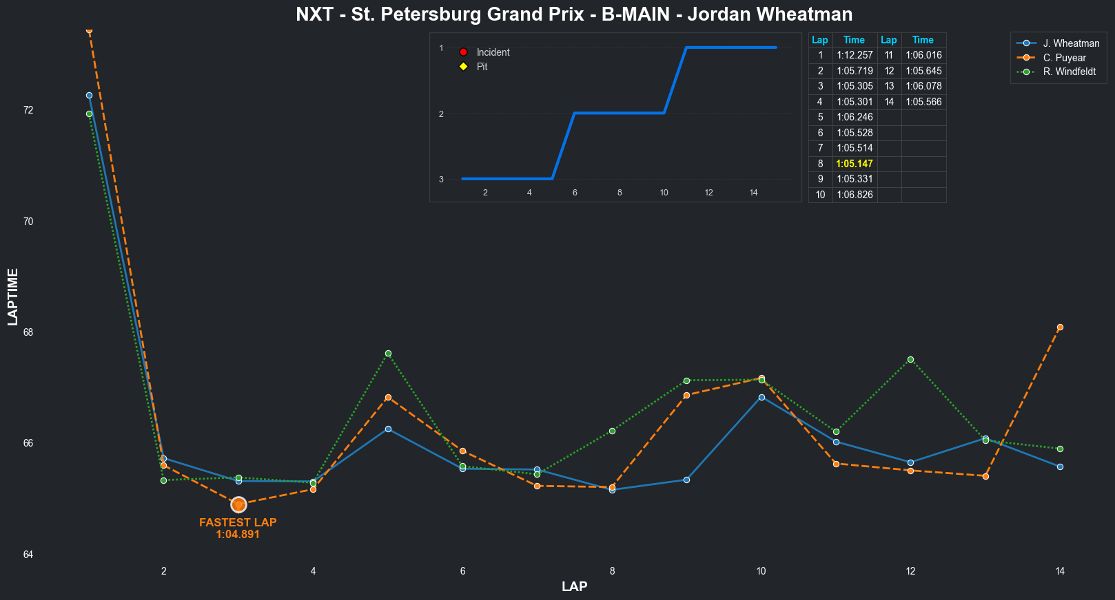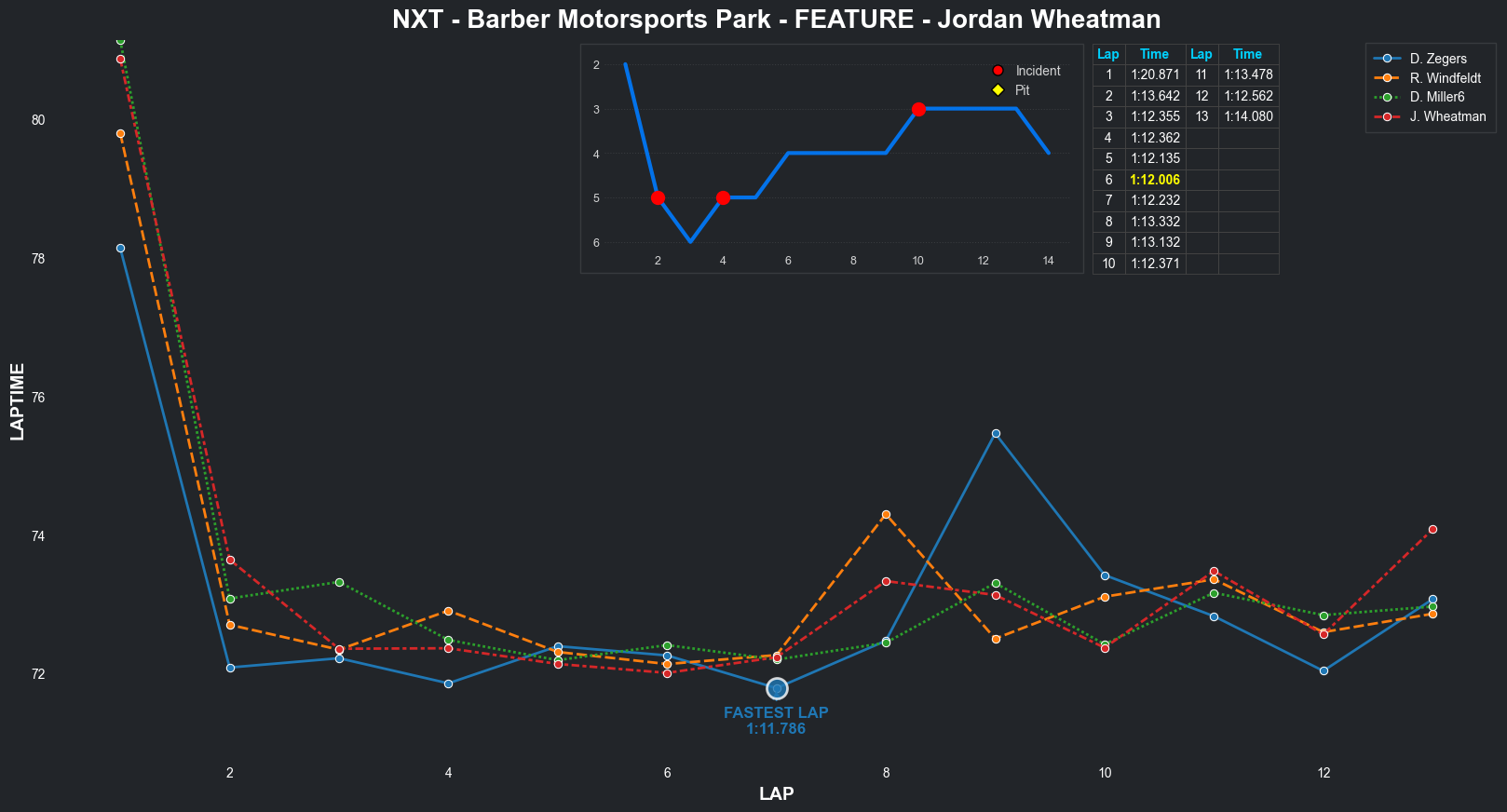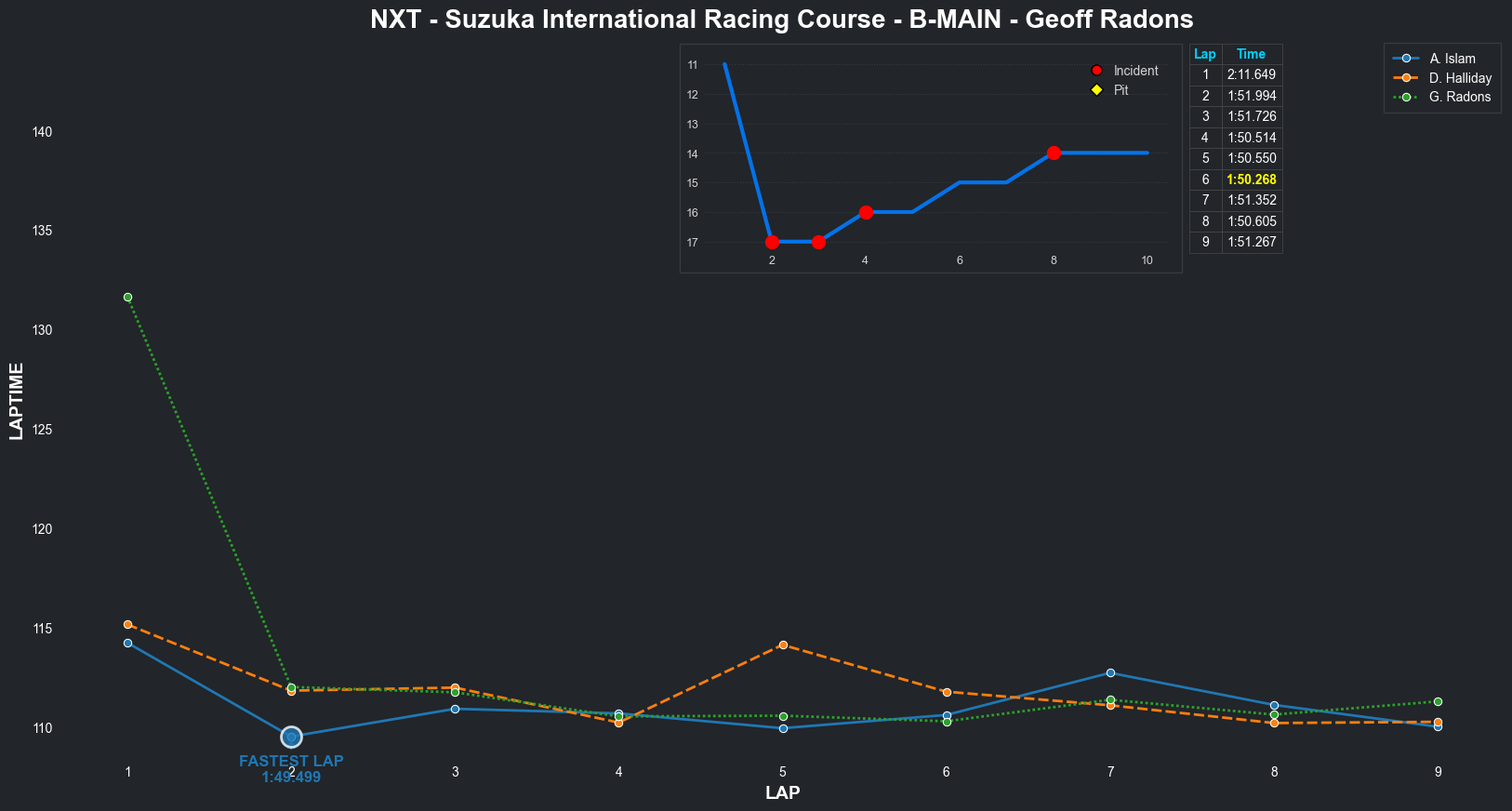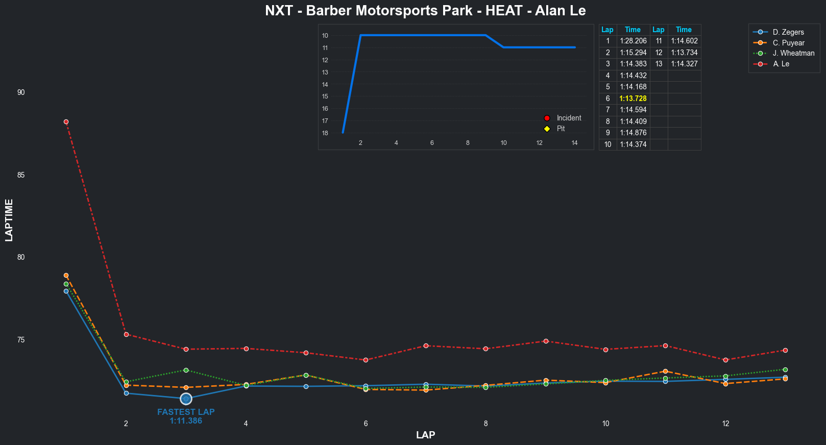| Ryan Windfeldt | 2 | 7 | 1:15.9180 | 1:06.1079 | 1:06.1250 | 1:05.5204 | 1:05.6485 | 1:05.4550 | 1:05.9713 | 1:05.7870 | 1:06.7194 | 1:06.2238 | 1:05.8178 | 1:06.1650 | 1:07.2425 | 1:06.8586 | 0 | 14 |