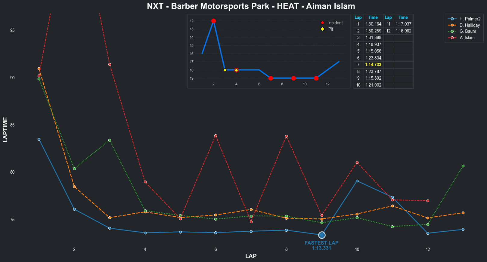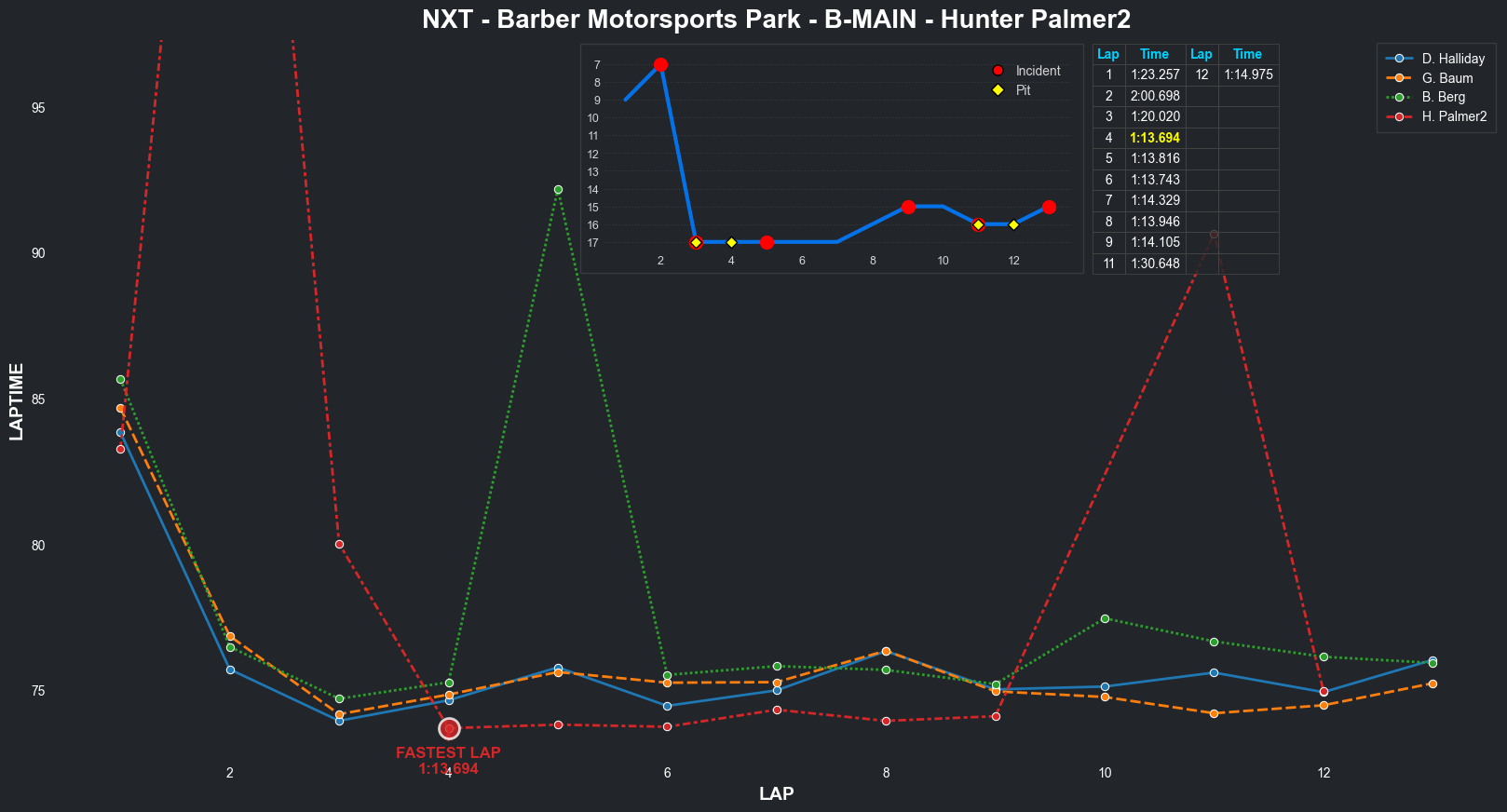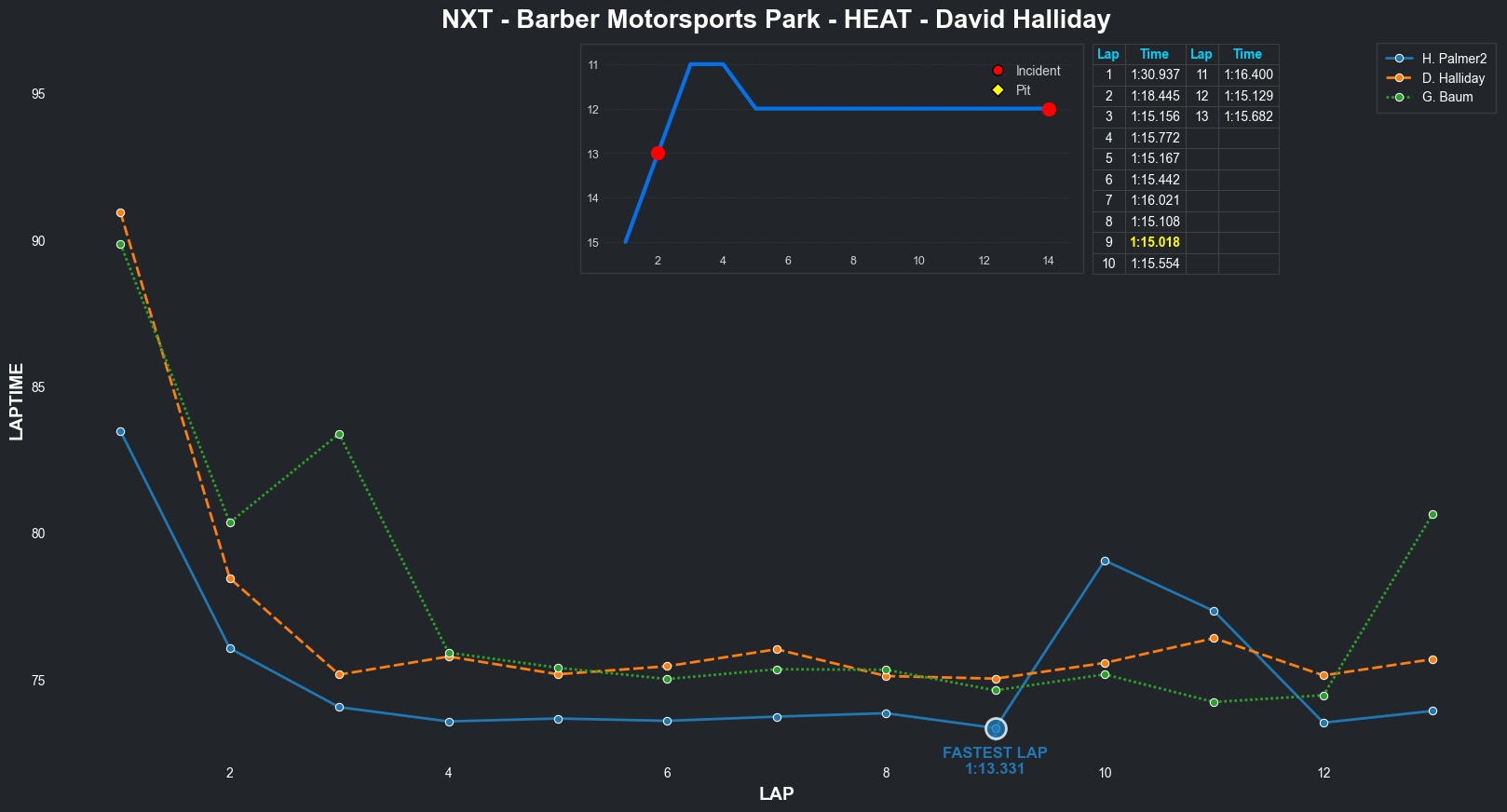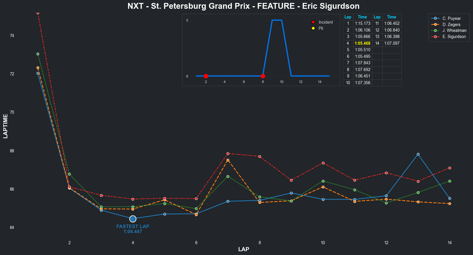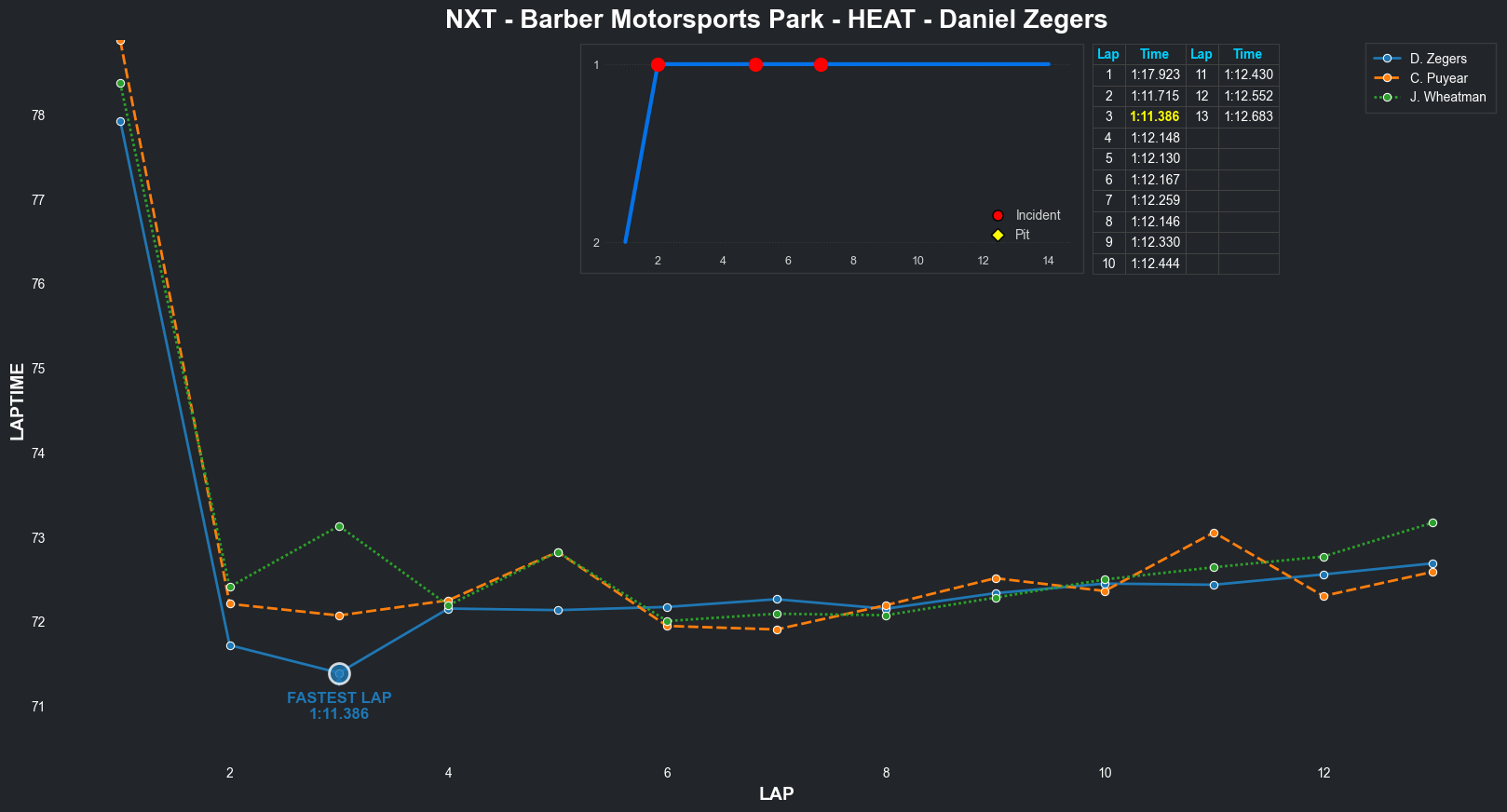 | Ryan Windfeldt | 2 | 7 | 1:15.9180 | 1:06.1079 | 1:06.1250 | 1:05.5204 | 1:05.6485 | 1:05.4550 | 1:05.9713 | 1:05.7870 | 1:06.7194 | 1:06.2238 | 1:05.8178 | 1:06.1650 | 1:07.2425 | 1:06.8586 | 0 | 14 |