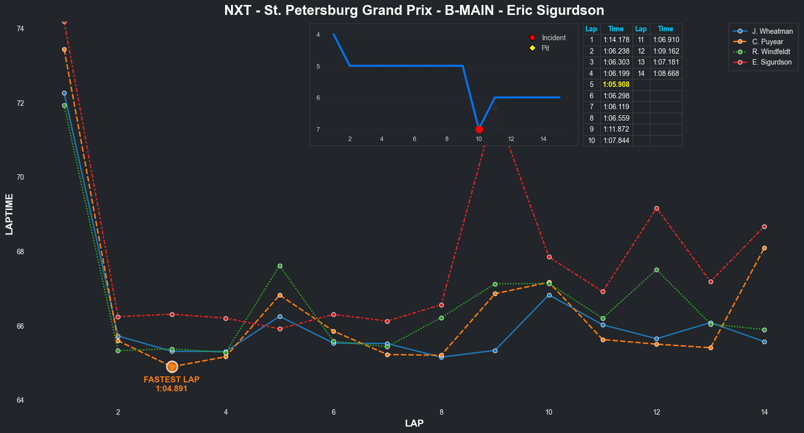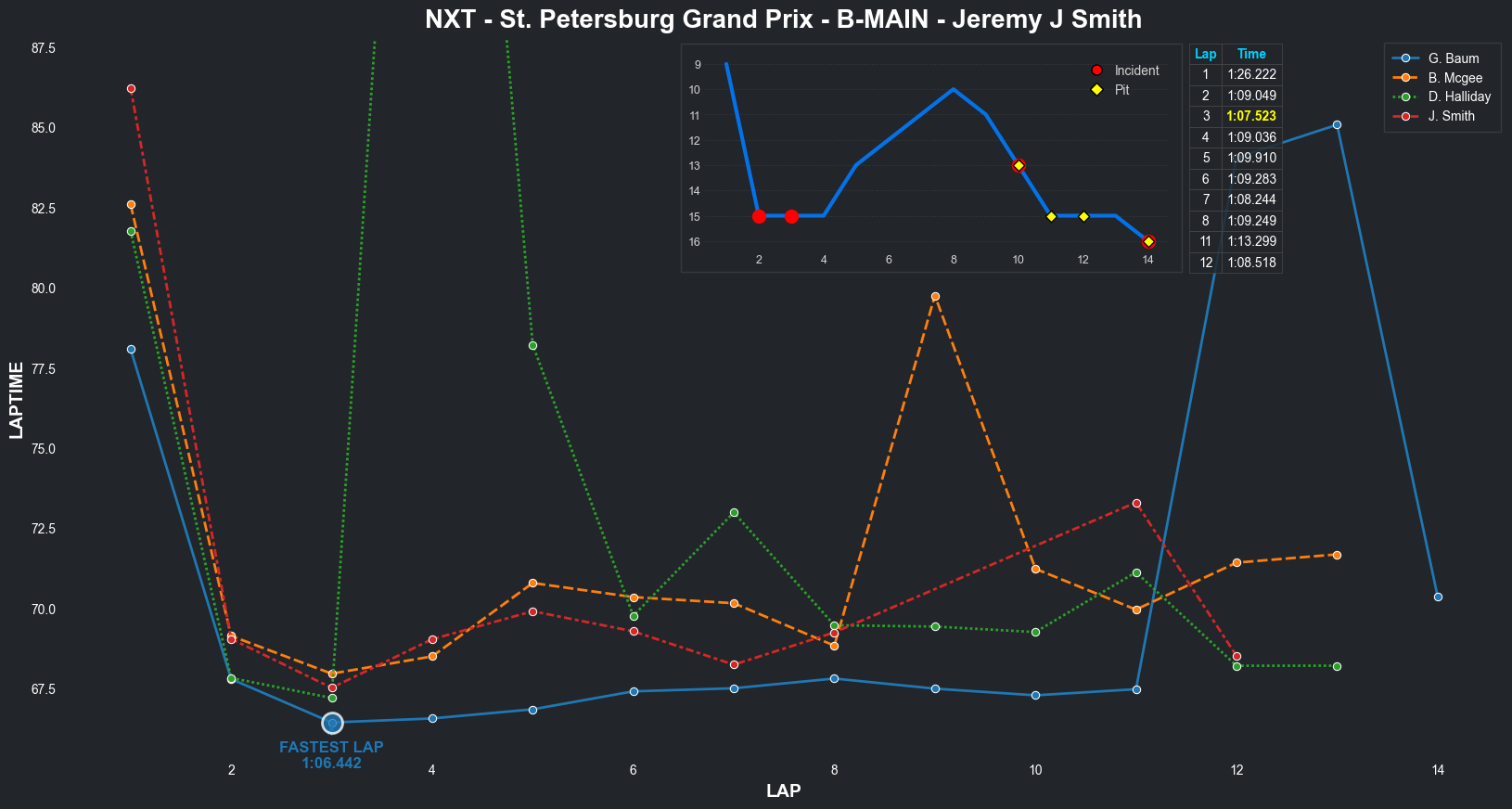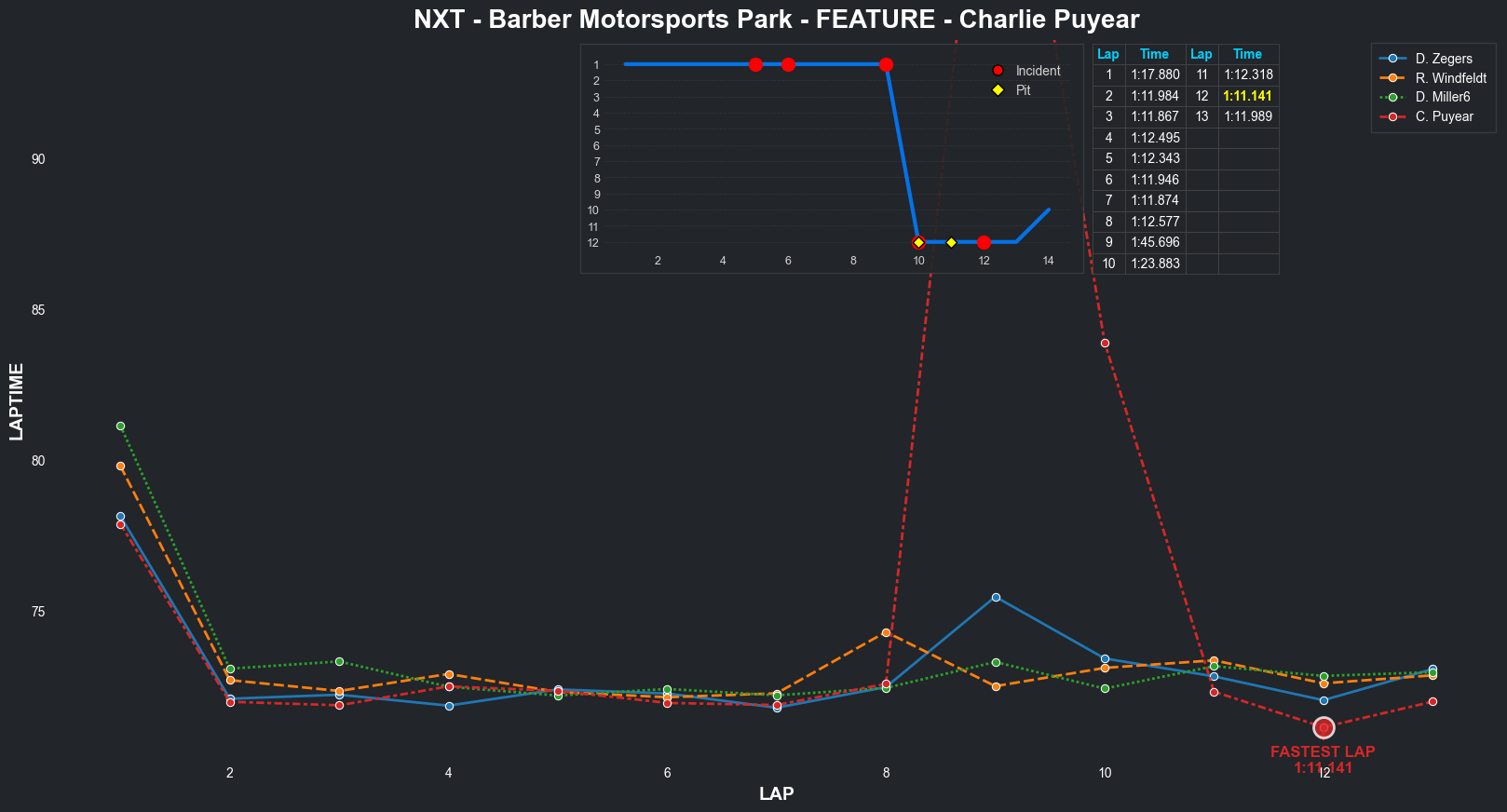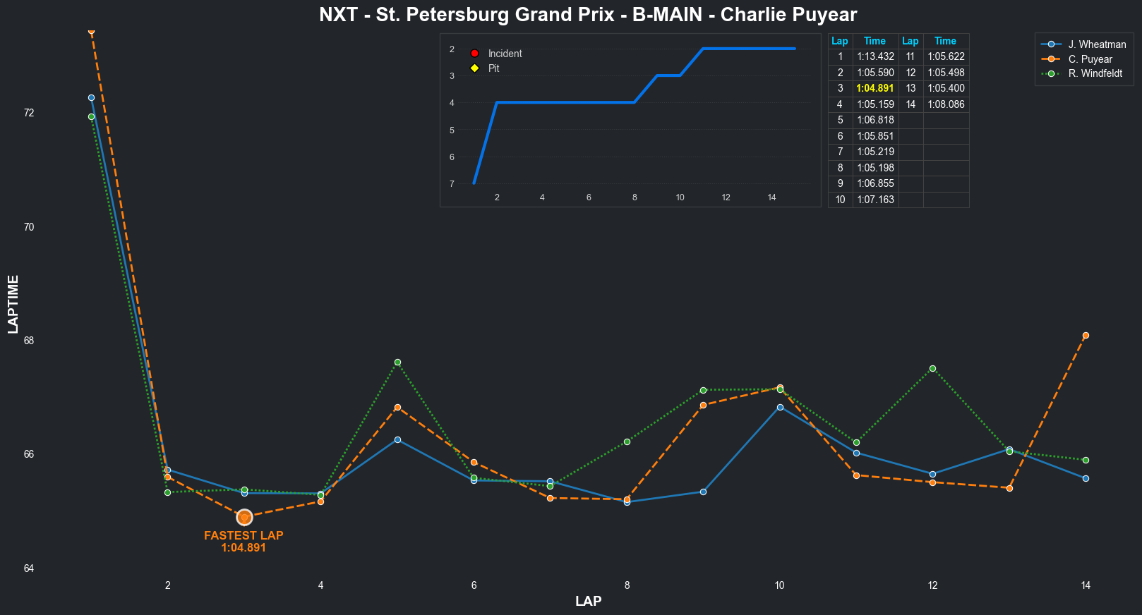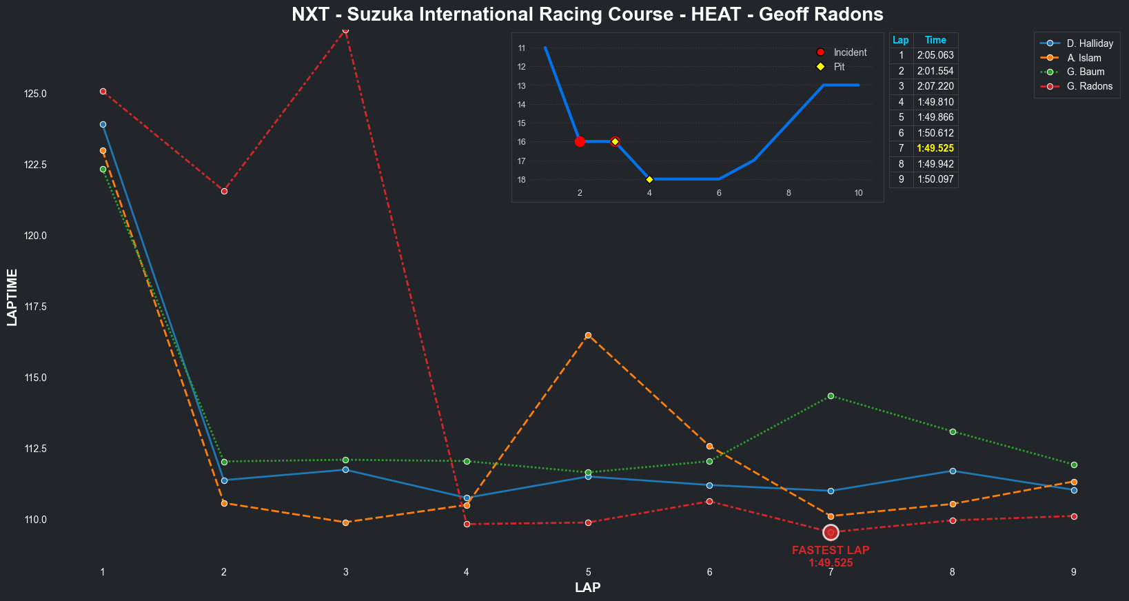 | Ryan Windfeldt | 2 | 7 | 1:15.9180 | 1:06.1079 | 1:06.1250 | 1:05.5204 | 1:05.6485 | 1:05.4550 | 1:05.9713 | 1:05.7870 | 1:06.7194 | 1:06.2238 | 1:05.8178 | 1:06.1650 | 1:07.2425 | 1:06.8586 | 0 | 14 |