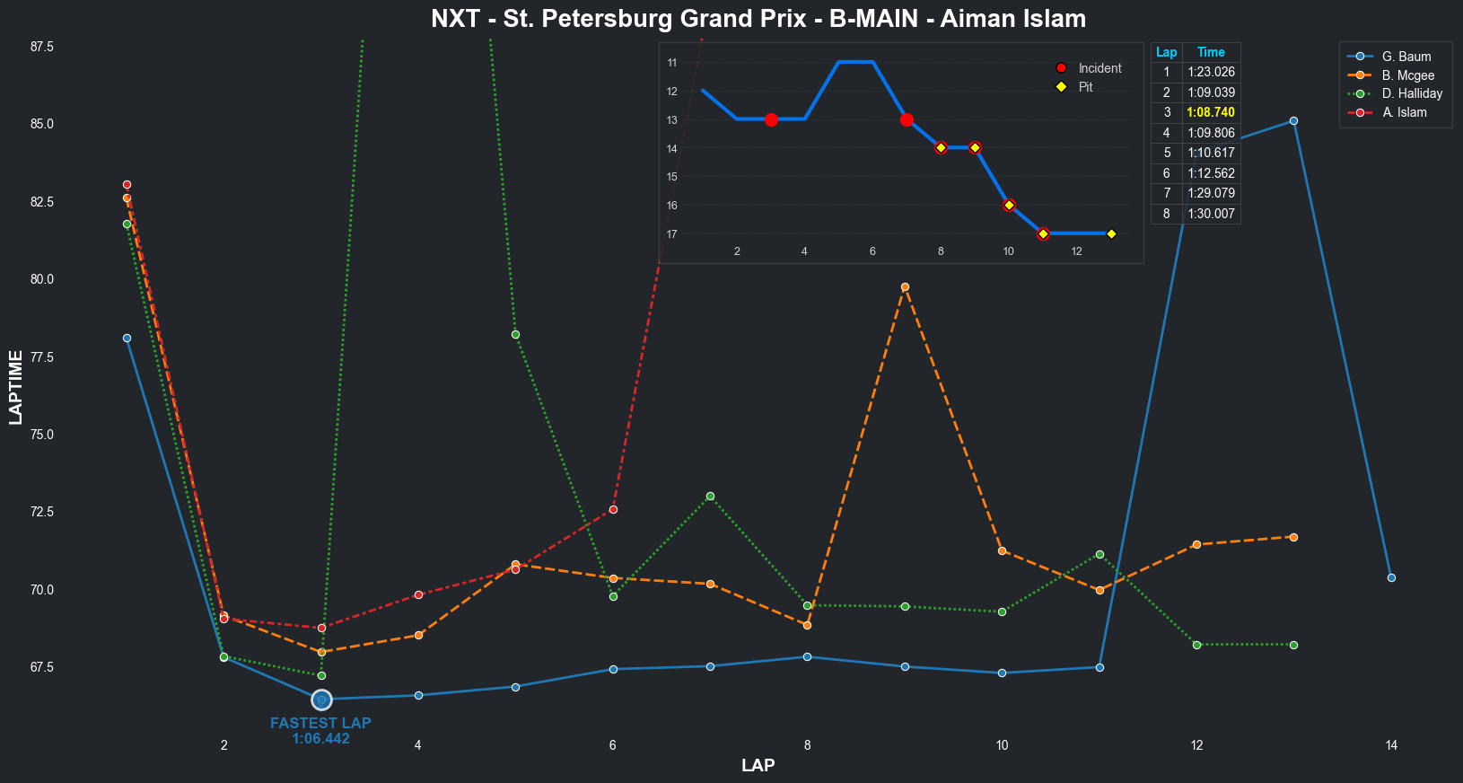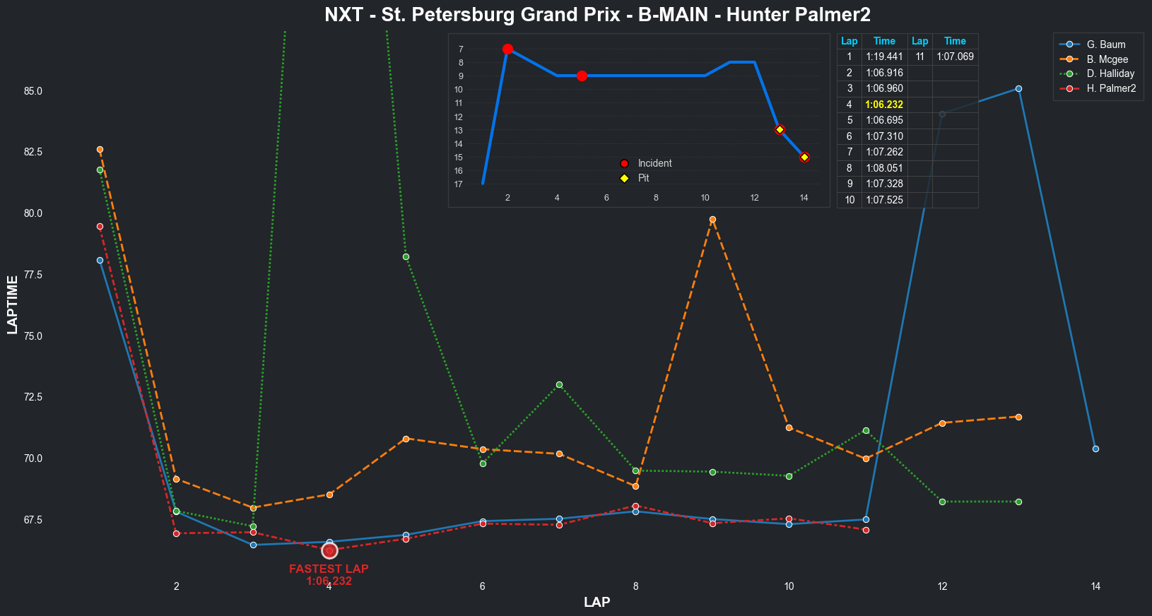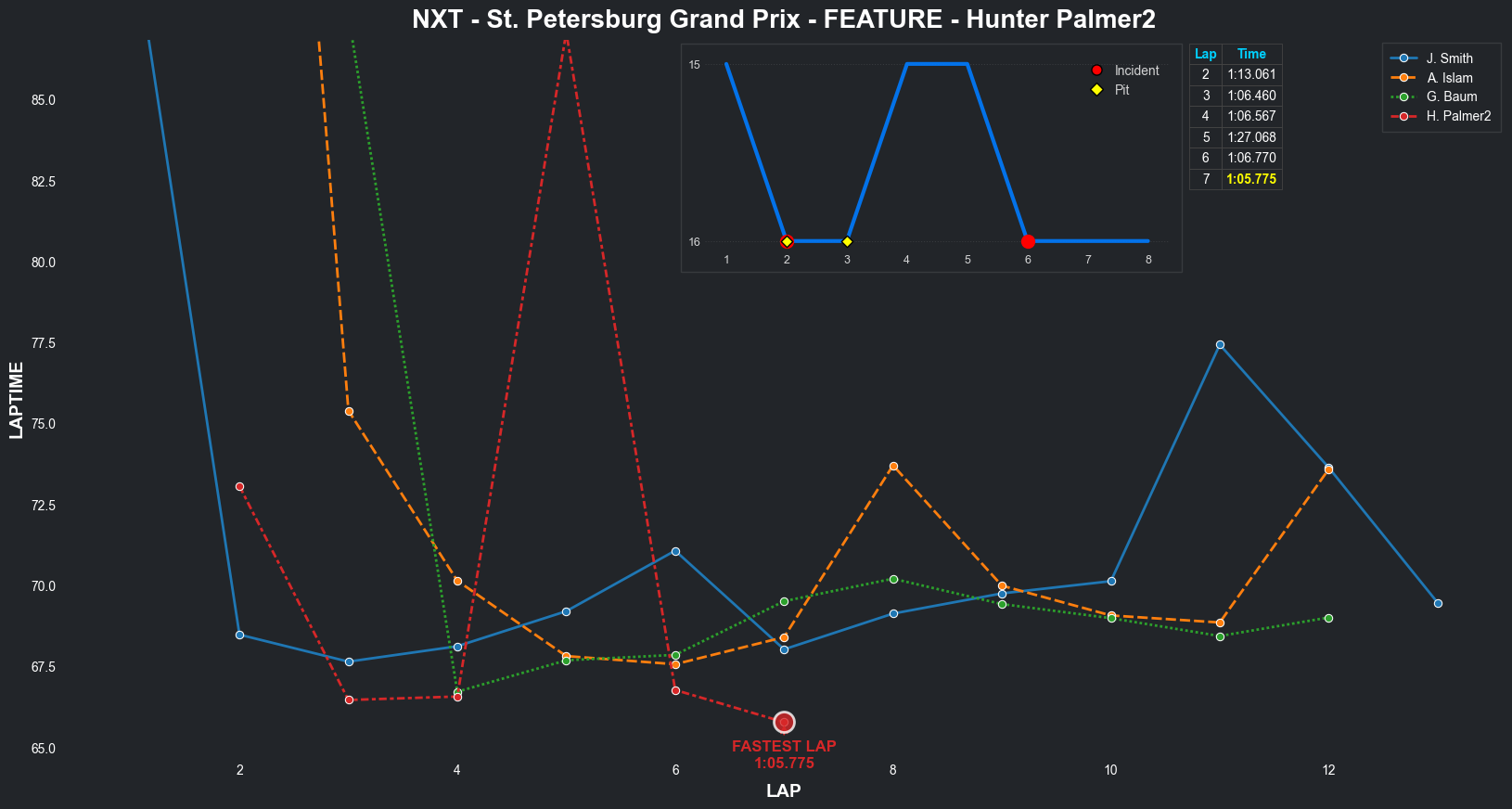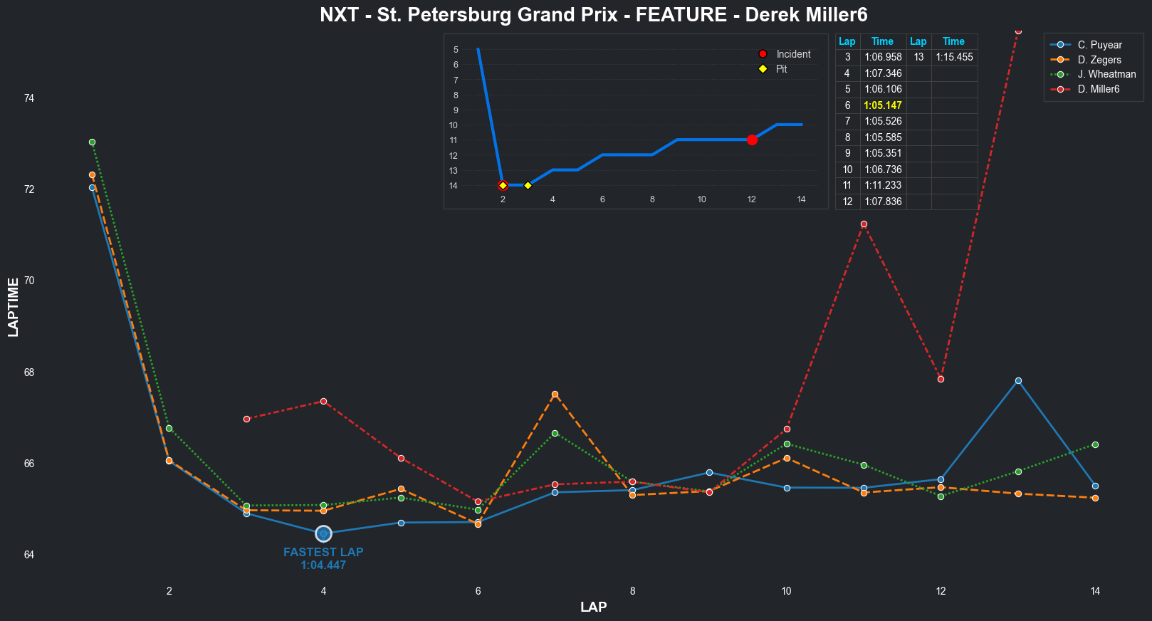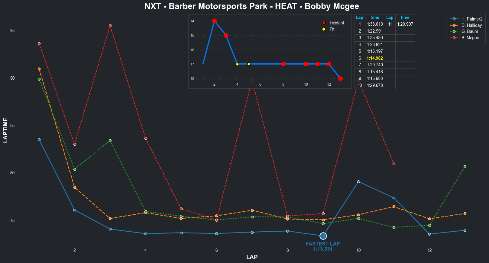 | Ryan Windfeldt | 2 | 7 | 1:15.9180 | 1:06.1079 | 1:06.1250 | 1:05.5204 | 1:05.6485 | 1:05.4550 | 1:05.9713 | 1:05.7870 | 1:06.7194 | 1:06.2238 | 1:05.8178 | 1:06.1650 | 1:07.2425 | 1:06.8586 | 0 | 14 |