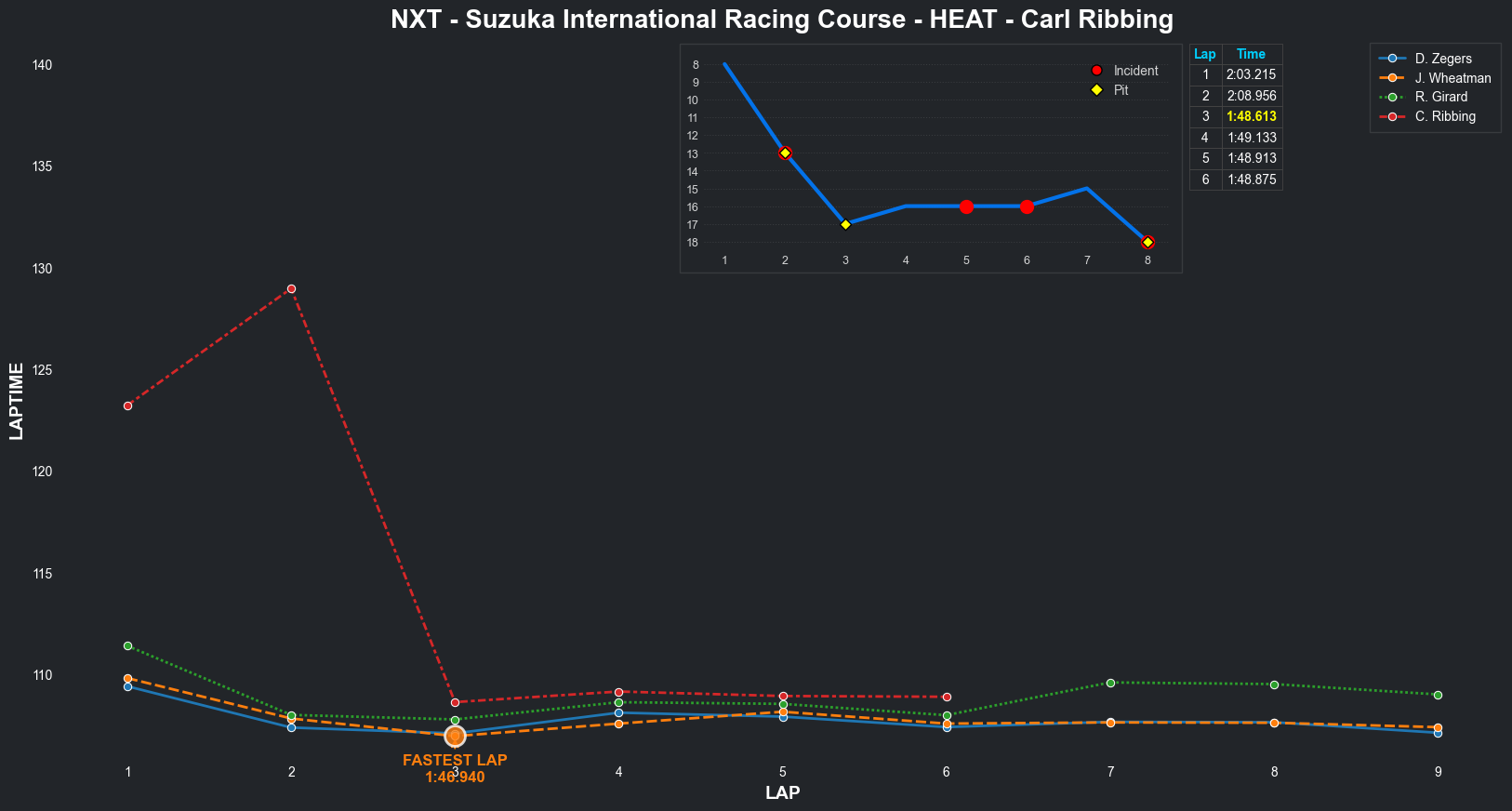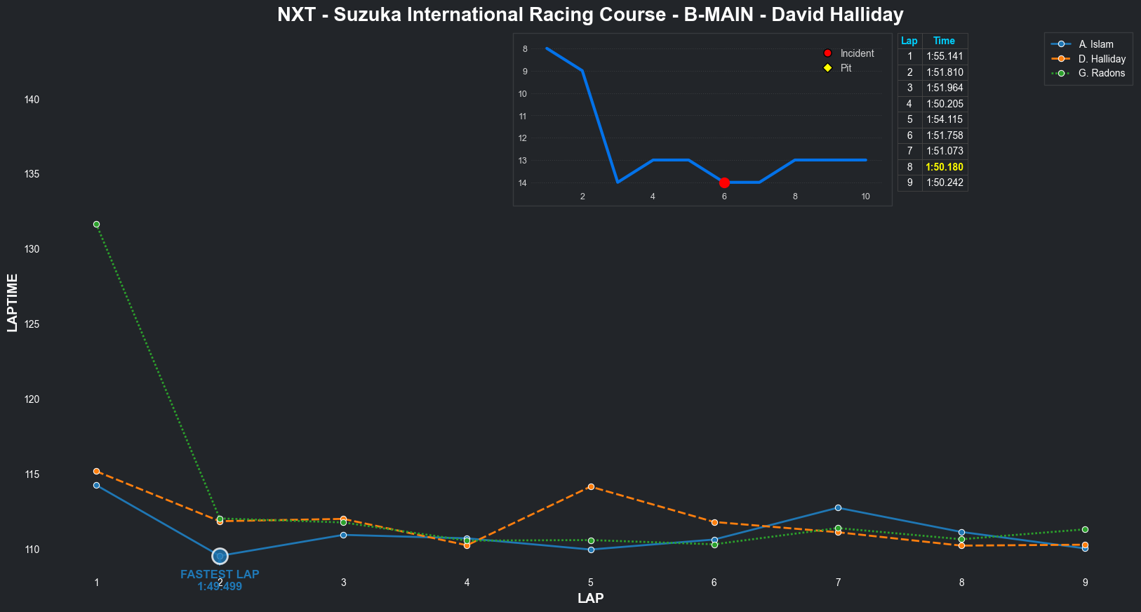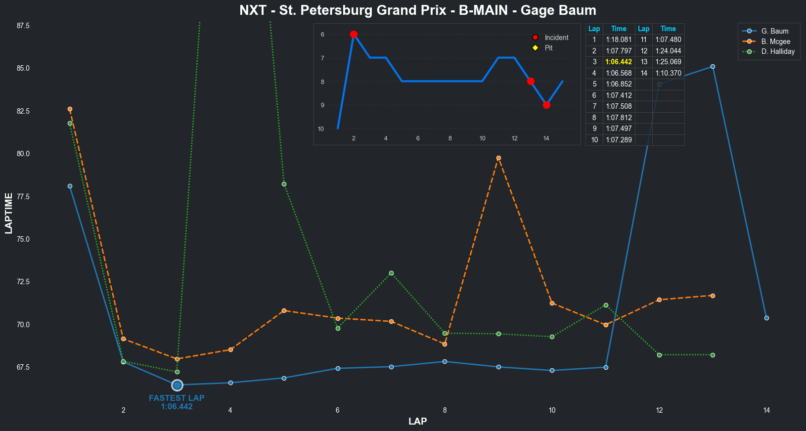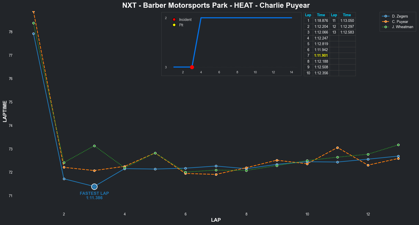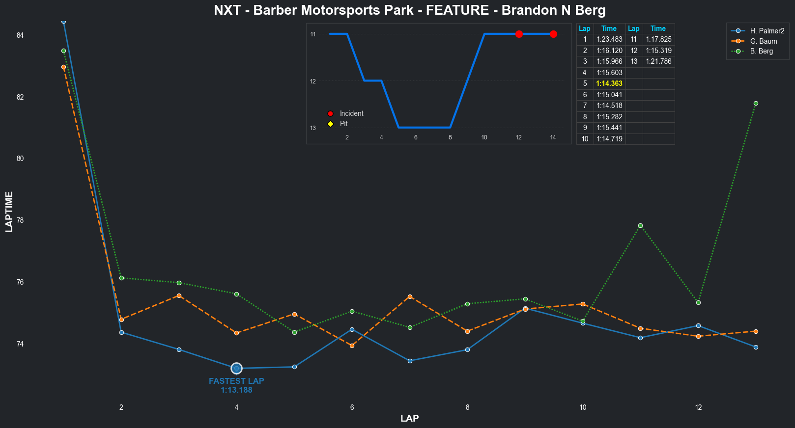 | Ryan Windfeldt | 2 | 7 | 1:15.9180 | 1:06.1079 | 1:06.1250 | 1:05.5204 | 1:05.6485 | 1:05.4550 | 1:05.9713 | 1:05.7870 | 1:06.7194 | 1:06.2238 | 1:05.8178 | 1:06.1650 | 1:07.2425 | 1:06.8586 | 0 | 14 |