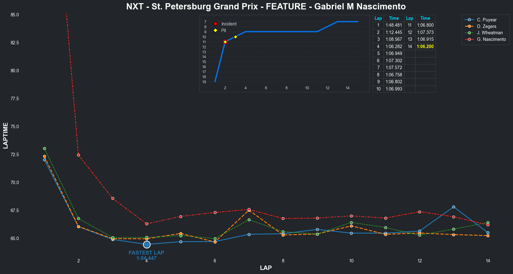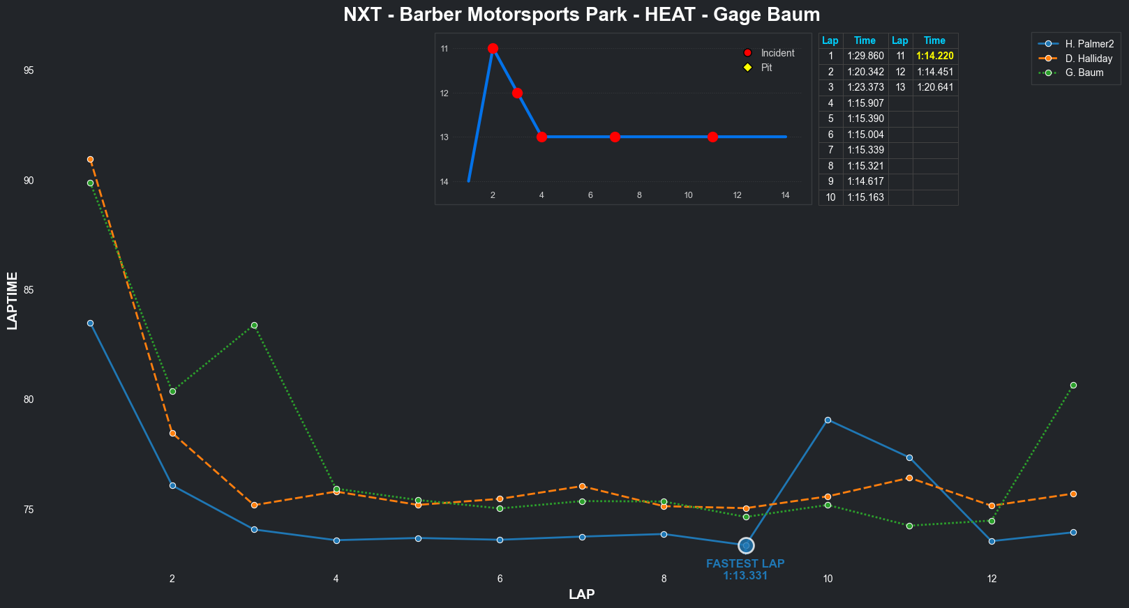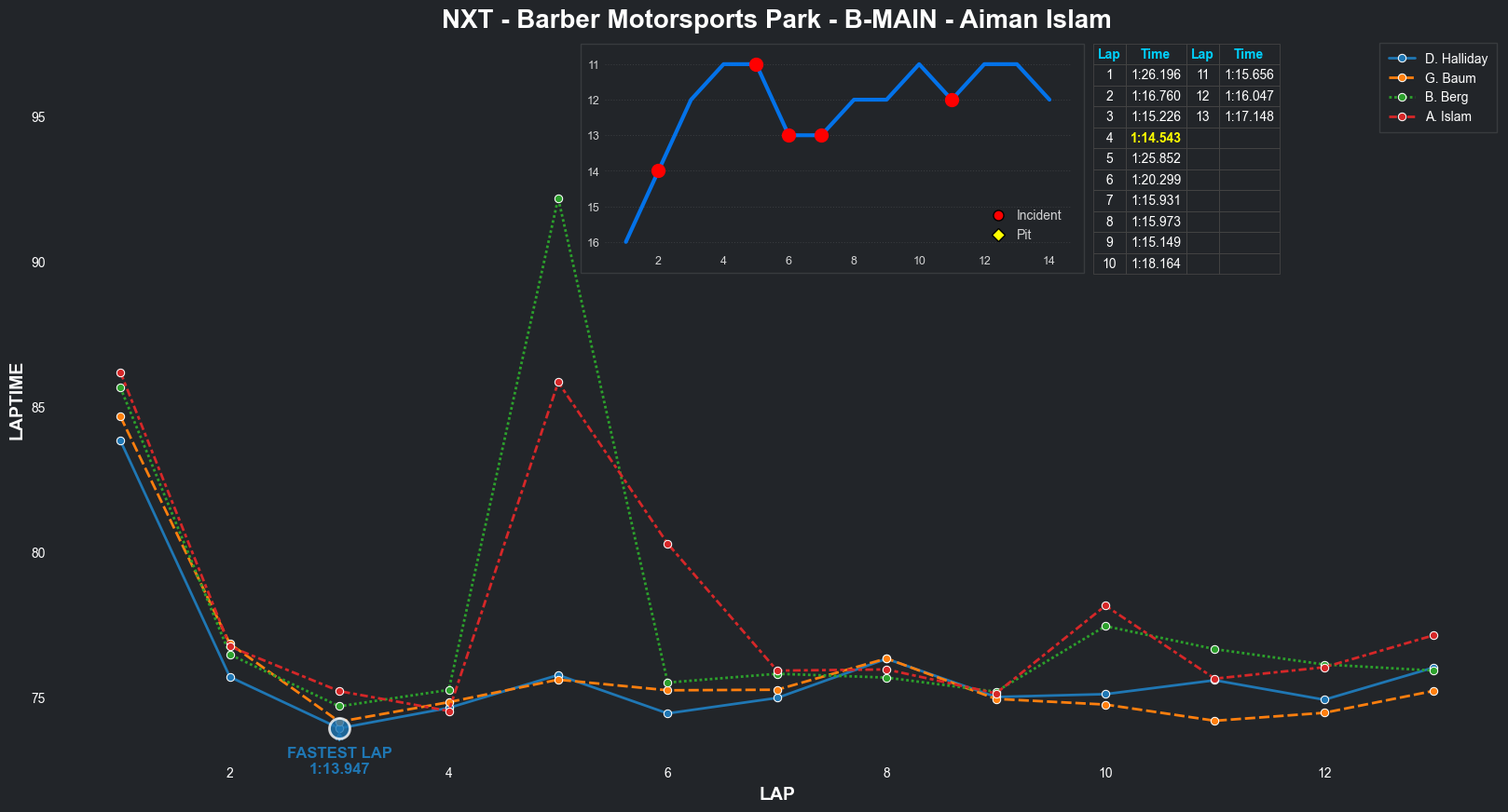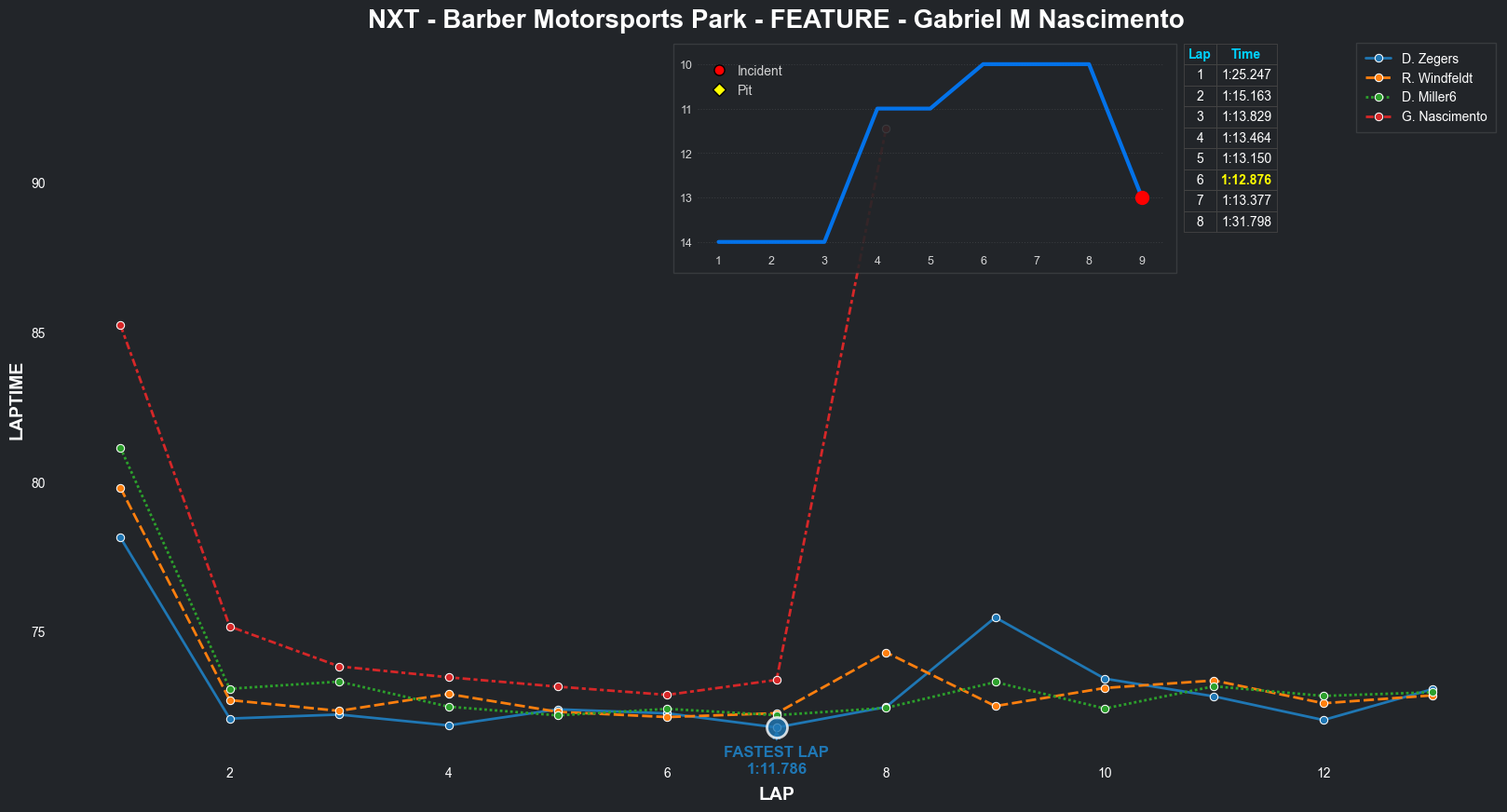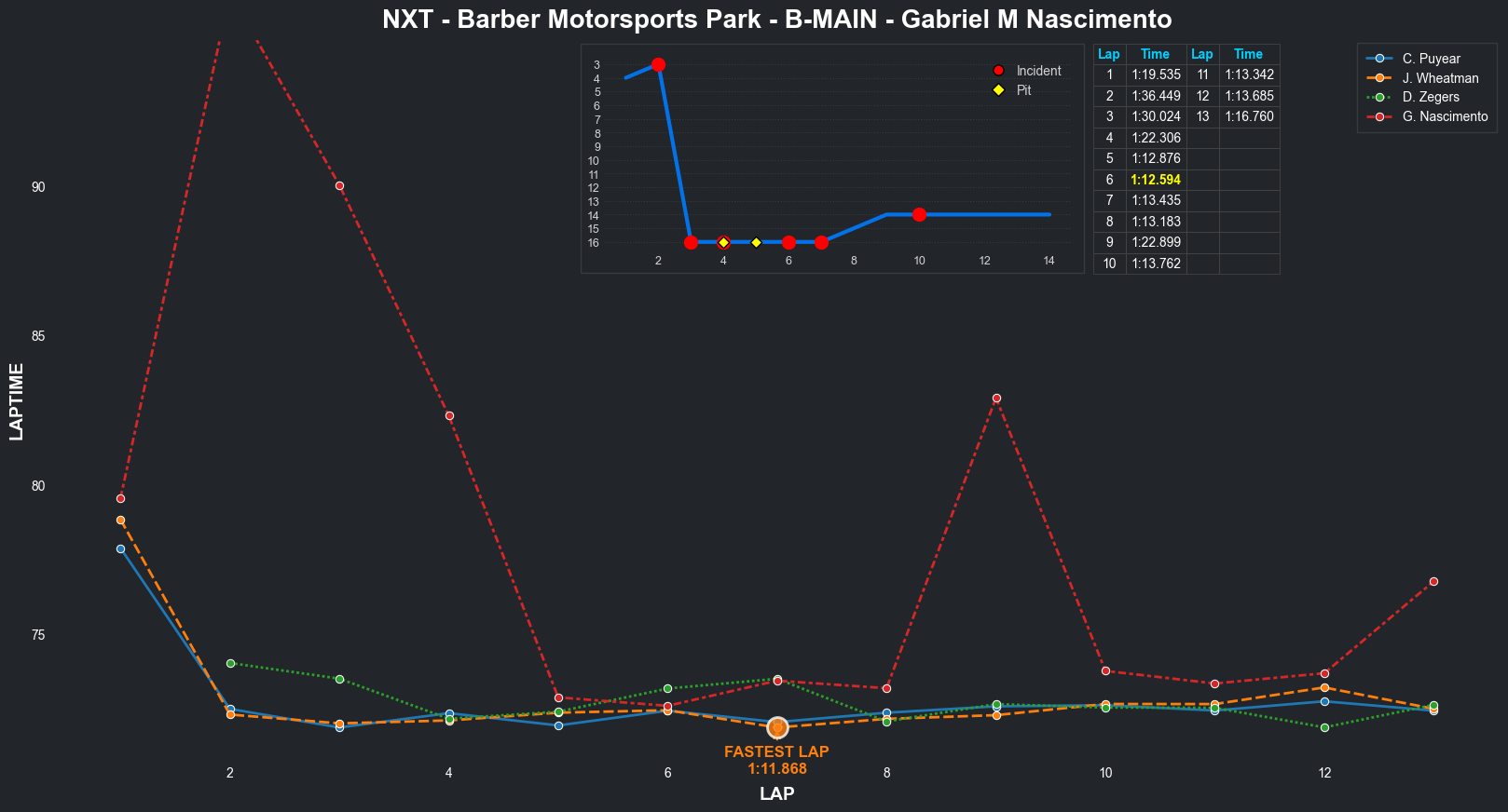 | Ryan Windfeldt | 2 | 7 | 1:15.9180 | 1:06.1079 | 1:06.1250 | 1:05.5204 | 1:05.6485 | 1:05.4550 | 1:05.9713 | 1:05.7870 | 1:06.7194 | 1:06.2238 | 1:05.8178 | 1:06.1650 | 1:07.2425 | 1:06.8586 | 0 | 14 |