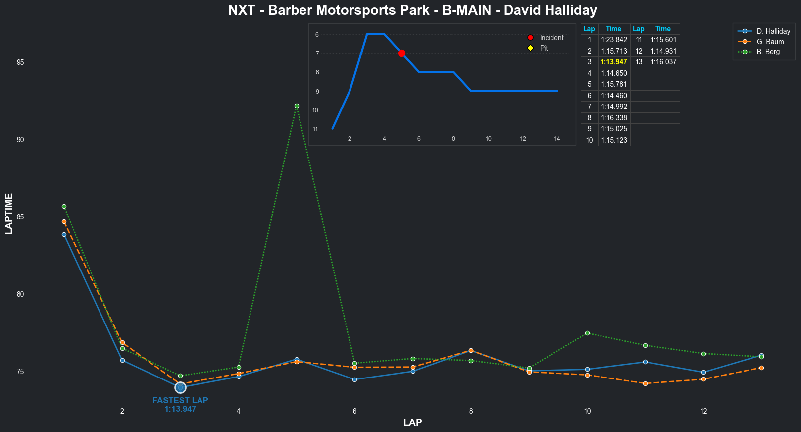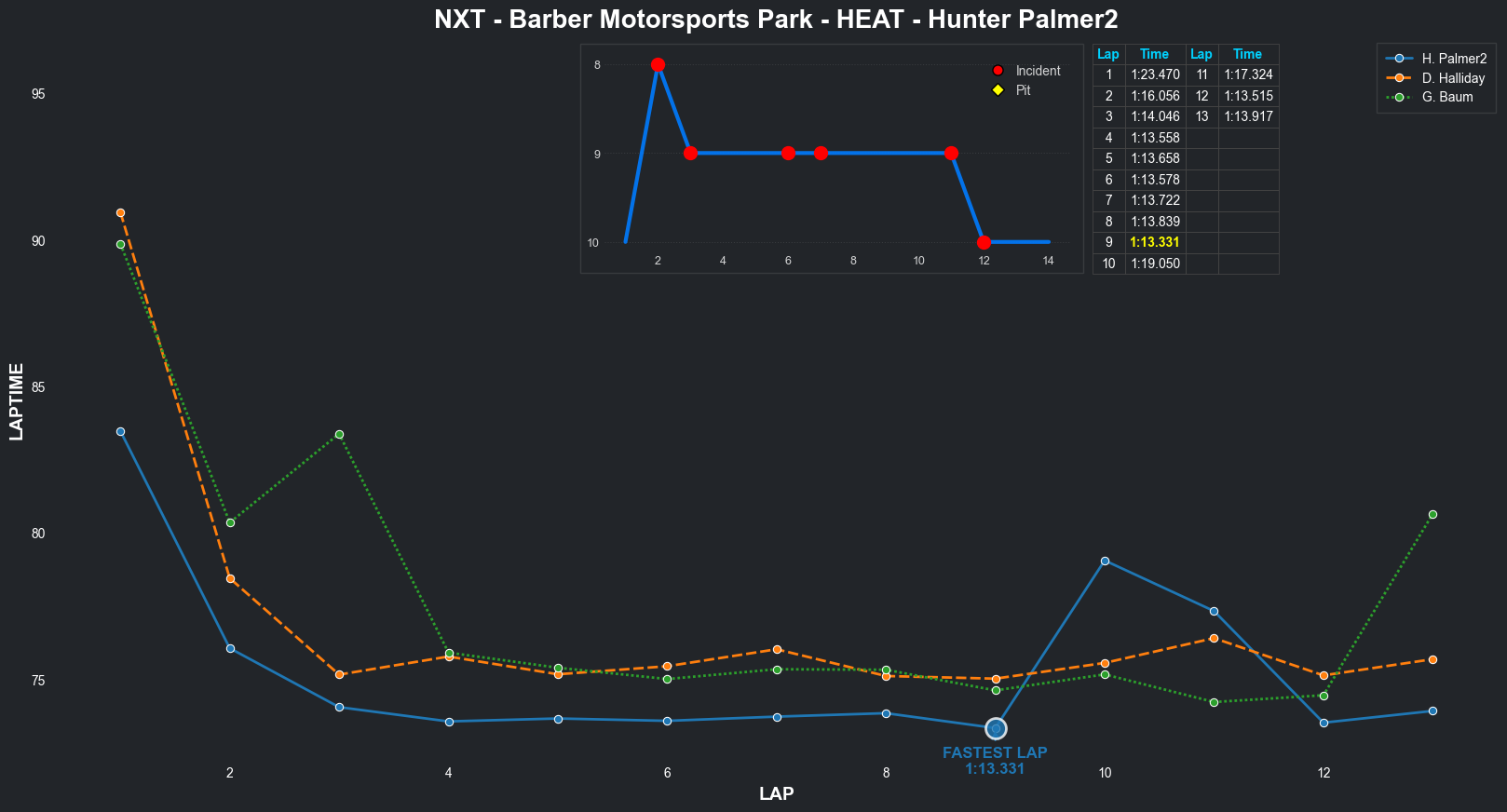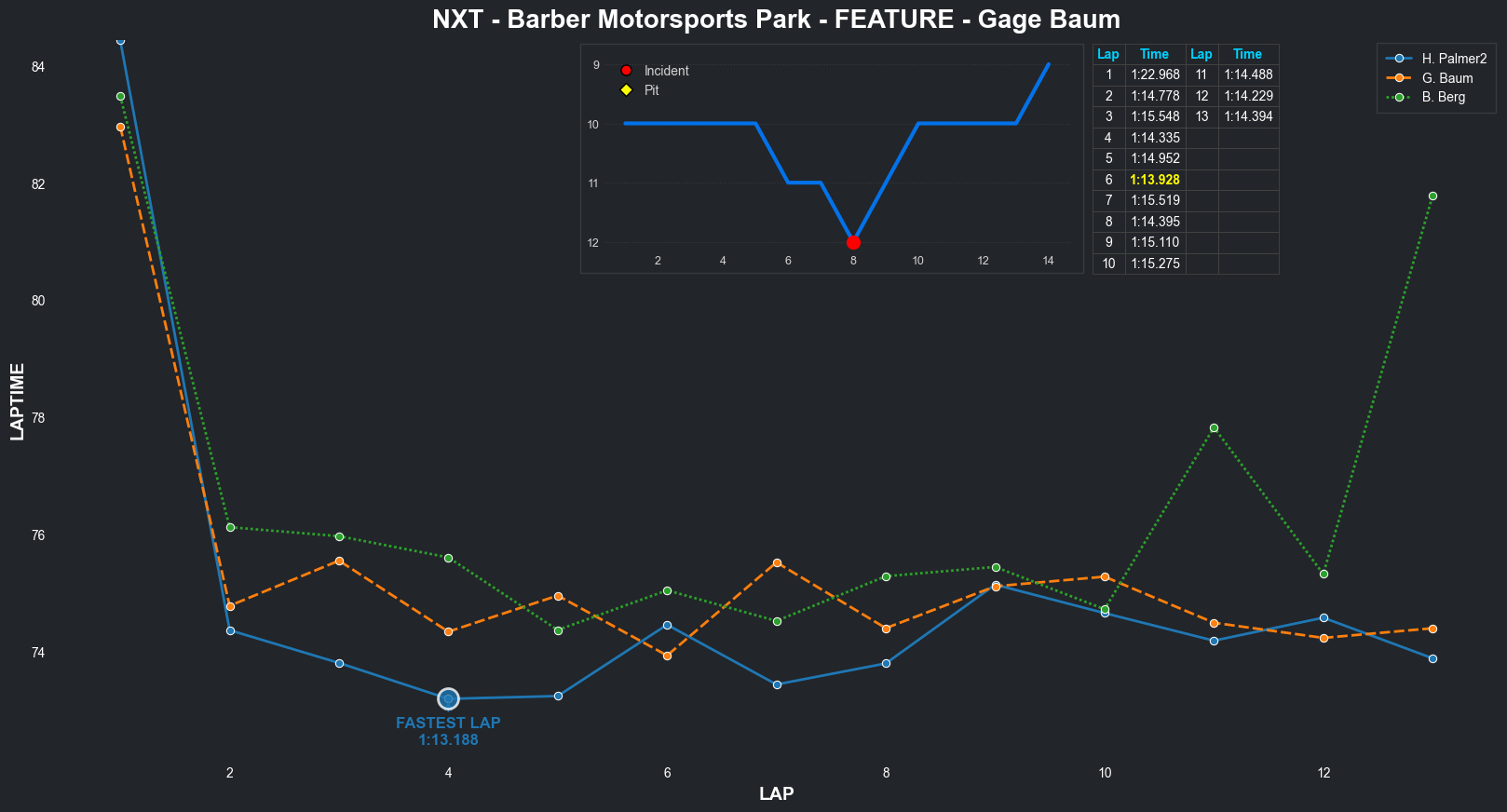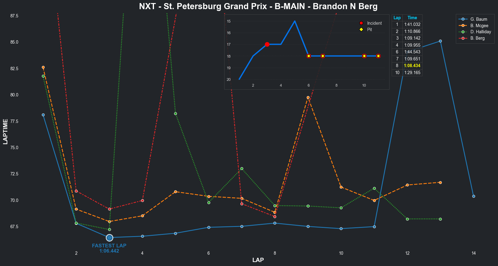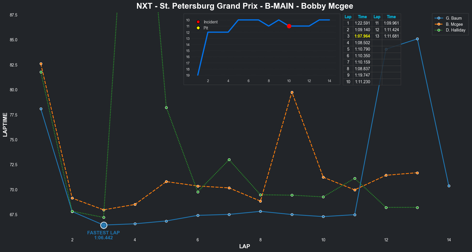 | Ryan Windfeldt | 2 | 7 | 1:15.9180 | 1:06.1079 | 1:06.1250 | 1:05.5204 | 1:05.6485 | 1:05.4550 | 1:05.9713 | 1:05.7870 | 1:06.7194 | 1:06.2238 | 1:05.8178 | 1:06.1650 | 1:07.2425 | 1:06.8586 | 0 | 14 |