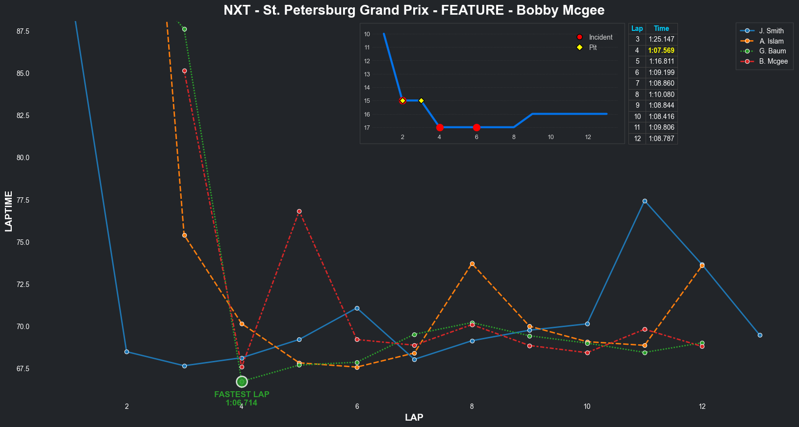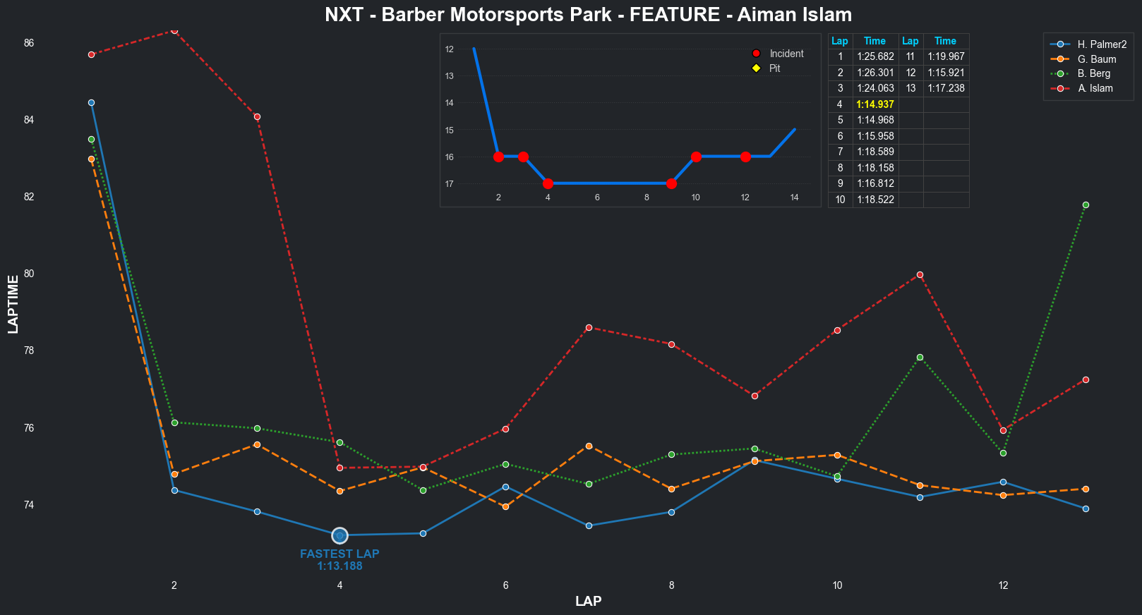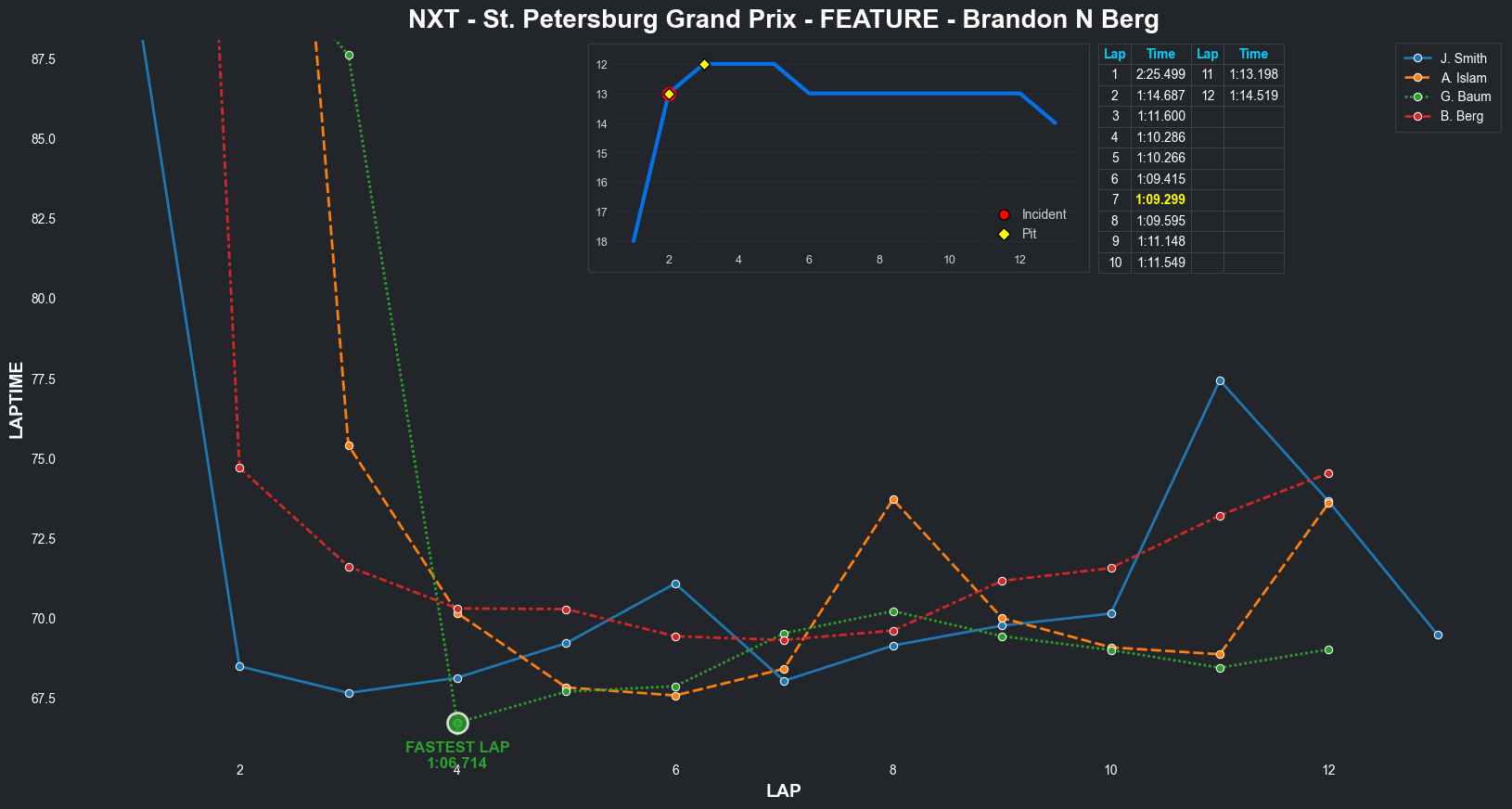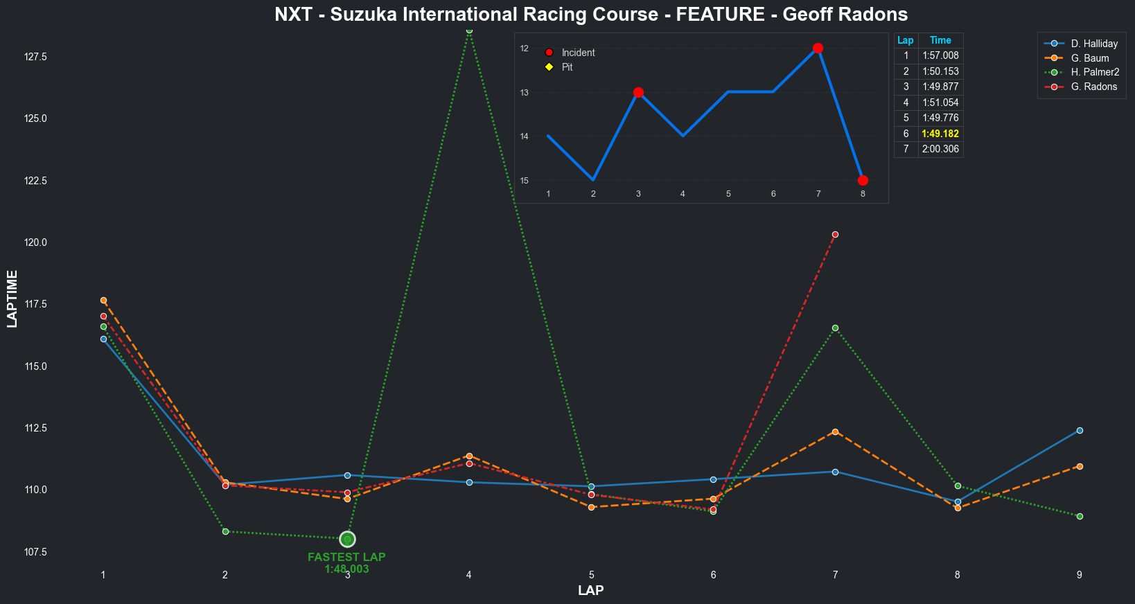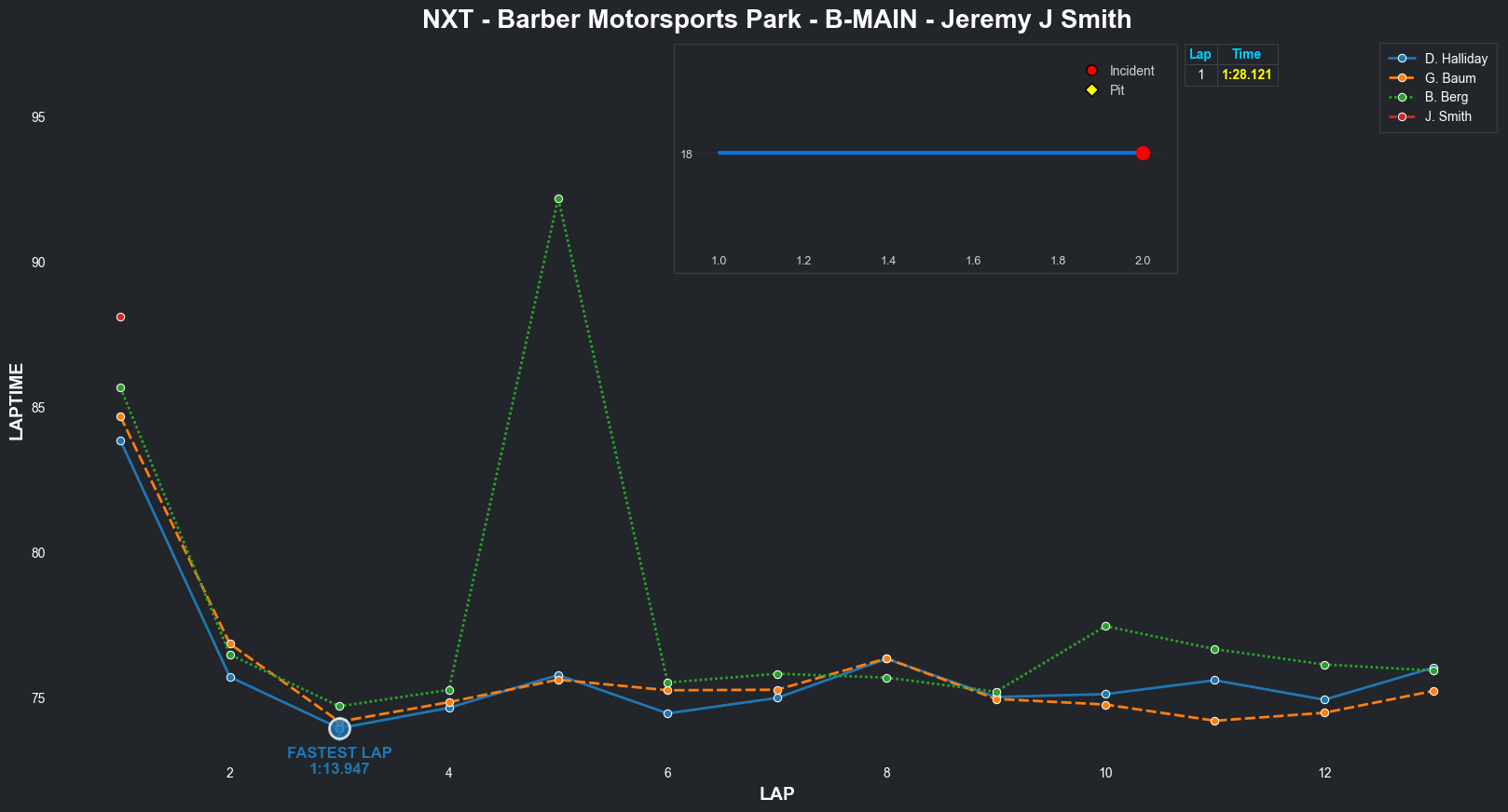 | Ryan Windfeldt | 2 | 7 | 1:15.9180 | 1:06.1079 | 1:06.1250 | 1:05.5204 | 1:05.6485 | 1:05.4550 | 1:05.9713 | 1:05.7870 | 1:06.7194 | 1:06.2238 | 1:05.8178 | 1:06.1650 | 1:07.2425 | 1:06.8586 | 0 | 14 |