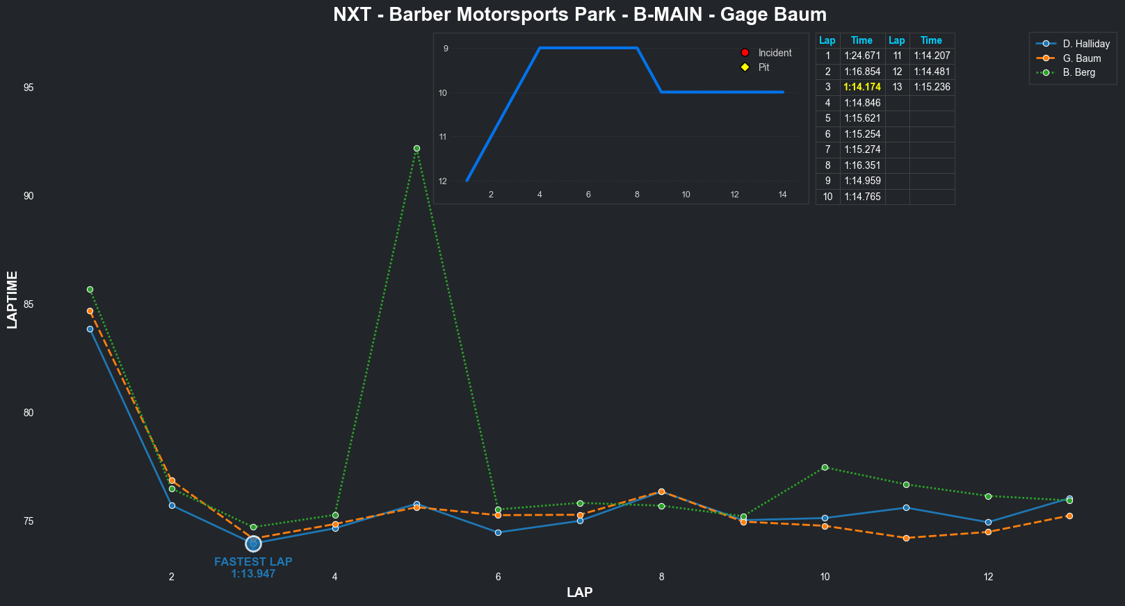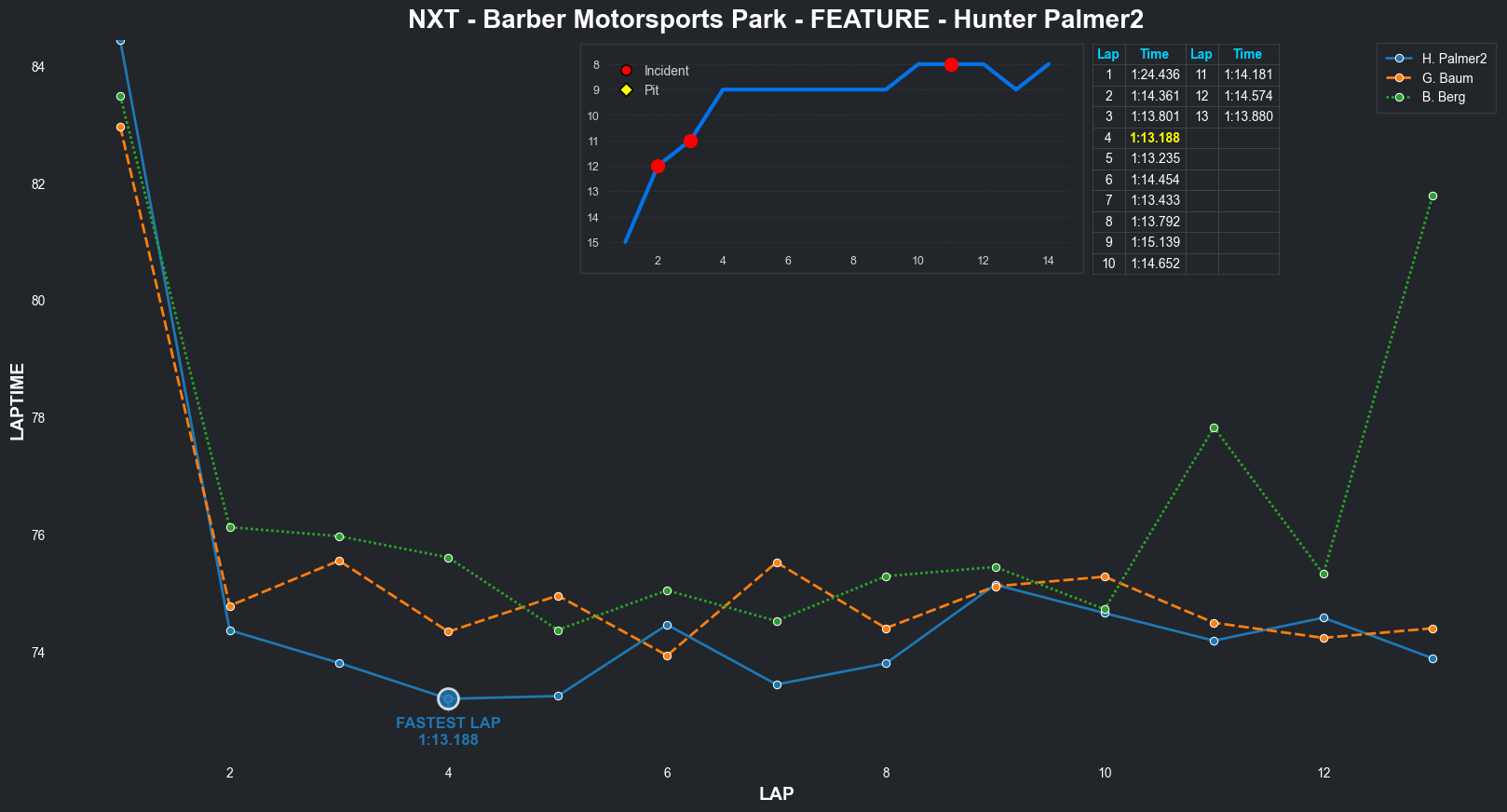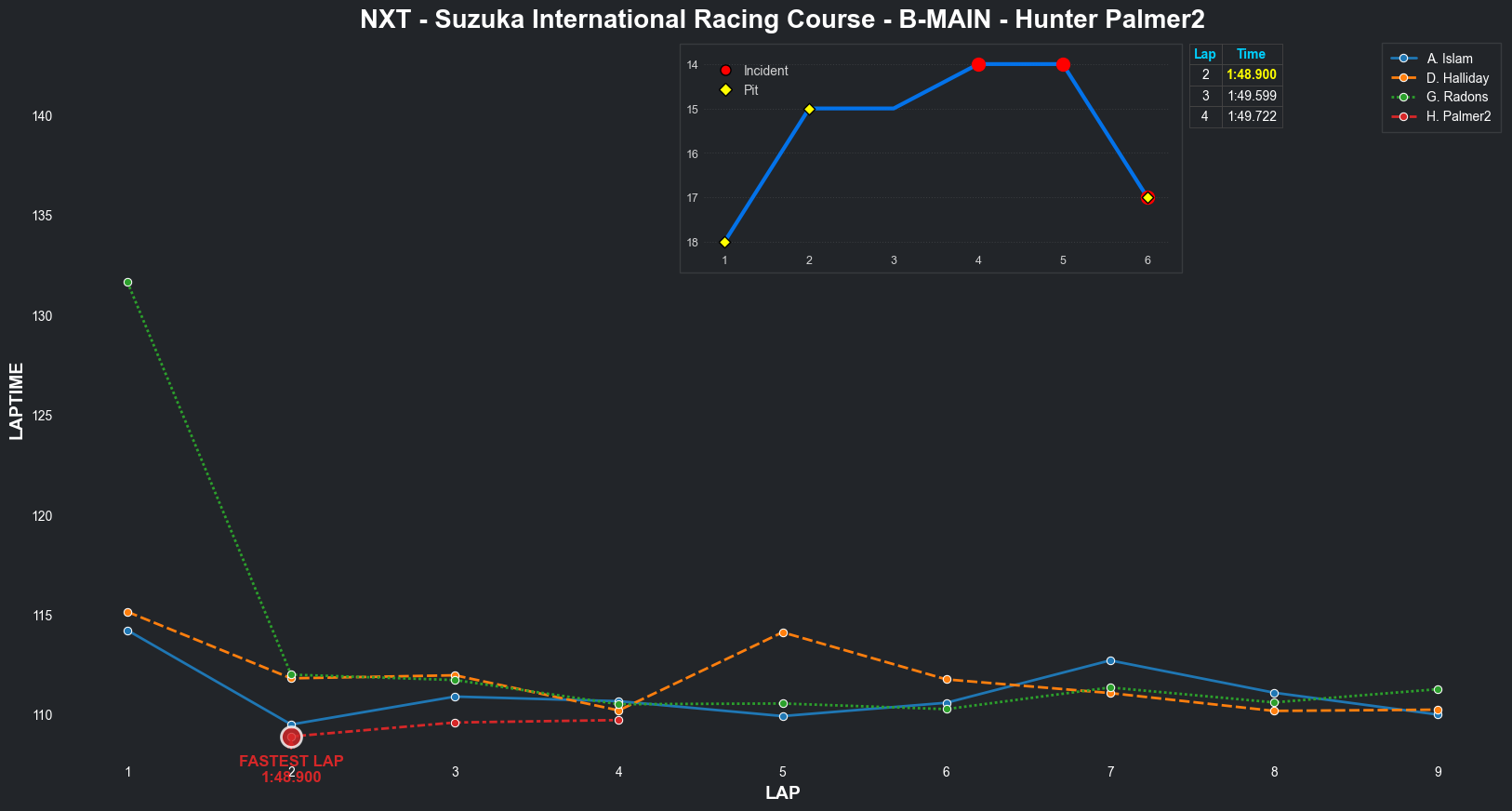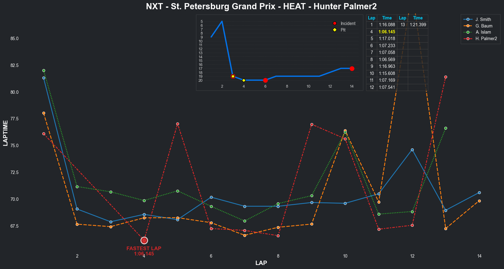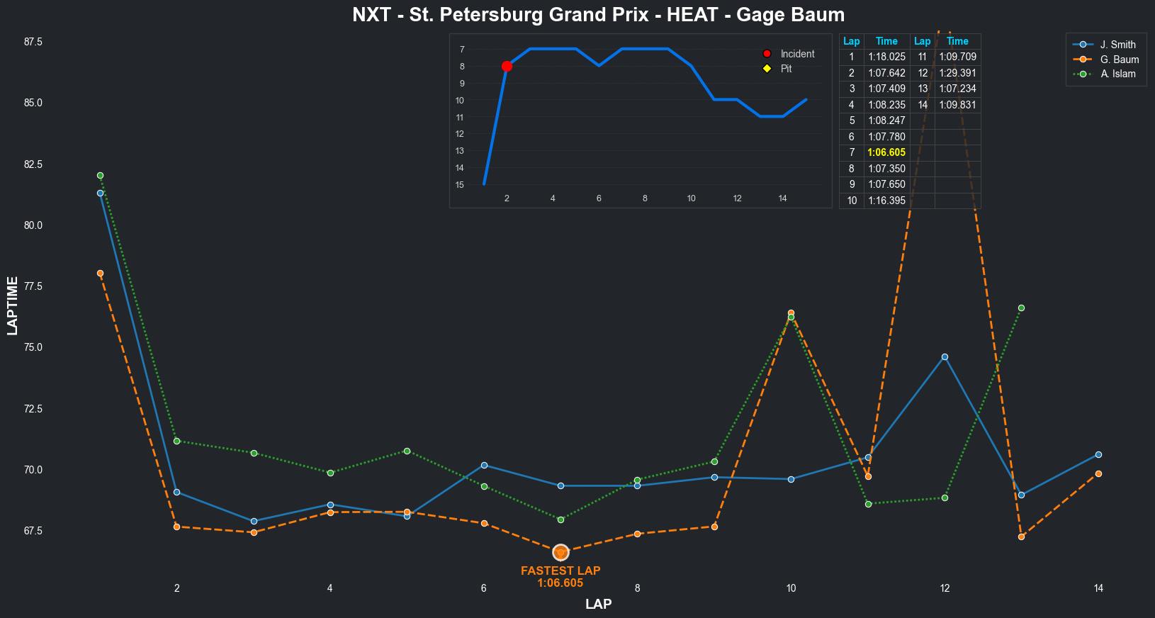 | Ryan Windfeldt | 2 | 7 | 1:15.9180 | 1:06.1079 | 1:06.1250 | 1:05.5204 | 1:05.6485 | 1:05.4550 | 1:05.9713 | 1:05.7870 | 1:06.7194 | 1:06.2238 | 1:05.8178 | 1:06.1650 | 1:07.2425 | 1:06.8586 | 0 | 14 |