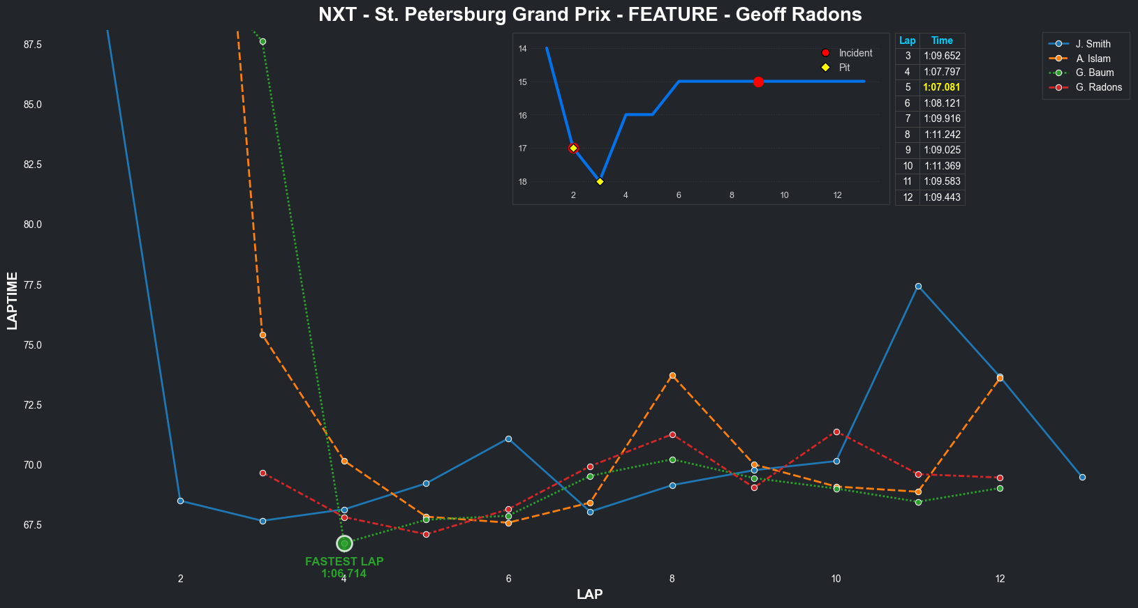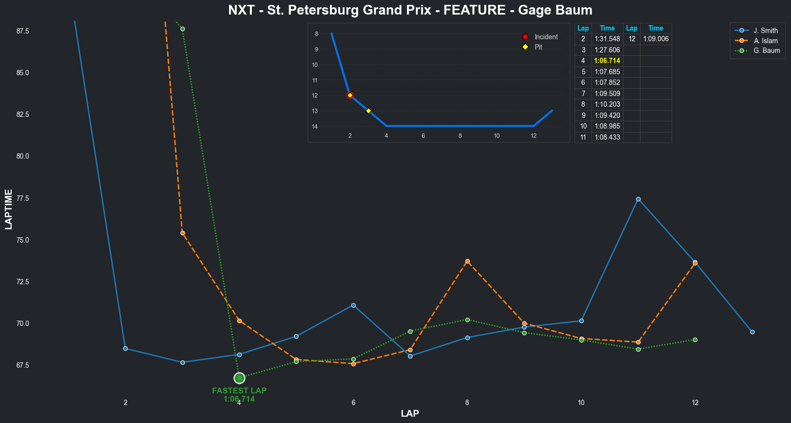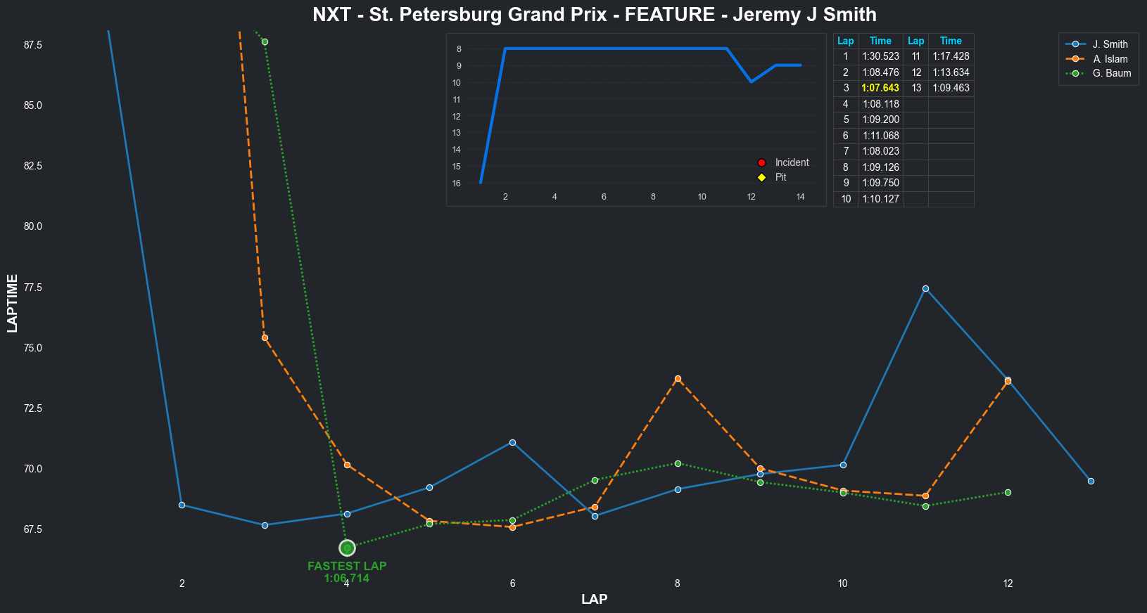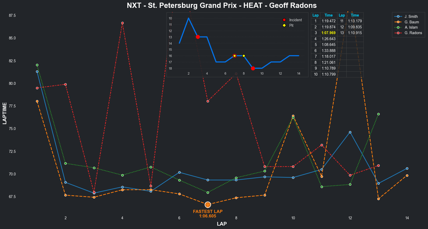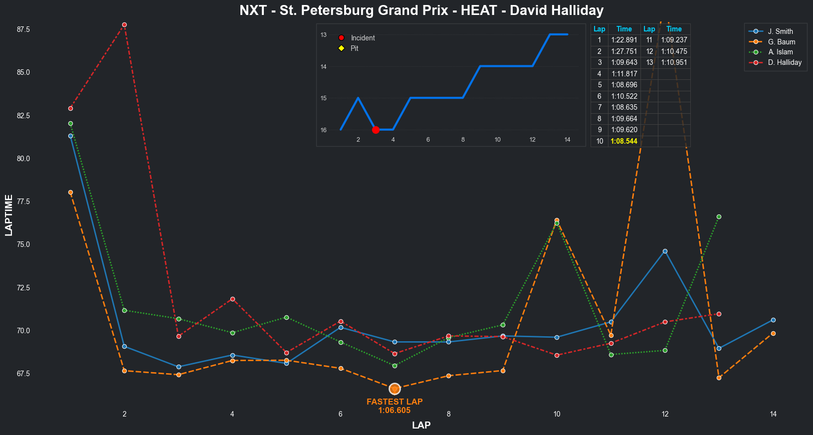 | Ryan Windfeldt | 2 | 7 | 1:15.9180 | 1:06.1079 | 1:06.1250 | 1:05.5204 | 1:05.6485 | 1:05.4550 | 1:05.9713 | 1:05.7870 | 1:06.7194 | 1:06.2238 | 1:05.8178 | 1:06.1650 | 1:07.2425 | 1:06.8586 | 0 | 14 |