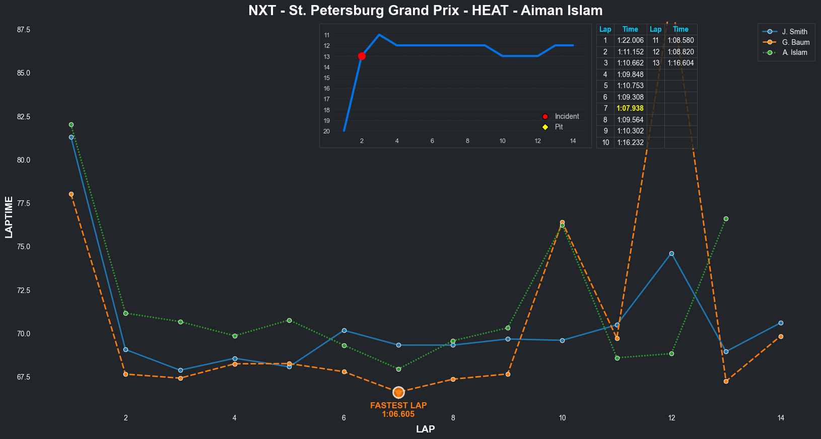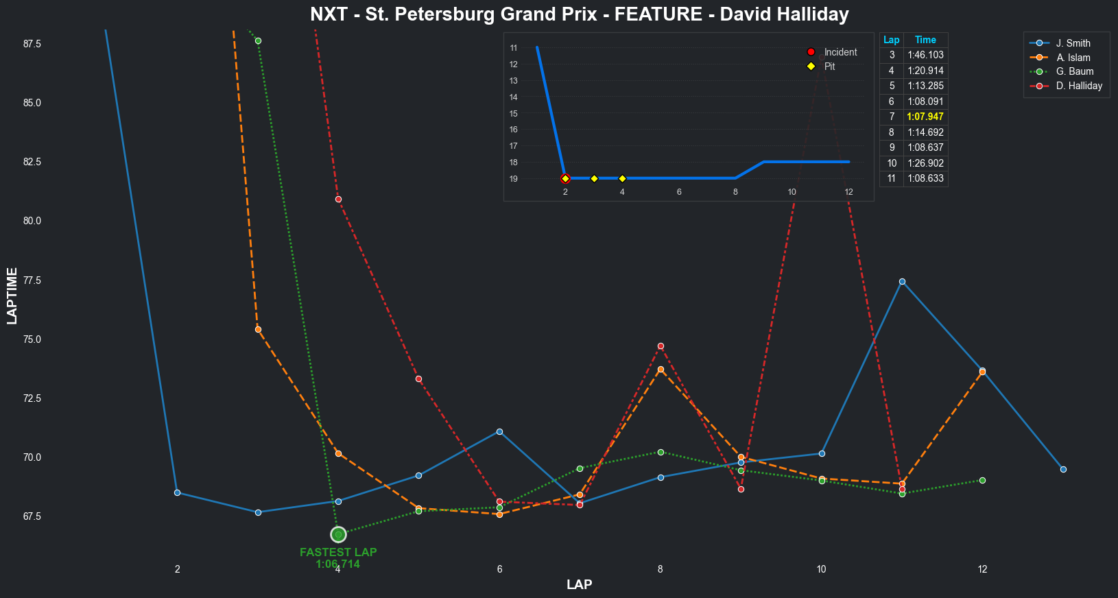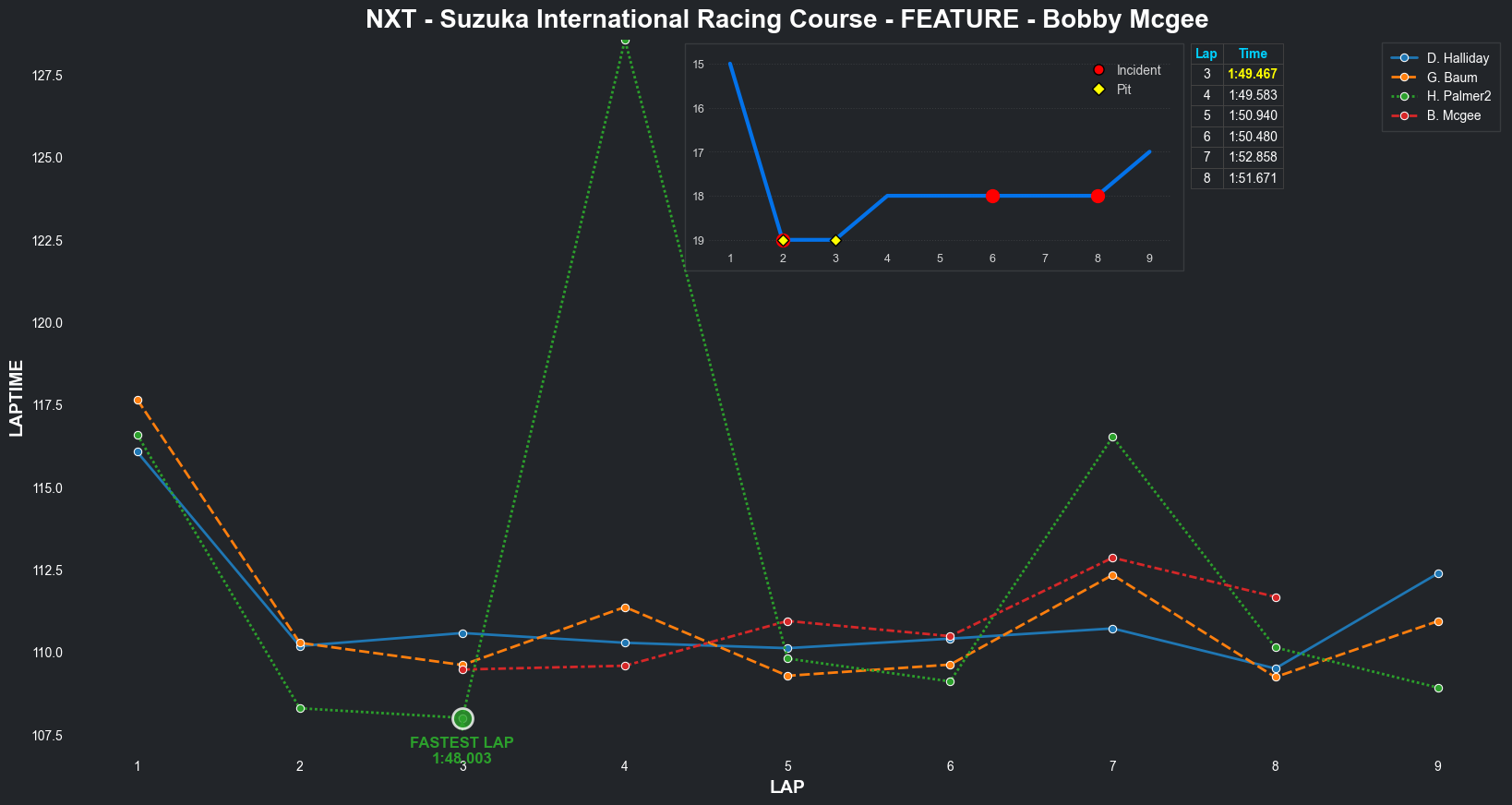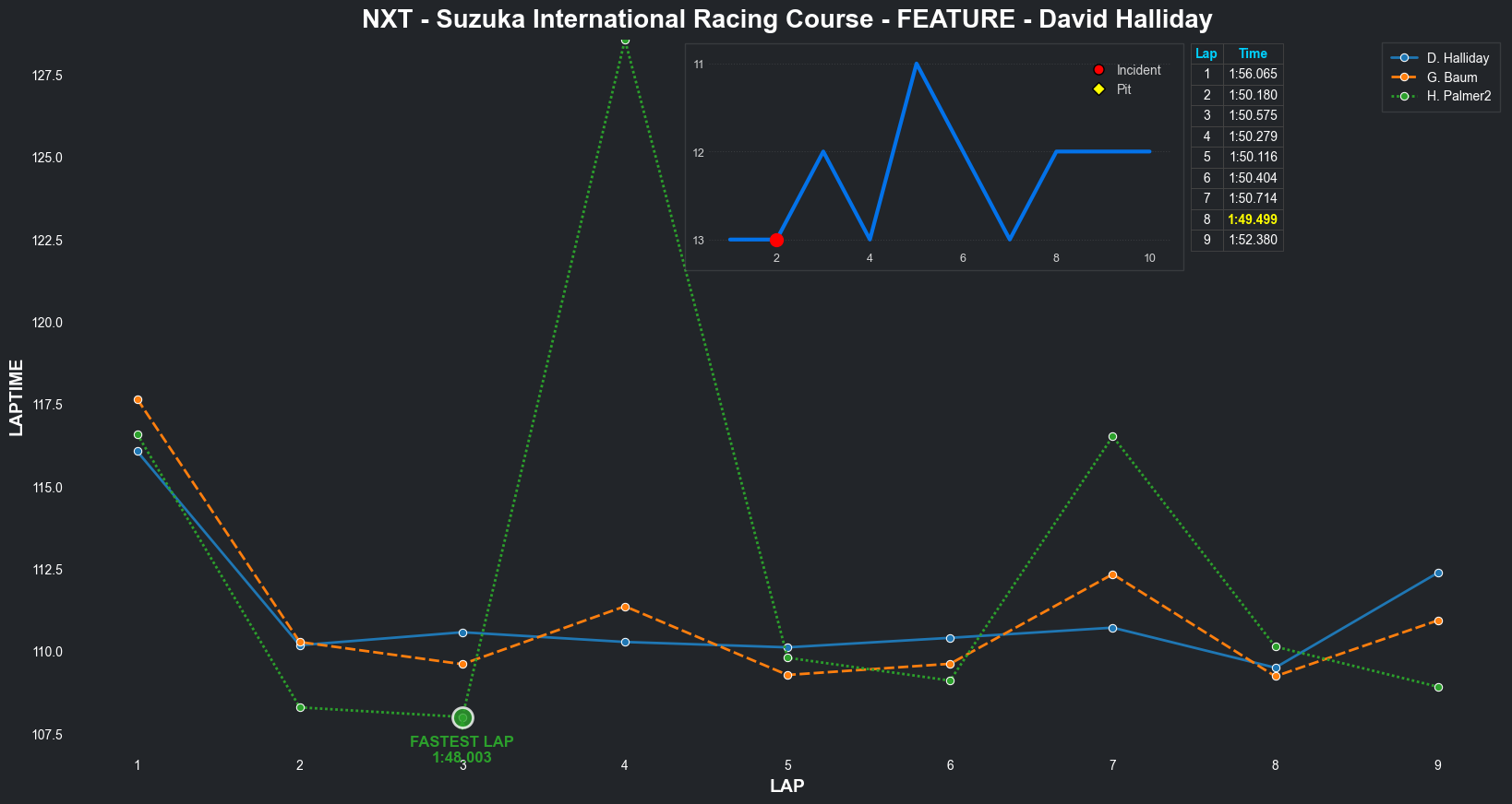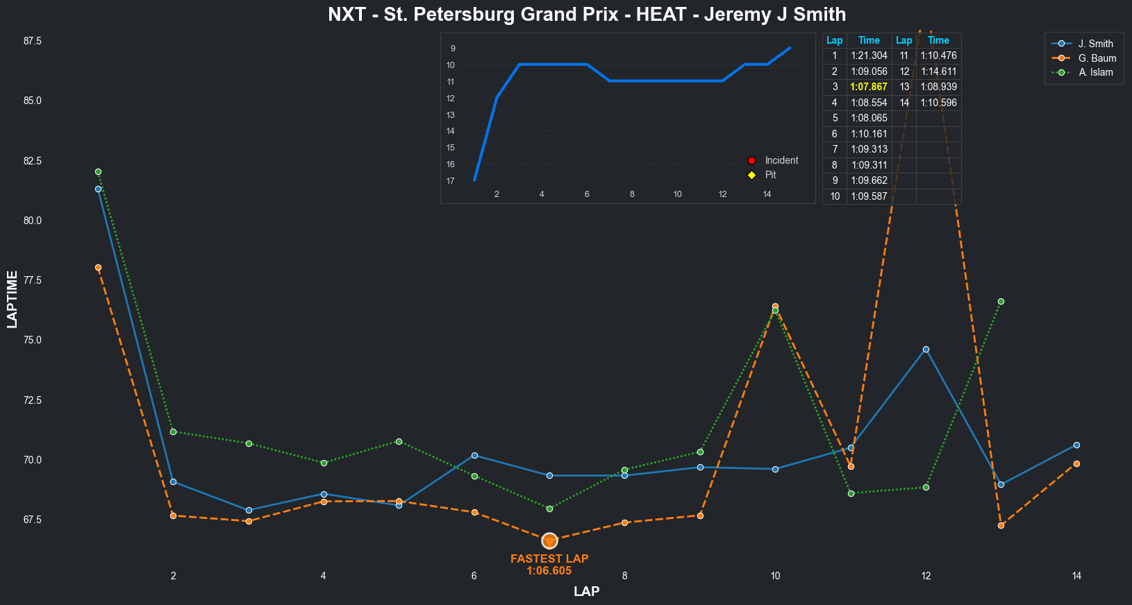 | Ryan Windfeldt | 2 | 7 | 1:15.9180 | 1:06.1079 | 1:06.1250 | 1:05.5204 | 1:05.6485 | 1:05.4550 | 1:05.9713 | 1:05.7870 | 1:06.7194 | 1:06.2238 | 1:05.8178 | 1:06.1650 | 1:07.2425 | 1:06.8586 | 0 | 14 |