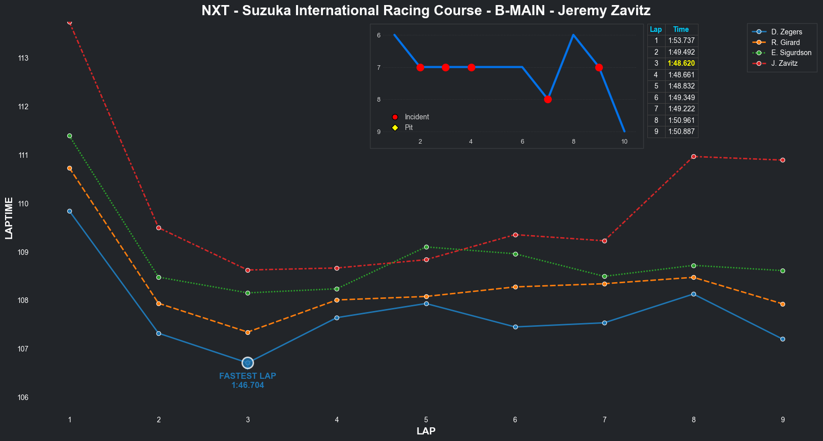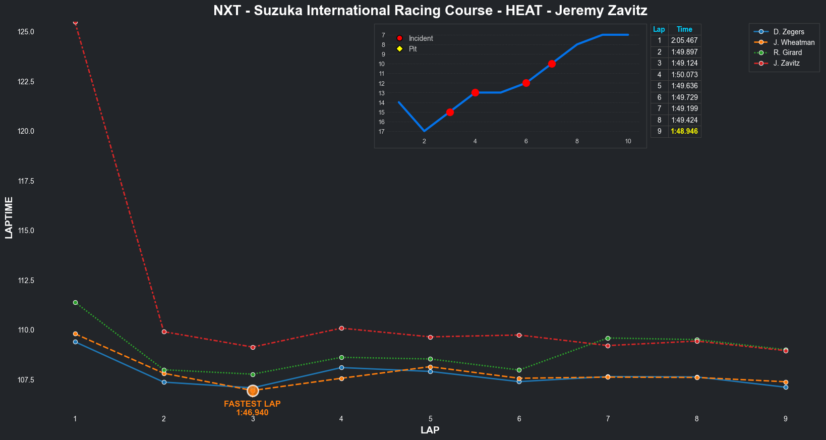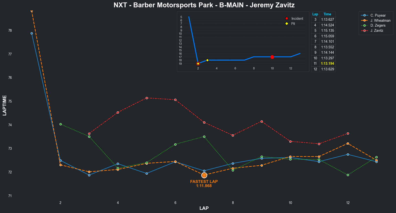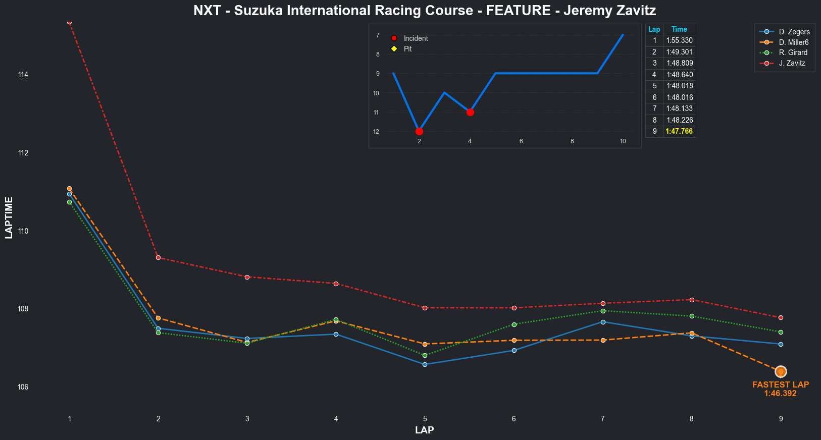 | Jeremy Zavitz | 7 | 7 | 1:55.3301 | 1:49.3013 | 1:48.8089 | 1:48.6397 | 1:48.0180 | 1:48.0161 | 1:48.1331 | 1:48.2259 | 1:47.7659 | 0 | 9 | |