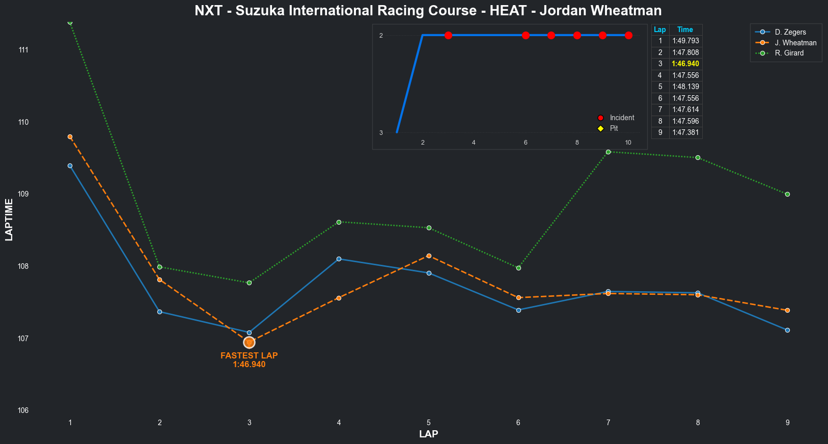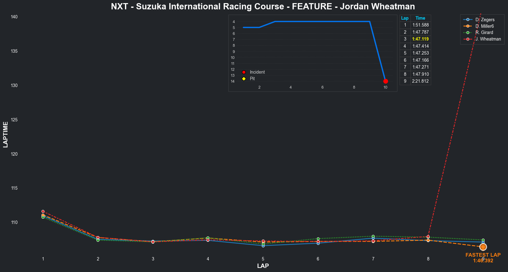 | Jordan Wheatman | 14 | 7 | 1:51.5877 | 1:47.7868 | 1:47.1193 | 1:47.4137 | 1:47.2531 | 1:47.1660 | 1:47.2713 | 1:47.9102 | 2:21.8121 | 0 | 9 | |