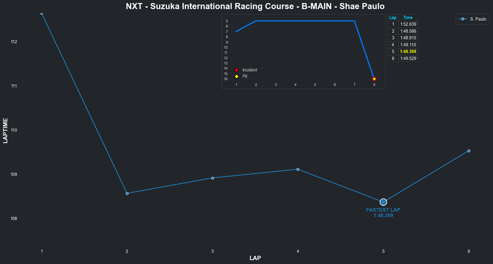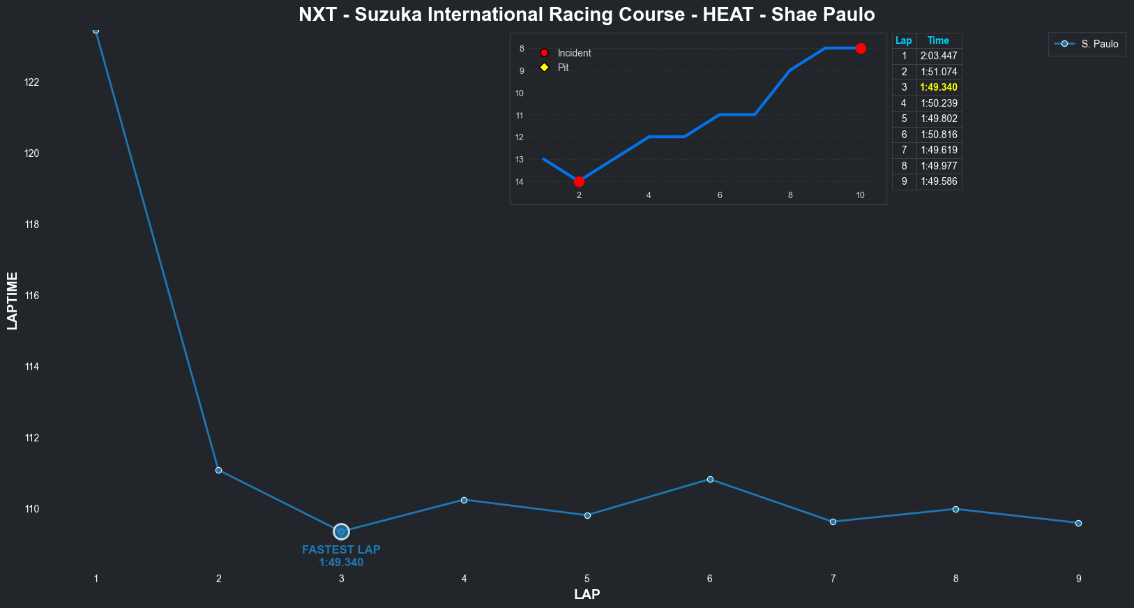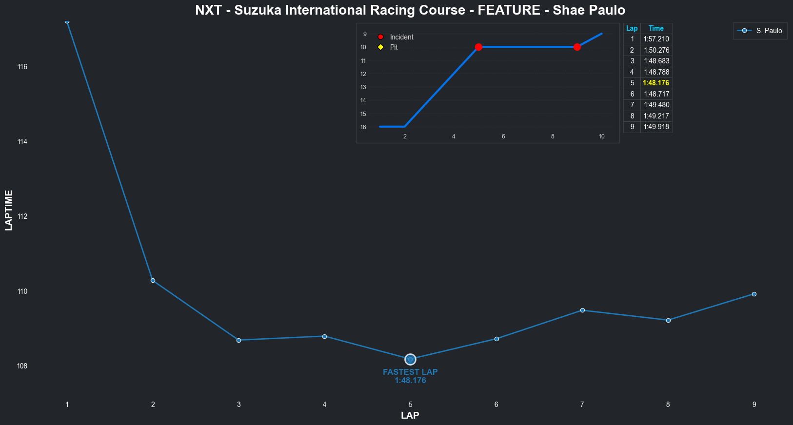 | Shae Paulo | 9 | 5 | 1:57.2097 | 1:50.2765 | 1:48.6825 | 1:48.7881 | 1:48.1759 | 1:48.7172 | 1:49.4804 | 1:49.2170 | 1:49.9178 | 0 | None | 9 |