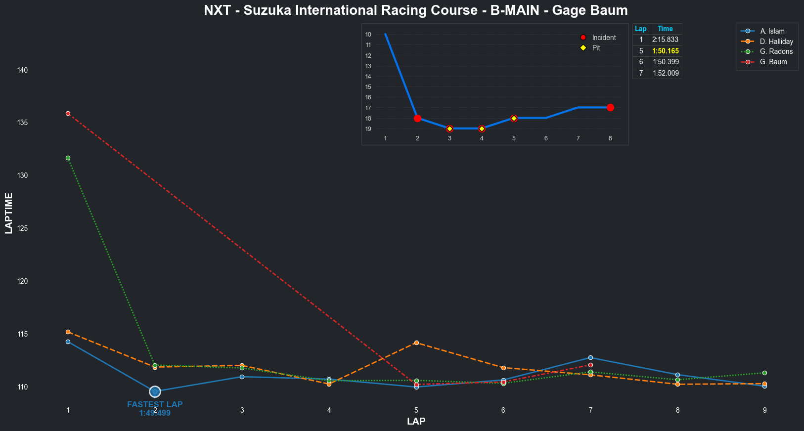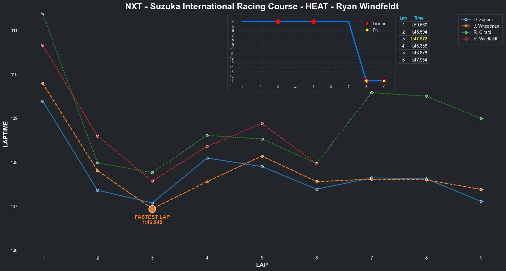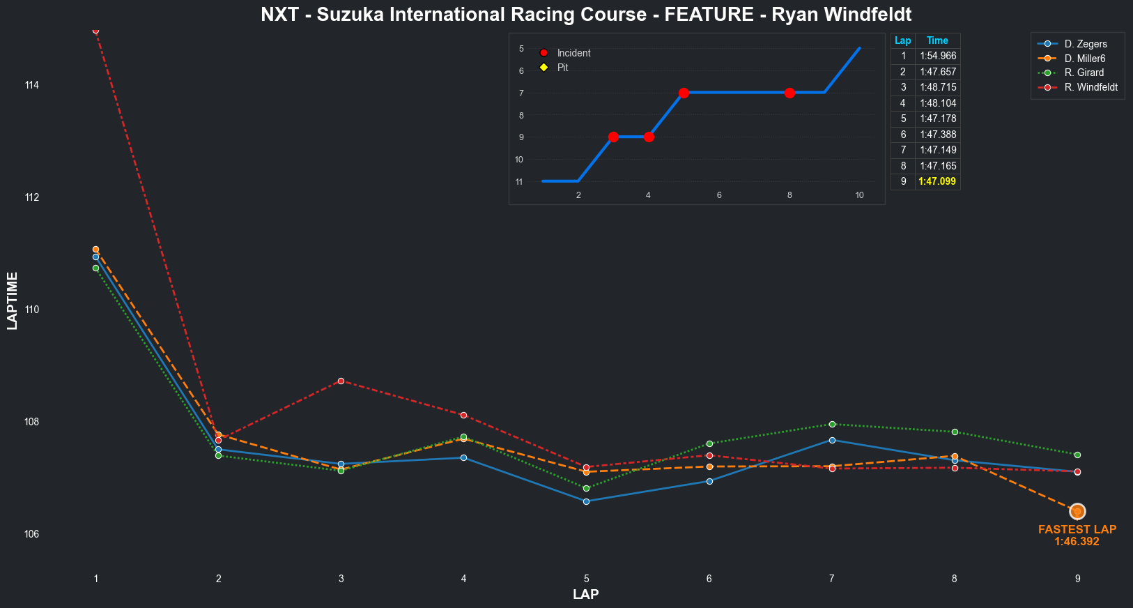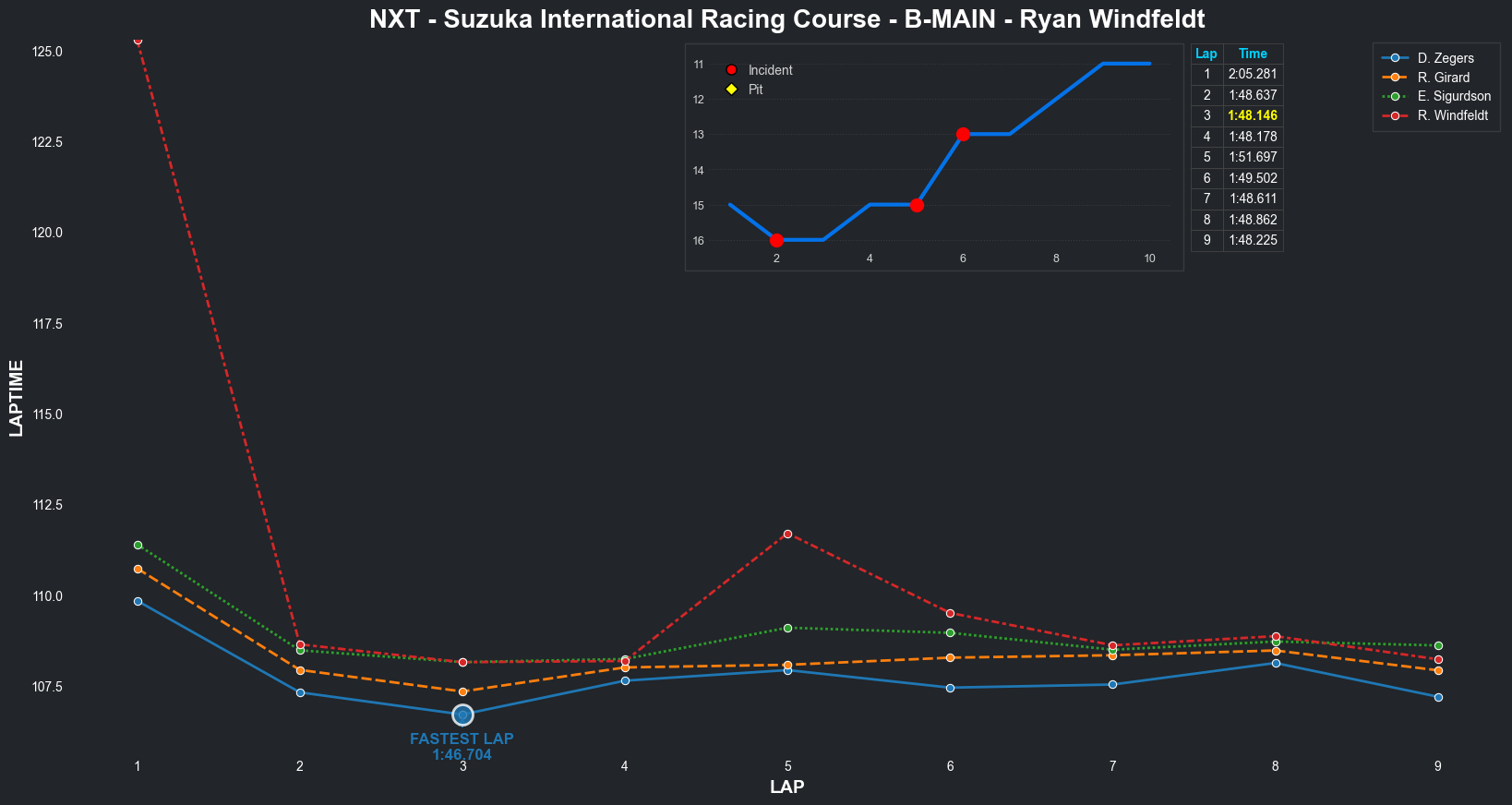 | Ryan Windfeldt | 5 | 7 | 1:54.9661 | 1:47.6568 | 1:48.7152 | 1:48.1043 | 1:47.1780 | 1:47.3875 | 1:47.1489 | 1:47.1646 | 1:47.0990 | 0 | 9 | |