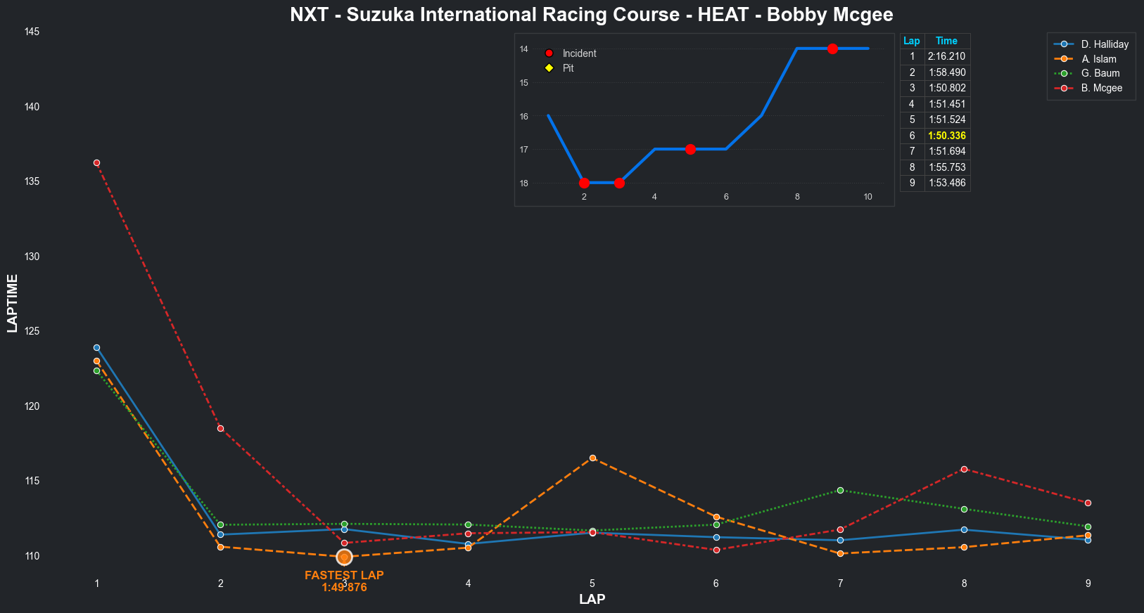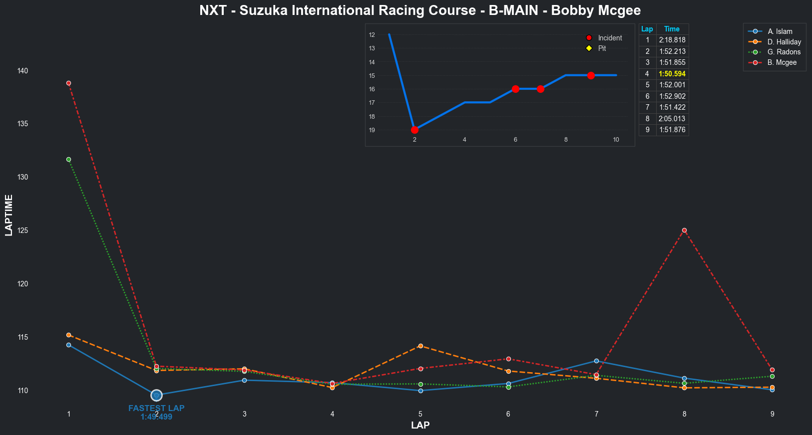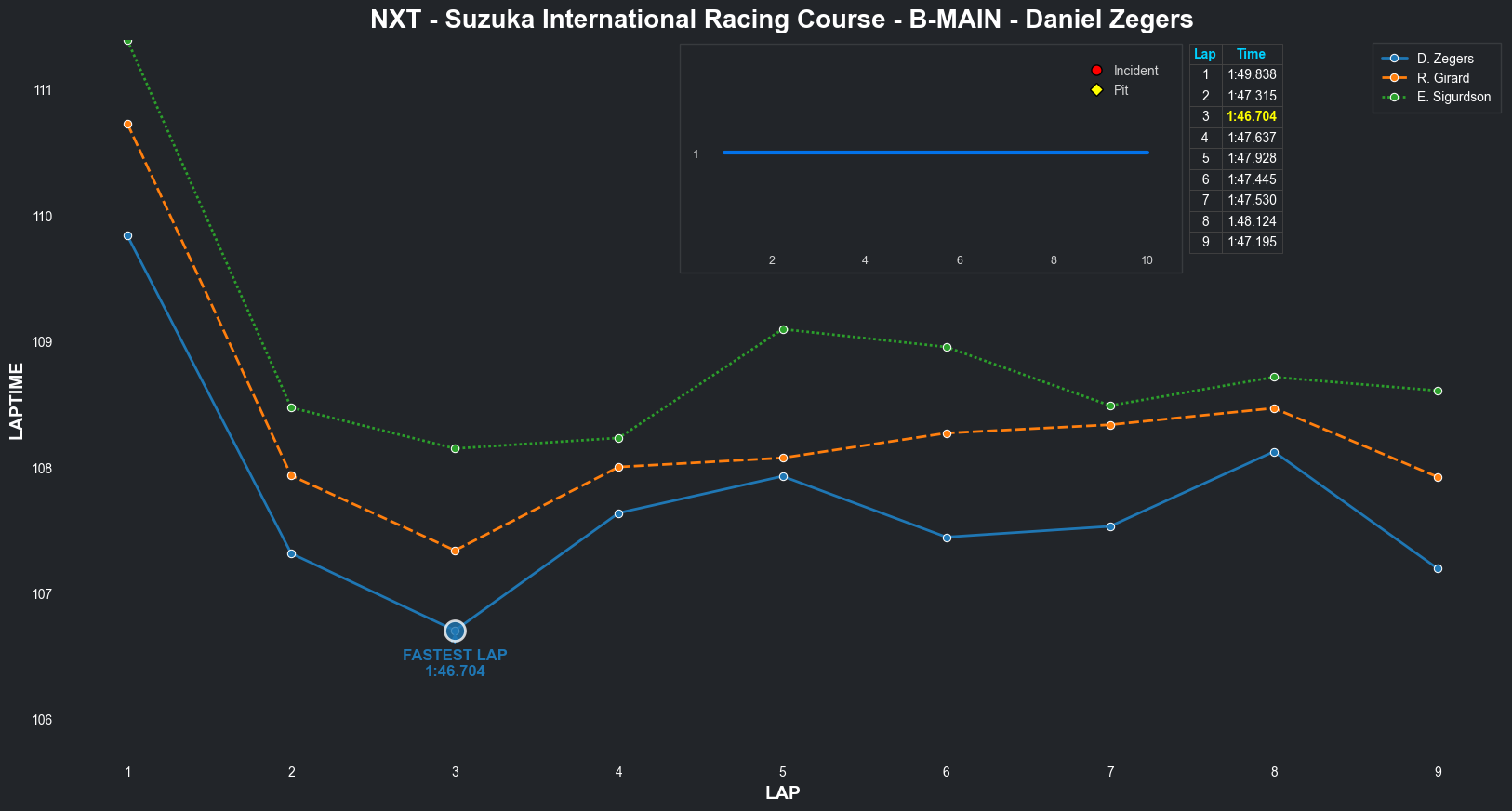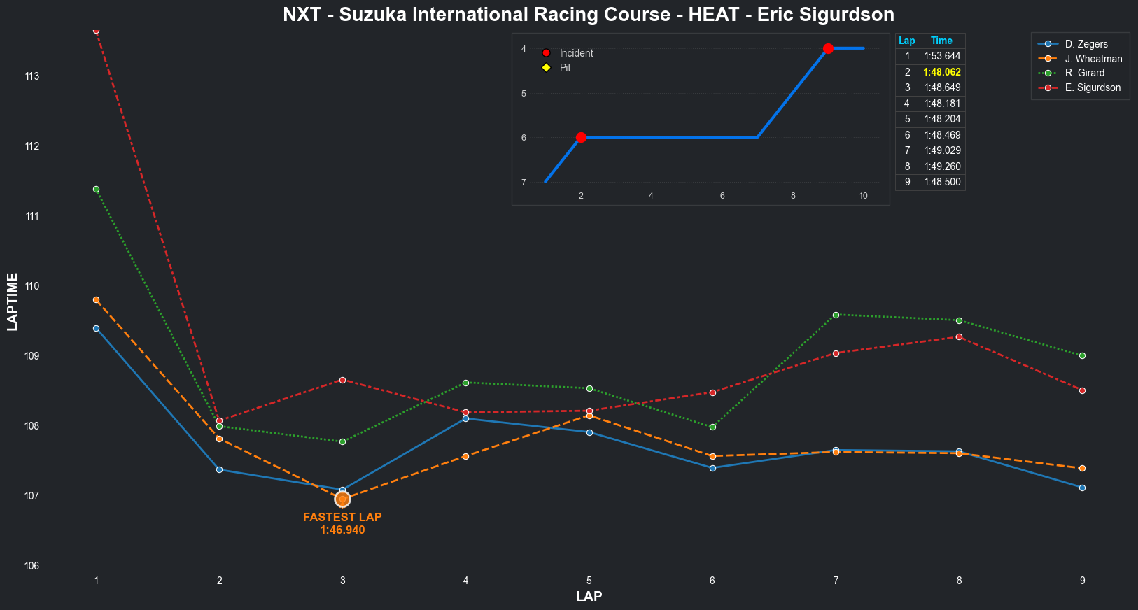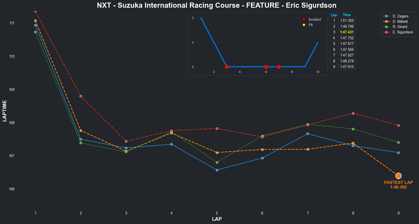 | Eric Sigurdson | 4 | 7 | 1:51.3548 | 1:48.7959 | 1:47.4315 | 1:47.7520 | 1:47.8175 | 1:47.5637 | 1:47.9267 | 1:48.2781 | 1:47.9150 | 0 | 9 | |