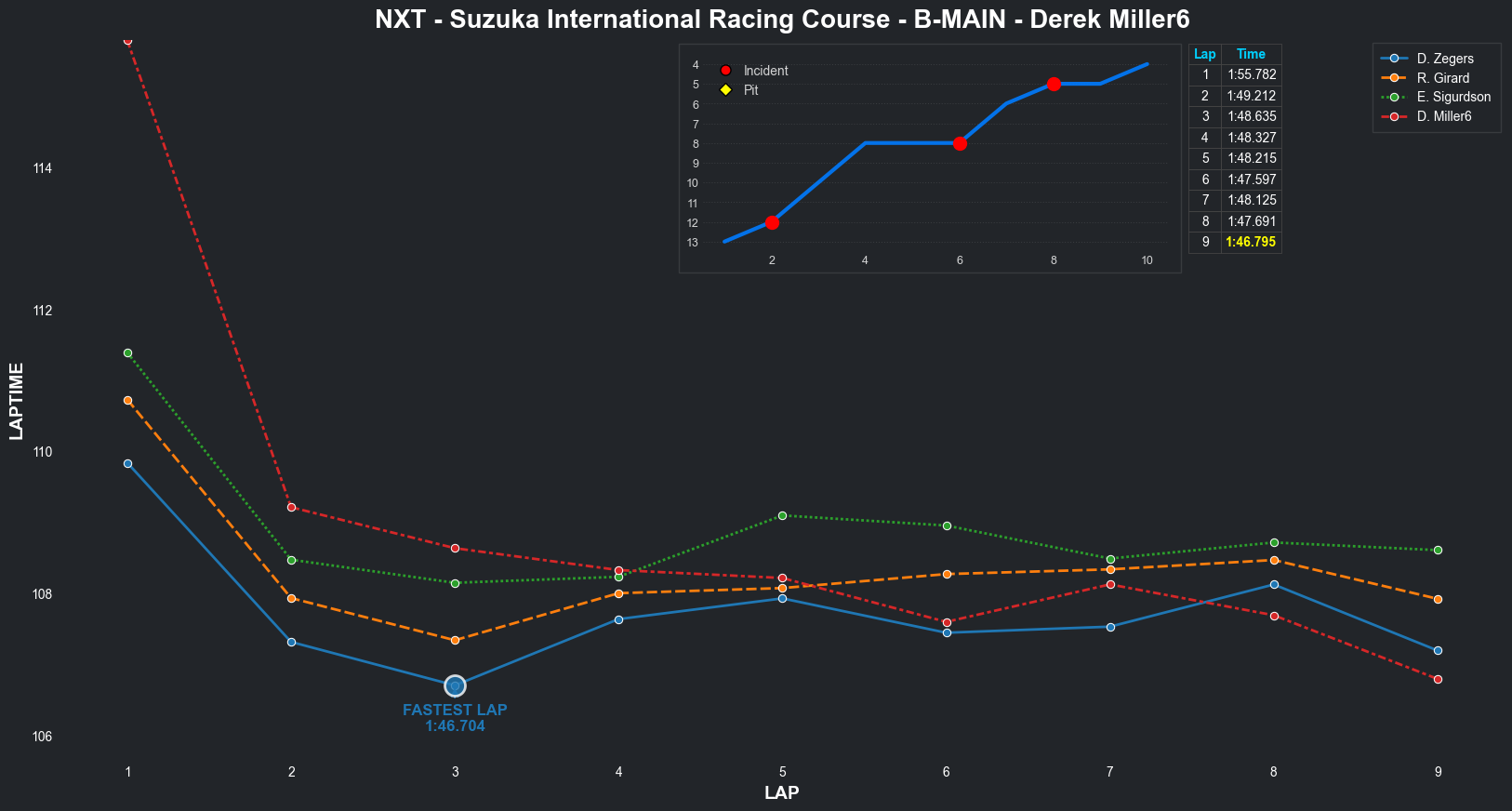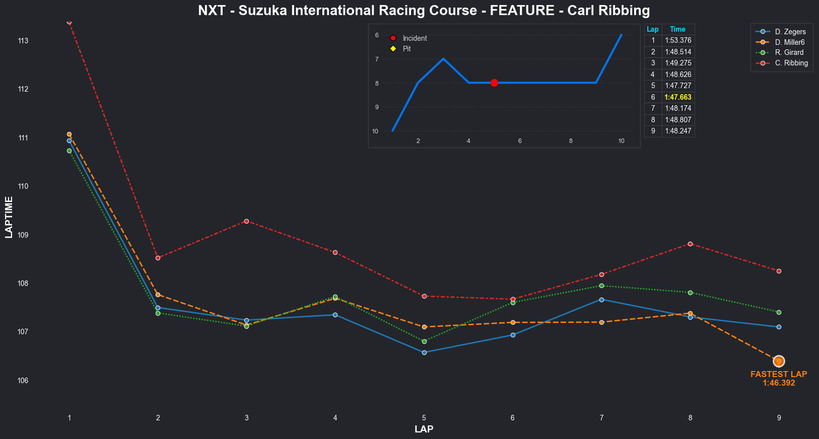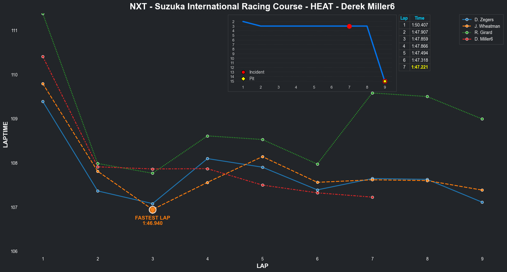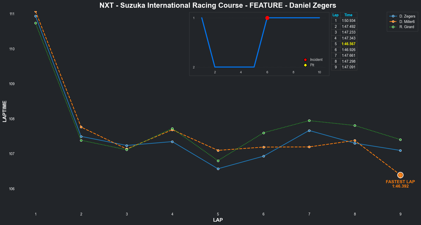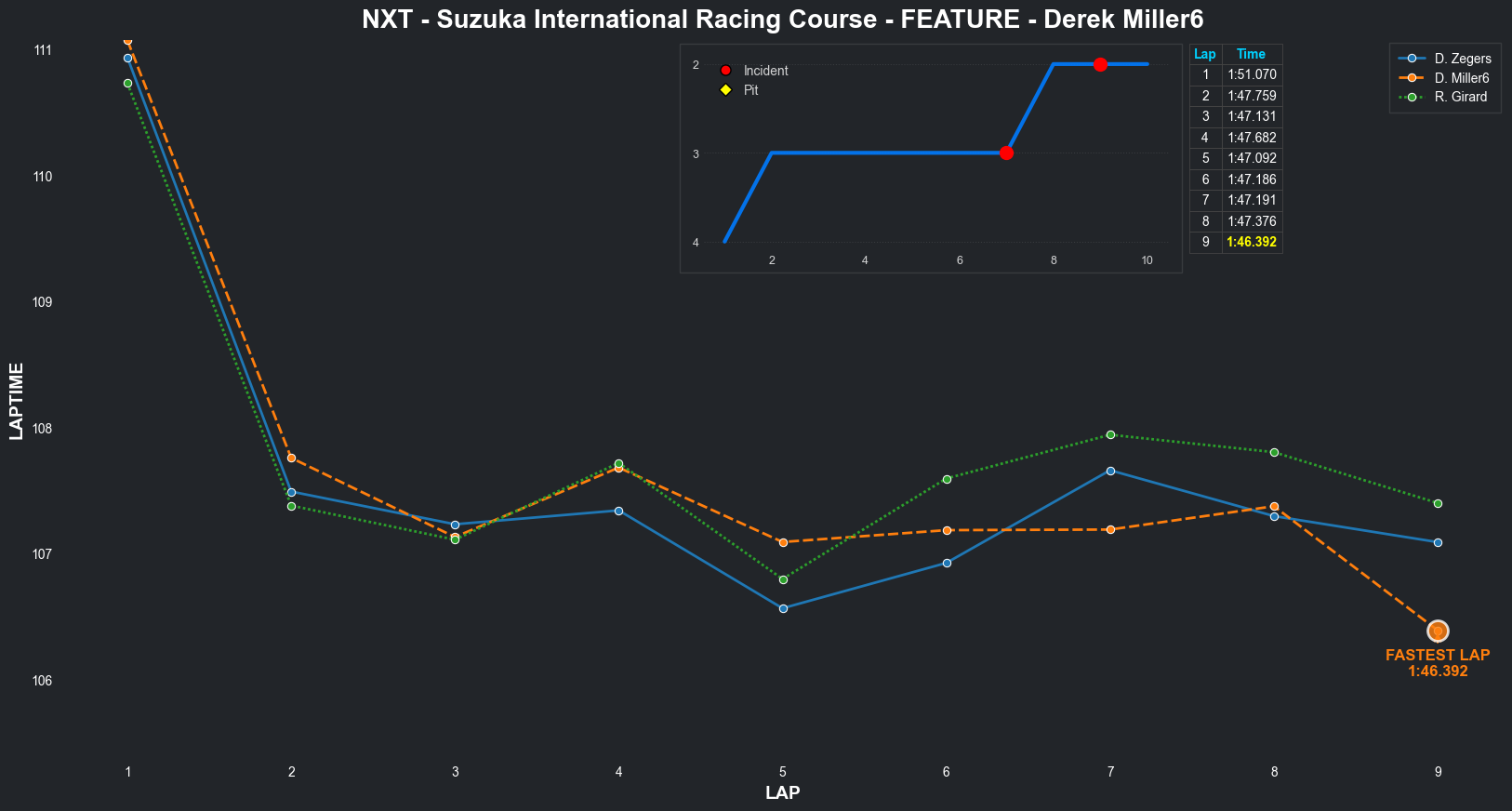 | Derek Miller6 | 2 | 6 | 1:51.0699 | 1:47.7589 | 1:47.1313 | 1:47.6823 | 1:47.0920 | 1:47.1860 | 1:47.1907 | 1:47.3758 | 1:46.3918 | 0 | 9 | |