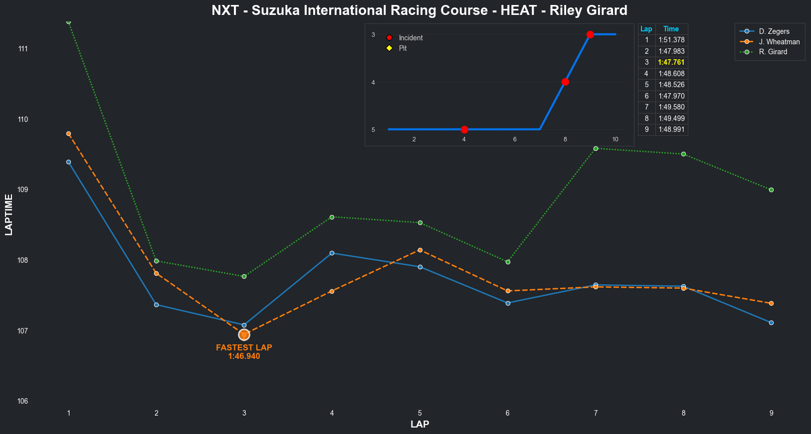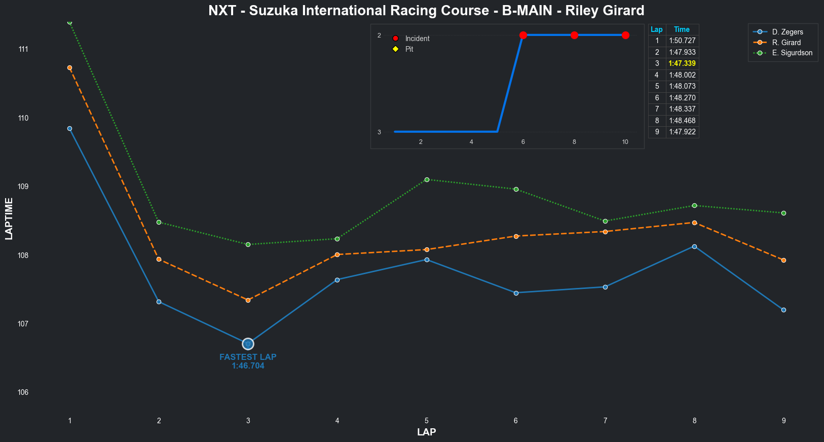 | Riley Girard | 3 | 7 | 1:50.7304 | 1:47.3810 | 1:47.1102 | 1:47.7194 | 1:46.7987 | 1:47.5953 | 1:47.9425 | 1:47.8045 | 1:47.4009 | 0 | 9 | |