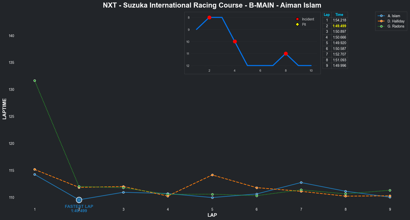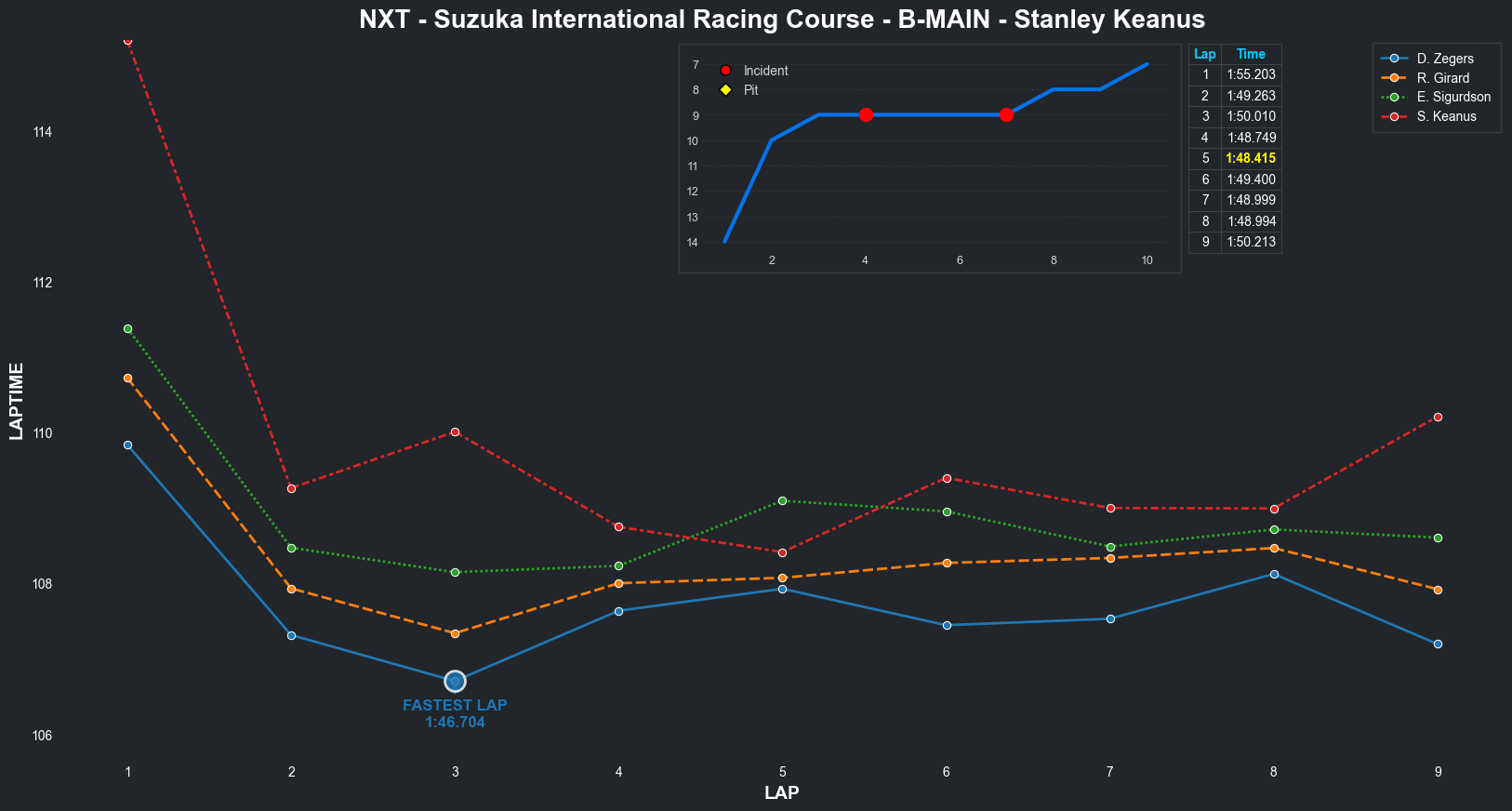 | Stanley Keanus | 11 | 1 | 1:54.8254 | 1:58.5459 | 1:48.8500 | 1:49.2421 | 1:49.0113 | 1:48.7382 | 1:49.9456 | 1:48.7397 | 1:47.5936 | 0 | 9 | |