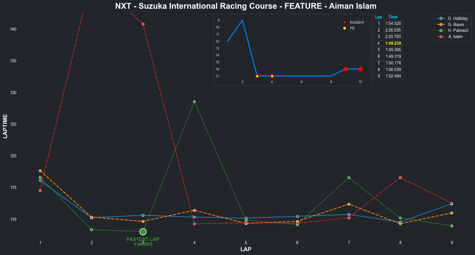| Aiman Islam | 16 | 4 | 1:54.5195 | 2:28.0354 | 2:20.7928 | 1:49.2385 | 1:49.3949 | 1:49.3192 | 1:50.1761 | 1:56.5392 | 1:52.4836 | 0 | 9 | |