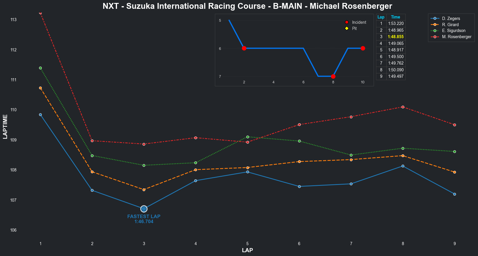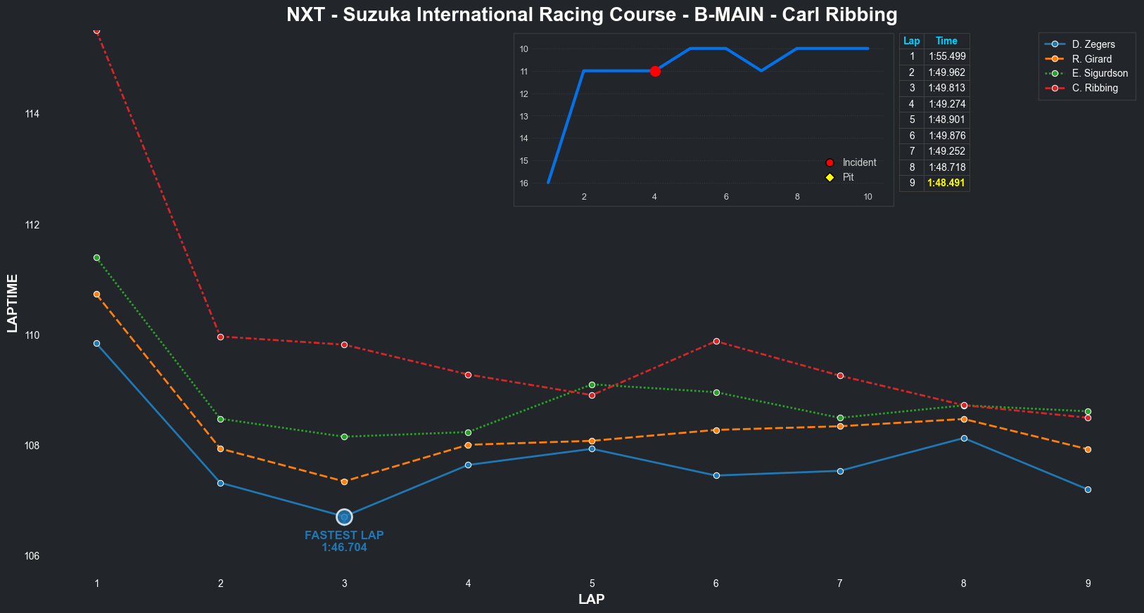 | Carl Ribbing | 6 | 6 | 1:53.3764 | 1:48.5144 | 1:49.2755 | 1:48.6262 | 1:47.7272 | 1:47.6632 | 1:48.1735 | 1:48.8066 | 1:48.2470 | 0 | 9 | |