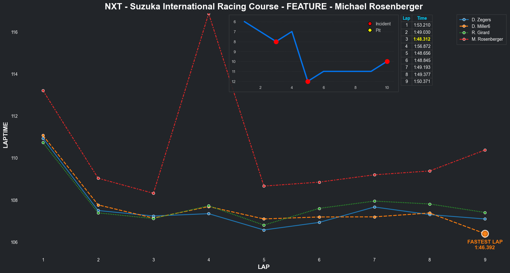 | Michael Rosenberger | 10 | 6 | 1:53.2104 | 1:49.0302 | 1:48.3119 | 1:56.8718 | 1:48.6564 | 1:48.8454 | 1:49.1930 | 1:49.3772 | 1:50.3712 | 0 | 9 | |