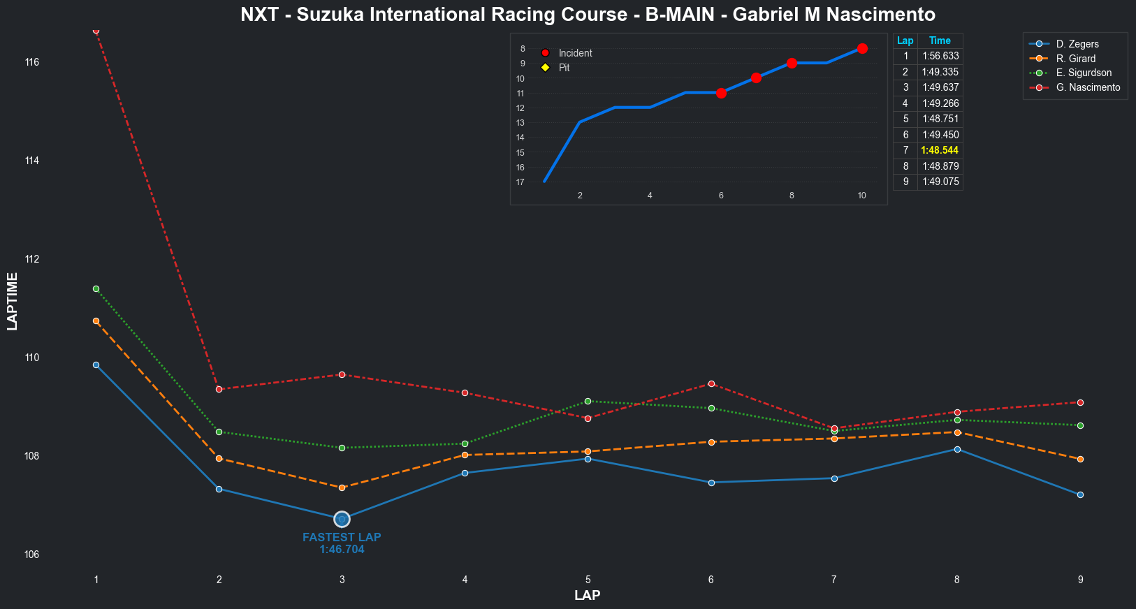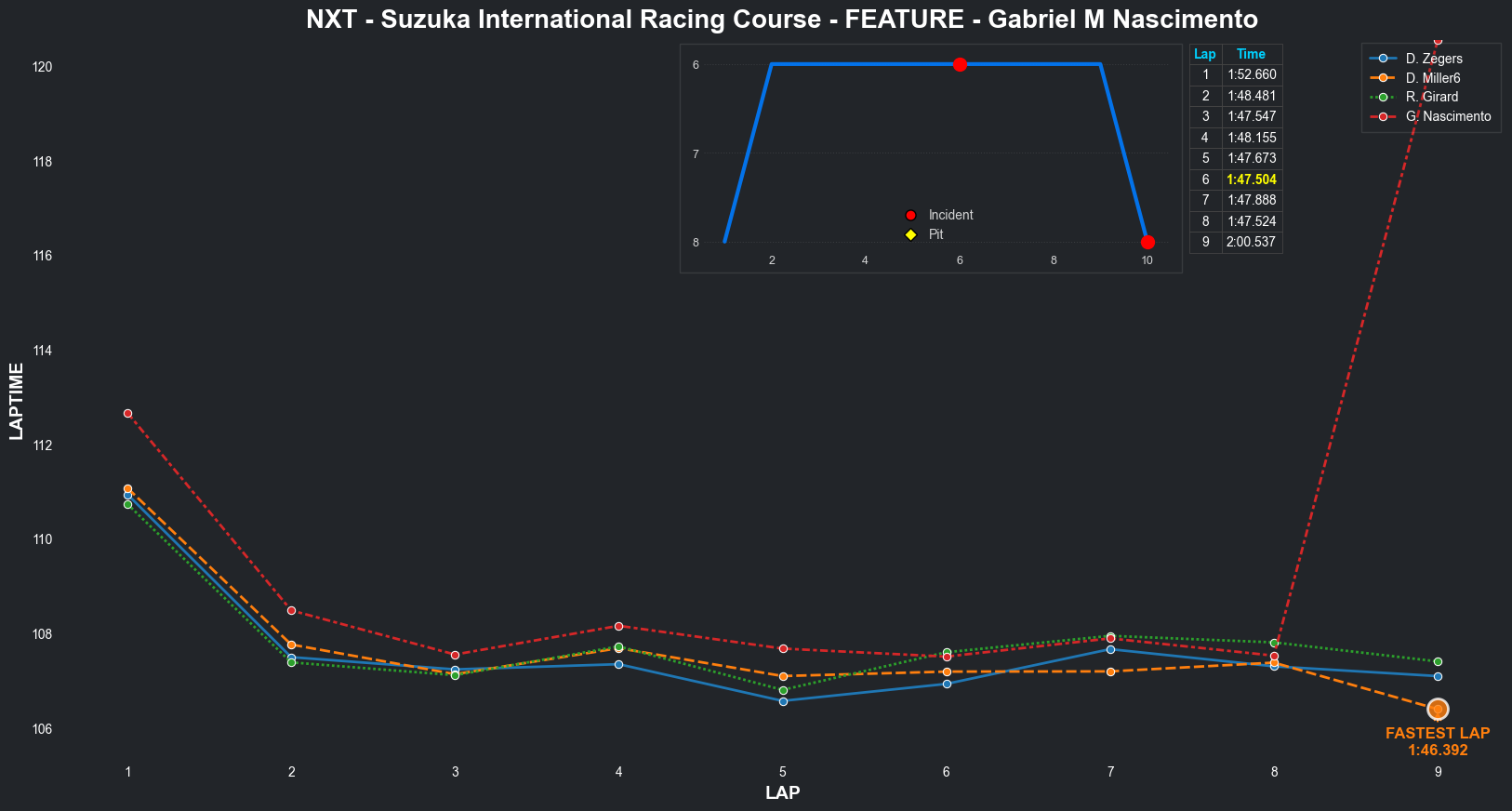 | Gabriel M Nascimento | 8 | 7 | 1:52.6605 | 1:48.4807 | 1:47.5474 | 1:48.1554 | 1:47.6732 | 1:47.5036 | 1:47.8884 | 1:47.5237 | 2:00.5374 | 0 | 9 | |