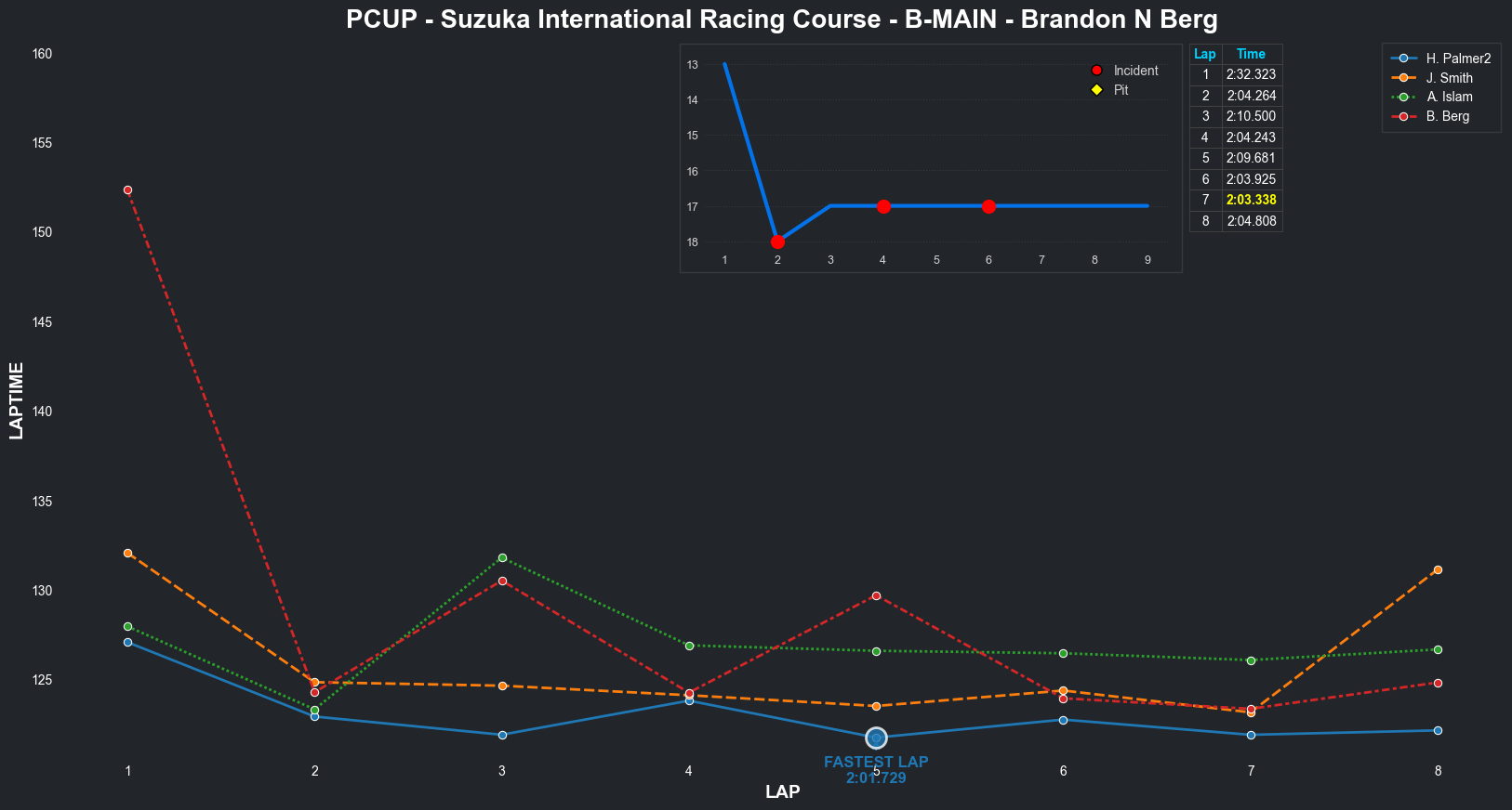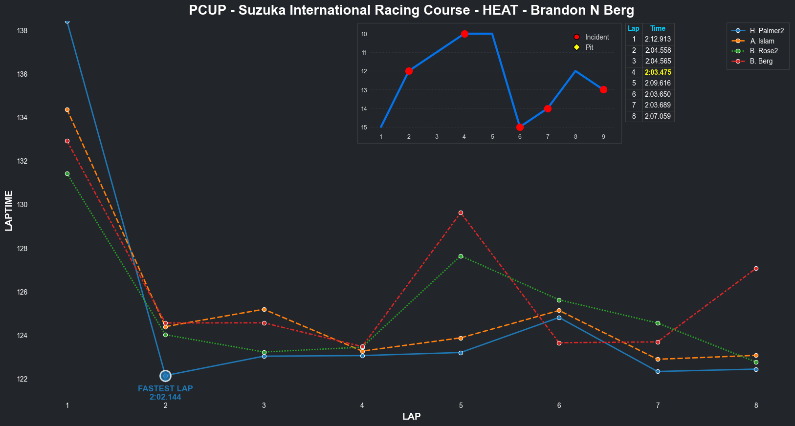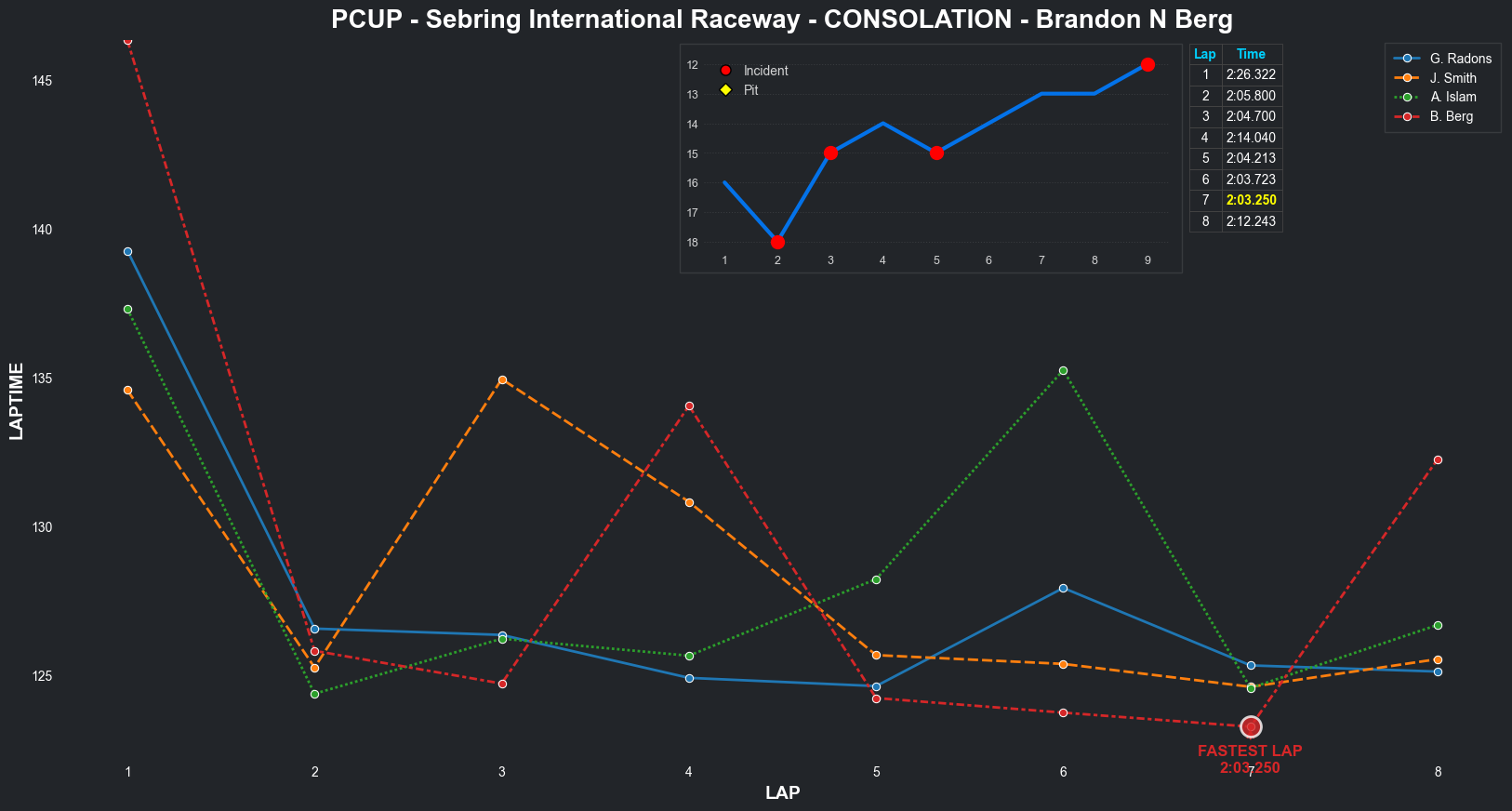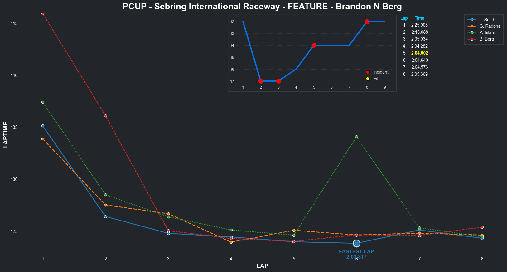 | Brandon N Berg | 17 | 4 | 2:32.3235 | 2:04.2637 | 2:10.4997 | 2:04.2431 | 2:09.6808 | 2:03.9250 | 2:03.3379 | 2:04.8084 | 0 | 8 |