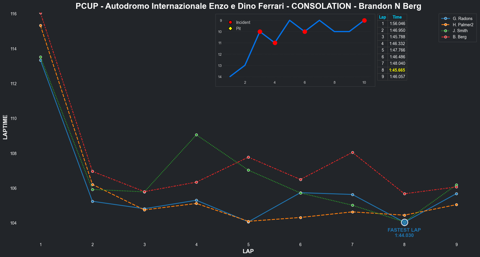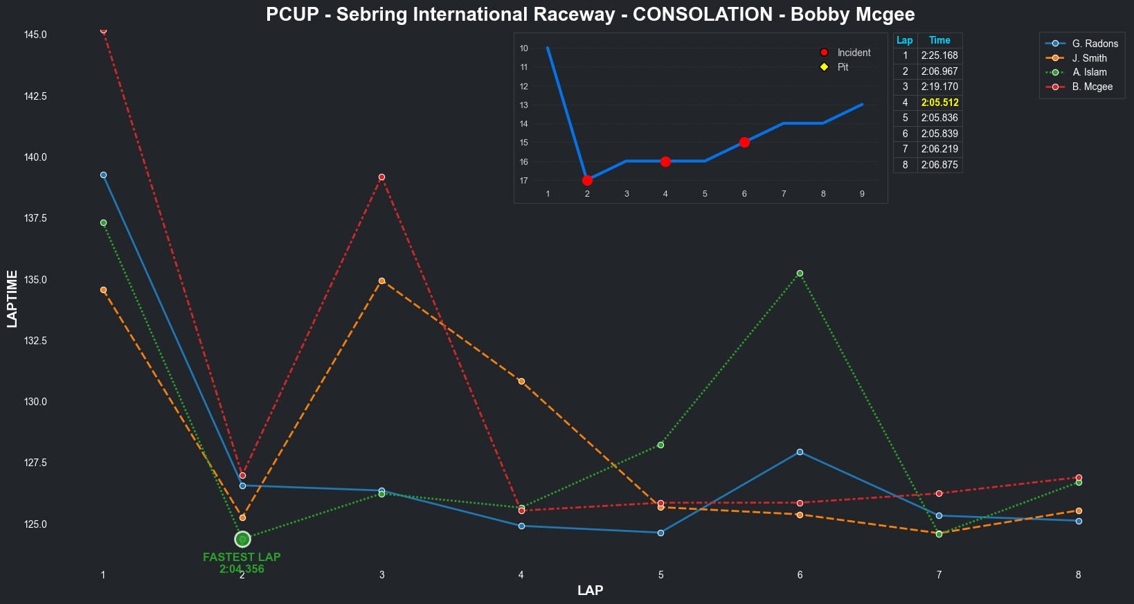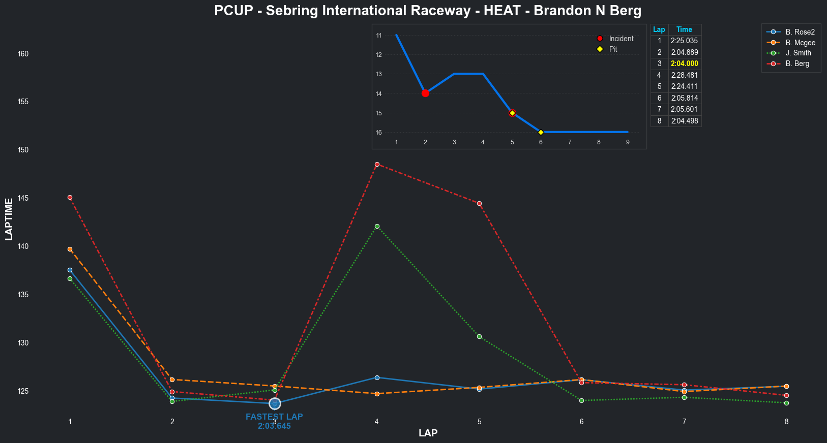 | Brandon N Berg | 17 | 4 | 2:32.3235 | 2:04.2637 | 2:10.4997 | 2:04.2431 | 2:09.6808 | 2:03.9250 | 2:03.3379 | 2:04.8084 | 0 | 8 |