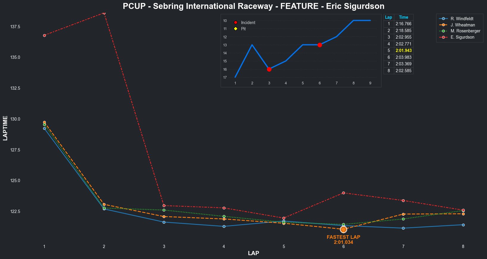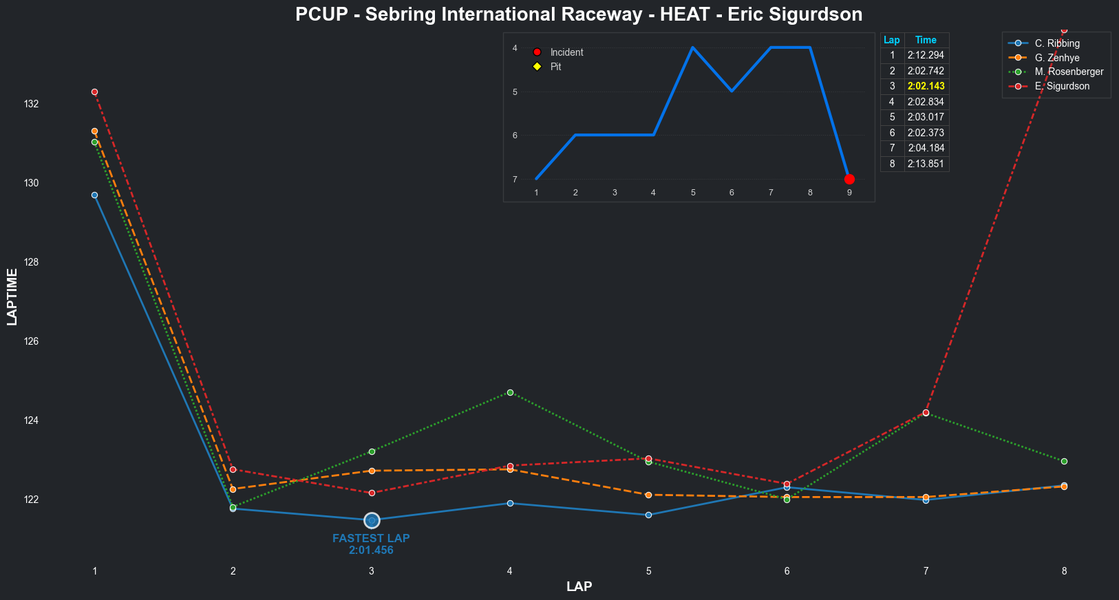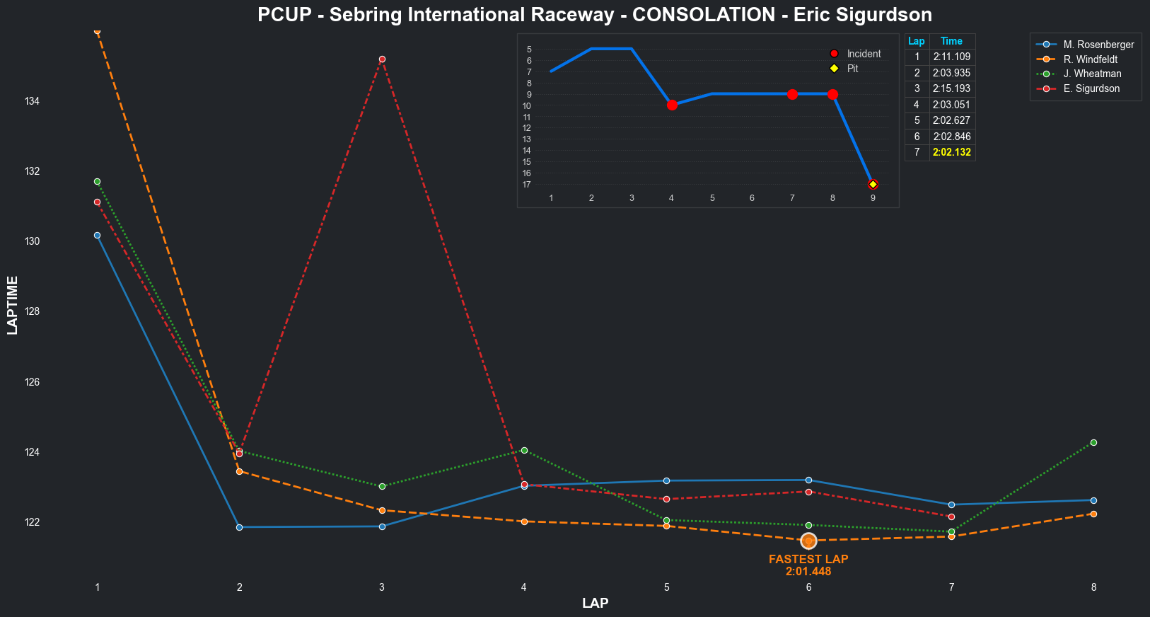 | Eric Sigurdson | 7 | 5 | 2:12.2945 | 2:02.7416 | 2:02.1429 | 2:02.8340 | 2:03.0167 | 2:02.3734 | 2:04.1839 | 2:13.8515 | 0 | 8 | |