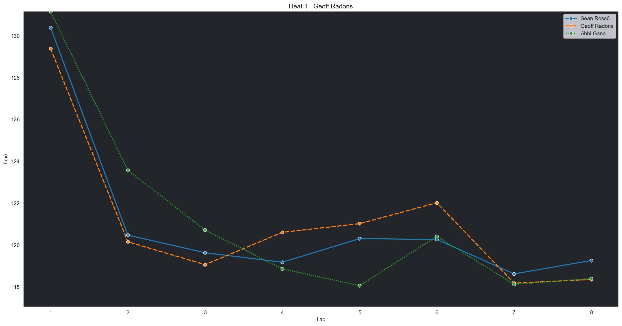 | Geoff Radons | 8 | 3 | 2:09.3885 | 2:00.1595 | 1:59.0670 | 2:00.6112 | 2:01.0248 | 2:02.0233 | 1:58.1839 | 1:58.3588 | 0 |