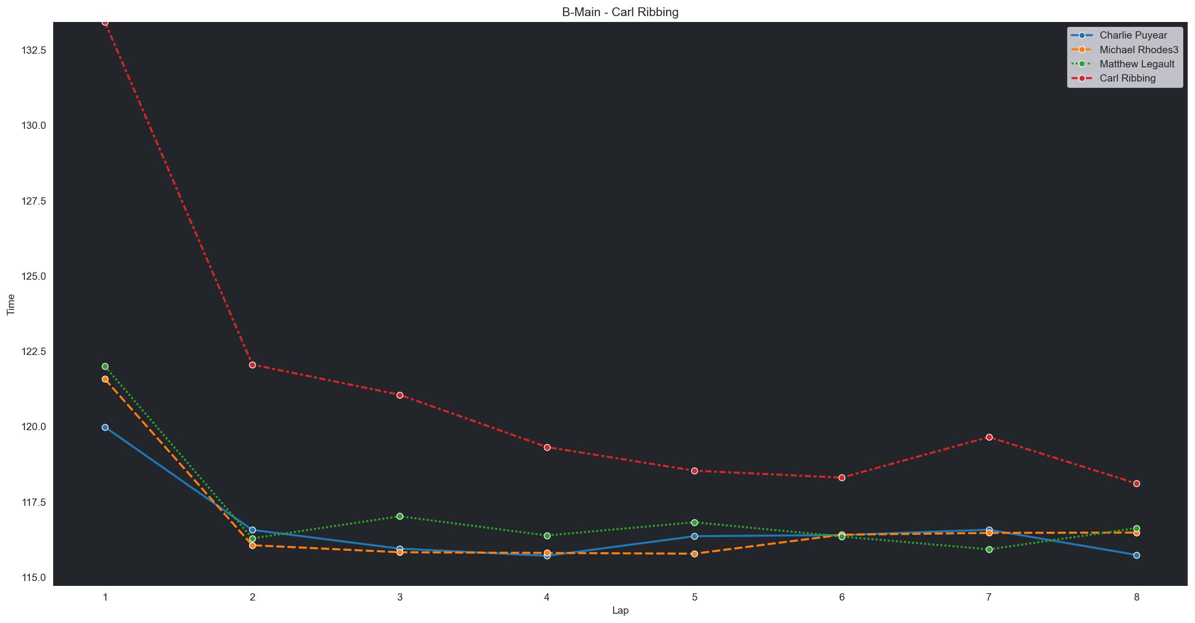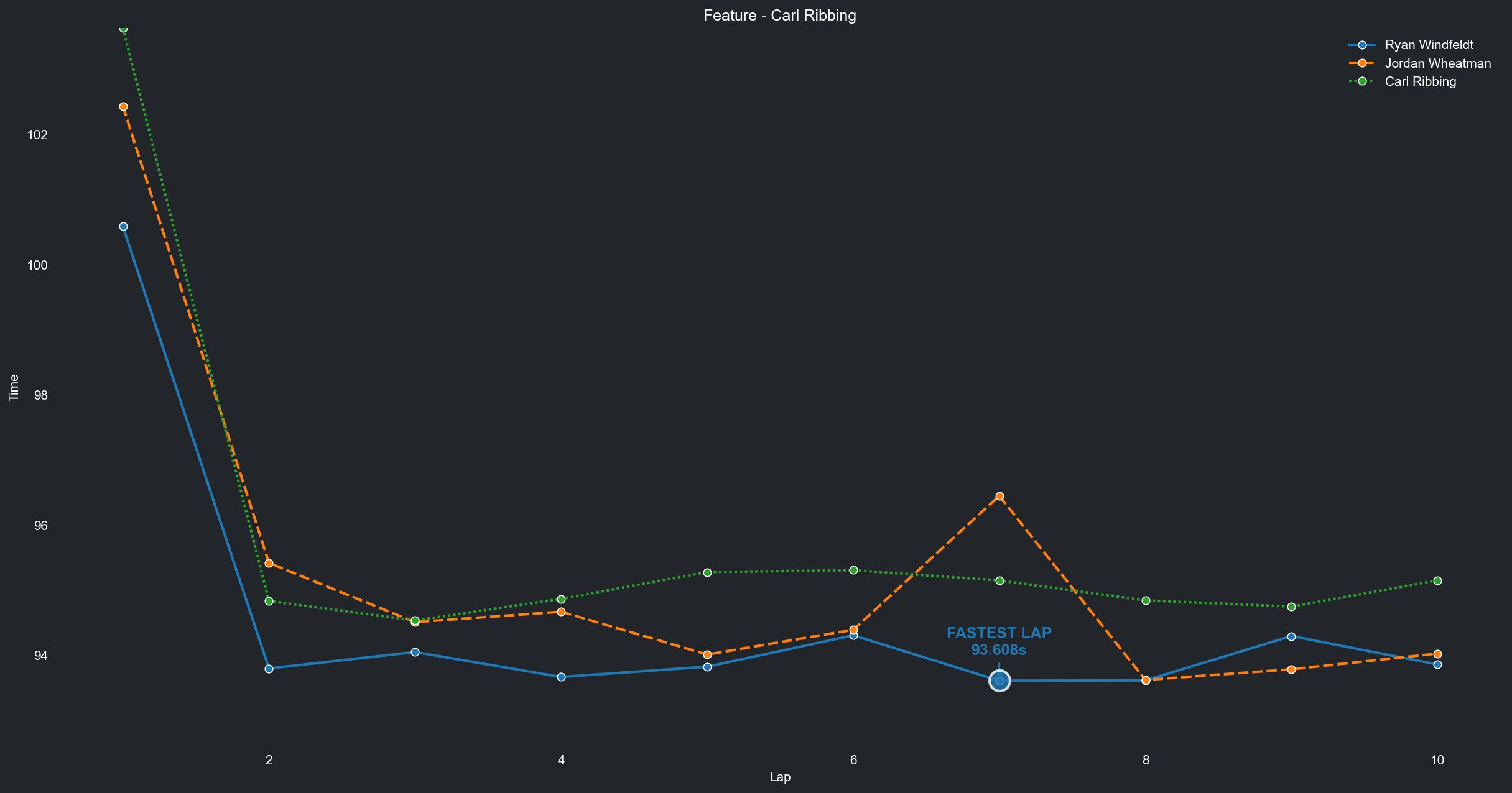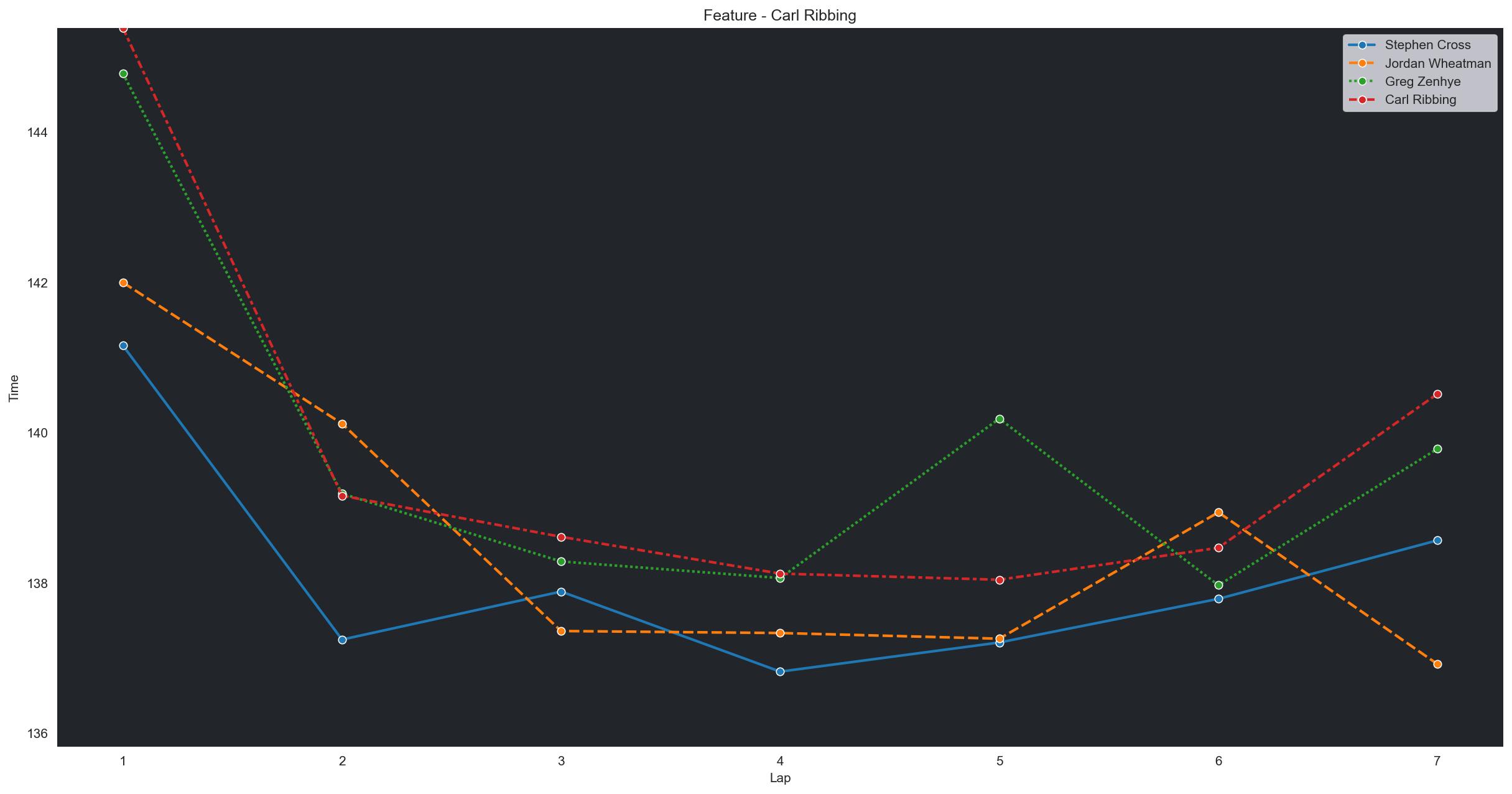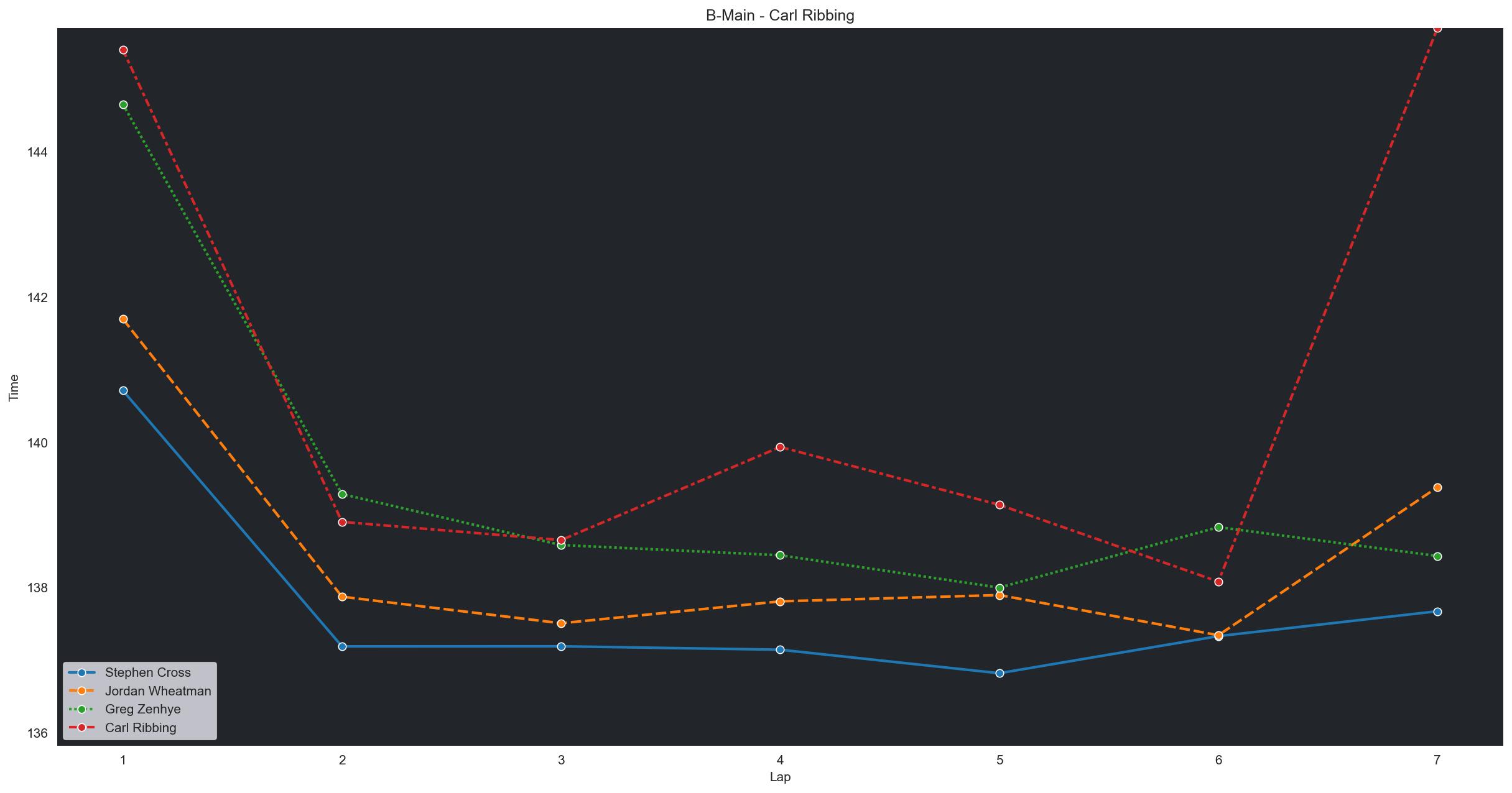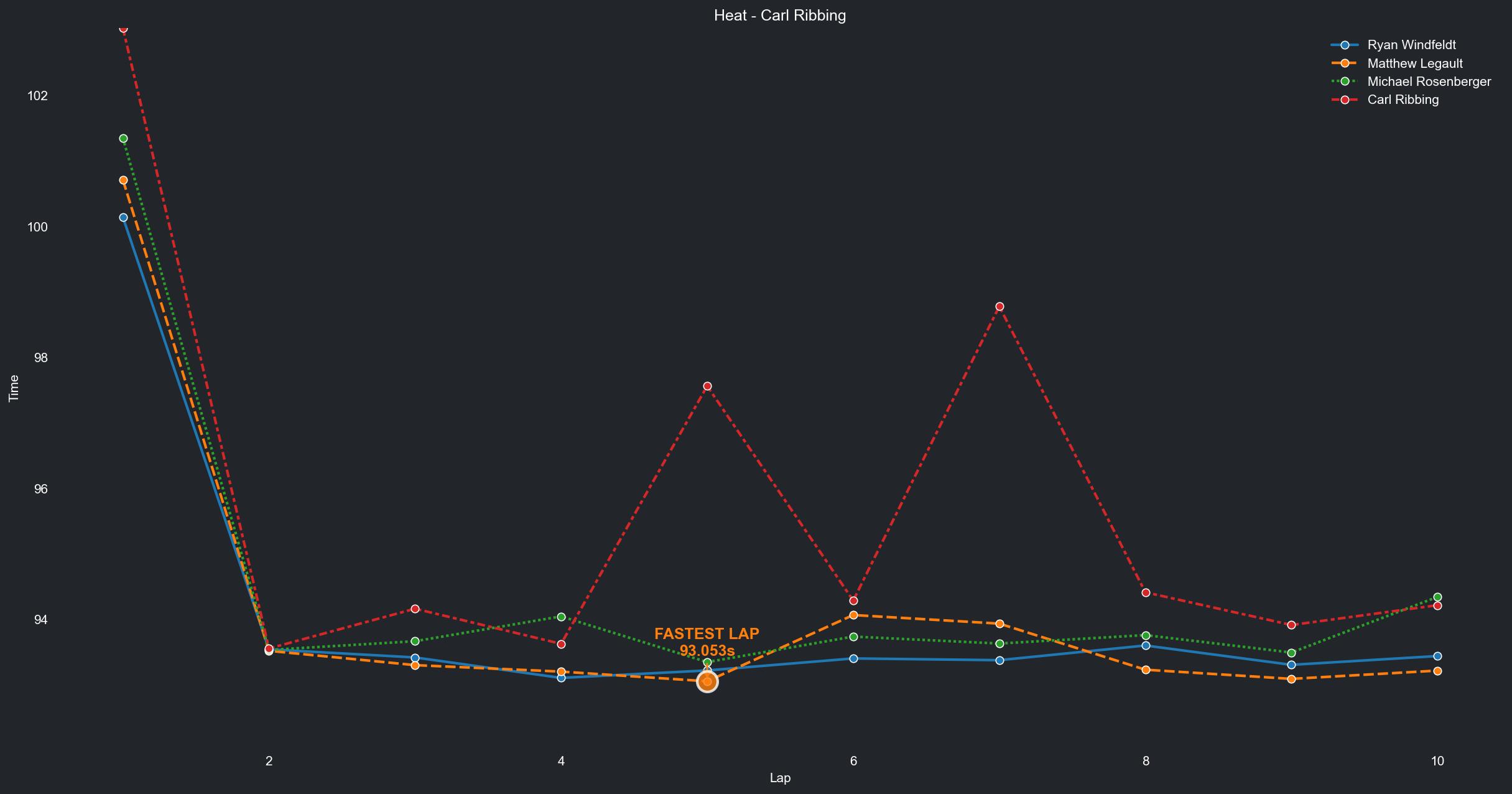 | Carl Ribbing | 3 | 9 | 1:43.6351 | 1:34.8329 | 1:34.5336 | 1:34.8659 | 1:35.2765 | 1:35.3061 | 1:35.1487 | 1:34.8417 | 1:34.7472 | 1:35.1496 | 0 |