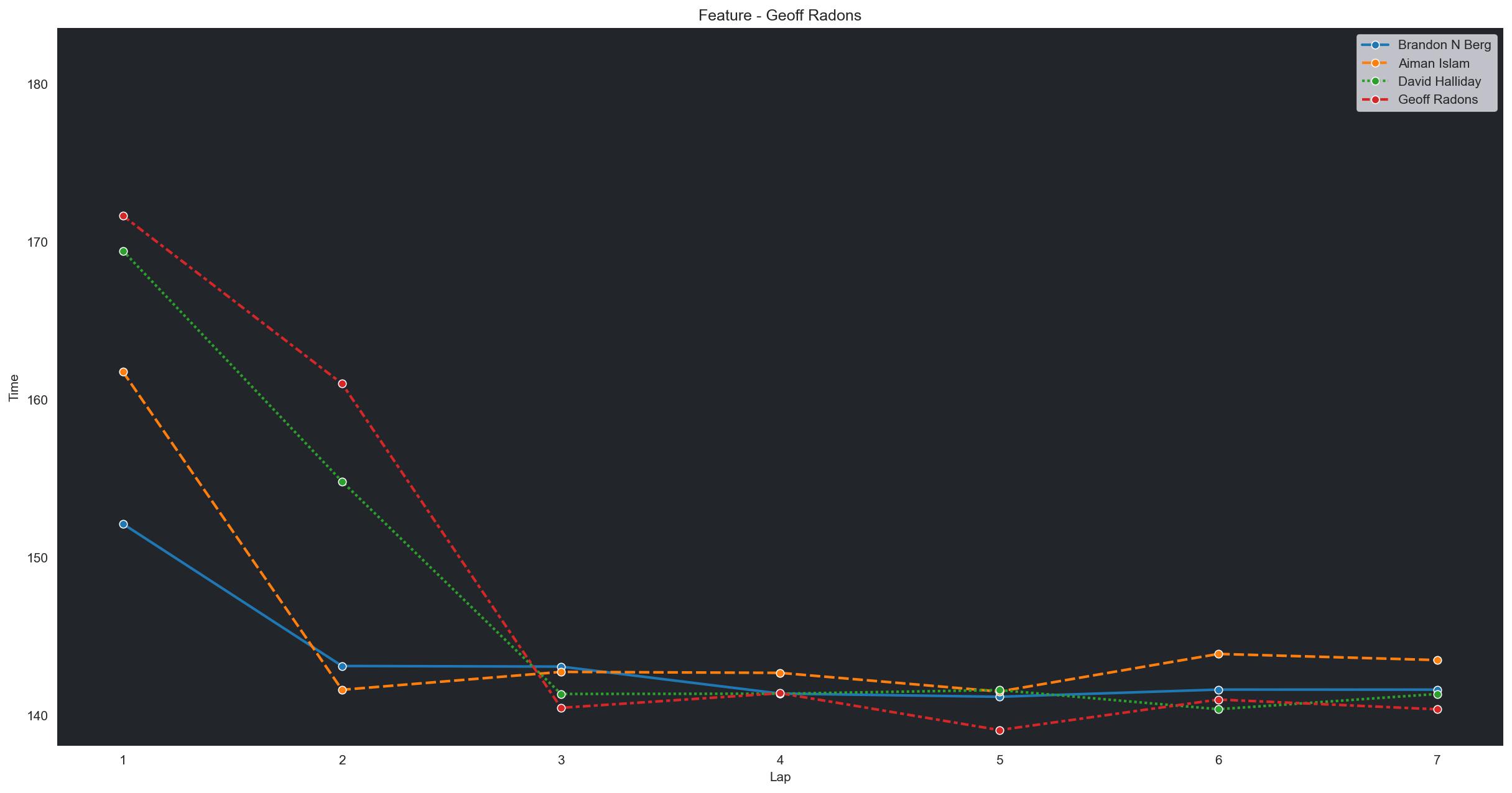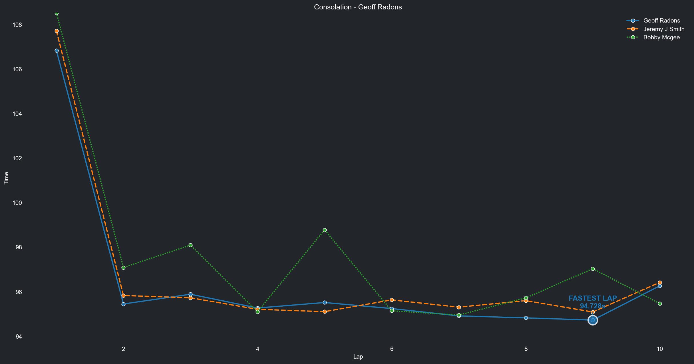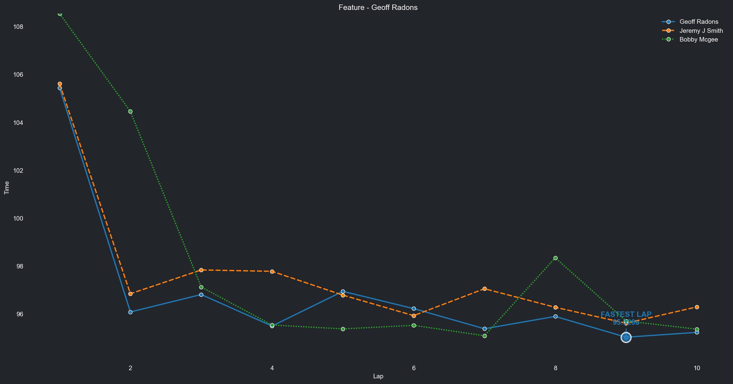 | Geoff Radons | 7 | 5 | 1:45.4405 | 1:36.0825 | 1:36.8100 | 1:35.4950 | 1:36.9434 | 1:36.2236 | 1:35.3813 | 1:35.8966 | 1:35.0282 | 1:35.2304 | 0 |